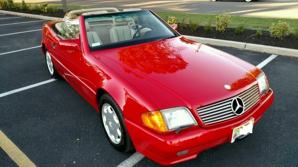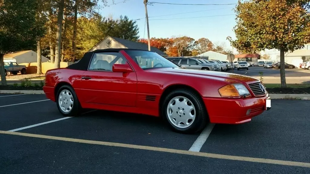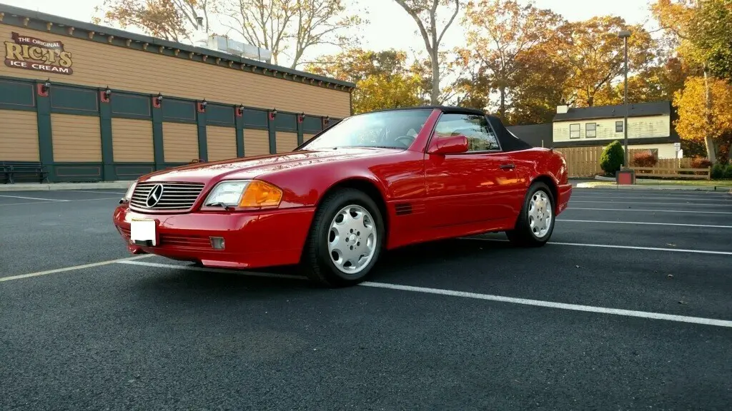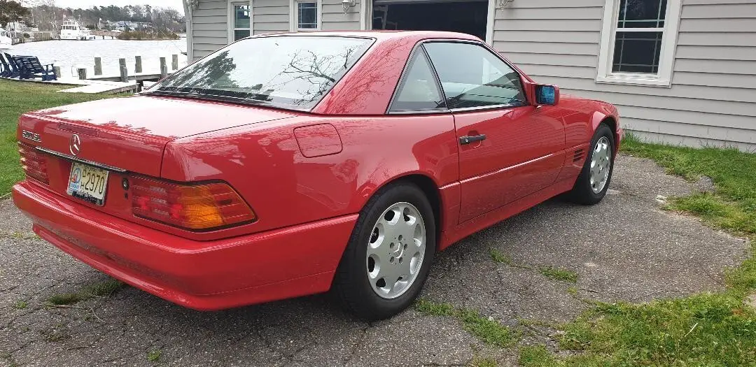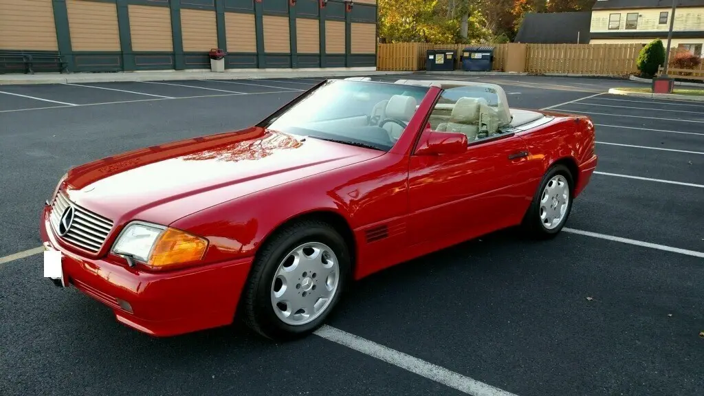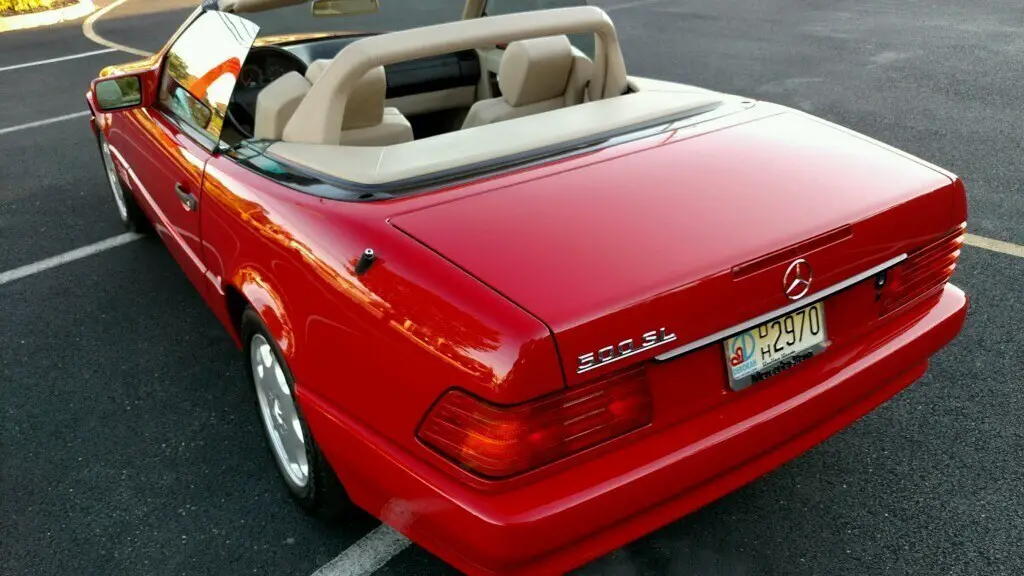 The 1993 Mercedes-Benz SL-Class is a classic convertible with a tan interior and red exterior. This 2-seater car has an automatic transmission, 8 cylinders, and a 5L engine size. It has safety features such as a driver & passenger airbags, power windows, cruise control, tilt steering wheel and power leather seats. Additionally, it includes blue tooth radio, a CD-changer, hard top, and alloy wheels. With only one previous owner and the original 56,500 miles on the odometer, this Mercedes-Benz SL-Class is a stylish and reliable choice for any car enthusiast. Garage kept since new, non-smoker, an original car with only 2 owners, this Mercedes-Benz SL-Class is sure to provide a comfortable and stylish drive.