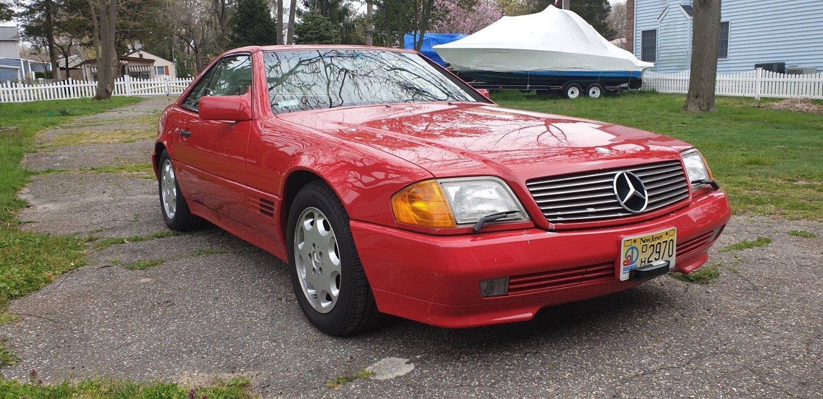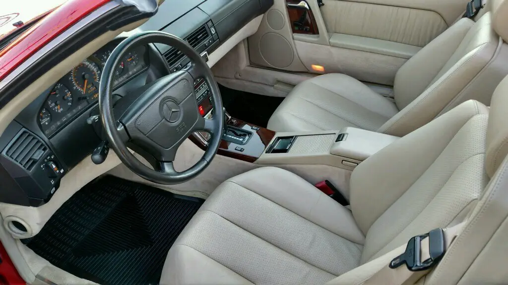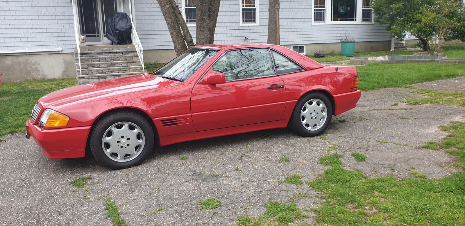 The 1993 Mercedes-Benz SL-Class is a classic convertible with a tan interior and red exterior. This 2-seater car has an automatic transmission, 8 cylinders, and a 5L engine size. It has safety features such as a driver & passenger airbags, power windows, cruise control, tilt steering wheel and power leather seats. Additionally, it includes blue tooth radio, a CD-changer, hard top, and alloy wheels. With only one previous owner and the original 56,500 miles on the odometer, this Mercedes-Benz SL-Class is a stylish and reliable choice for any car enthusiast. Garage kept since new, non-smoker, an original car with only 2 owners, this Mercedes-Benz SL-Class is sure to provide a comfortable and stylish drive.