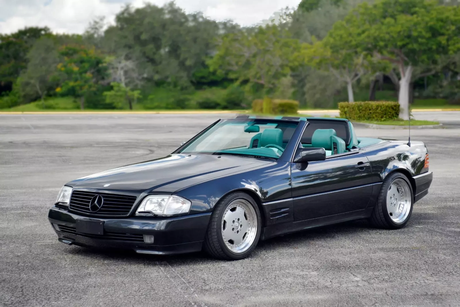 The exterior of this roadster presents incredibly and almost spotless all around. The body features AMG upgrades including de-chroming into a monotone sport appearance, AMG 3-piece Aero III wheels and a lowered suspension, giving it an impressive and muscular stance. Original convertible power soft top operates without issues and presents very well, acrylic rear windows have expected hazing and aging. Hard top is in excellent condition, matching the appearance of the car and sporting a matching bespoke leather headliner in green.