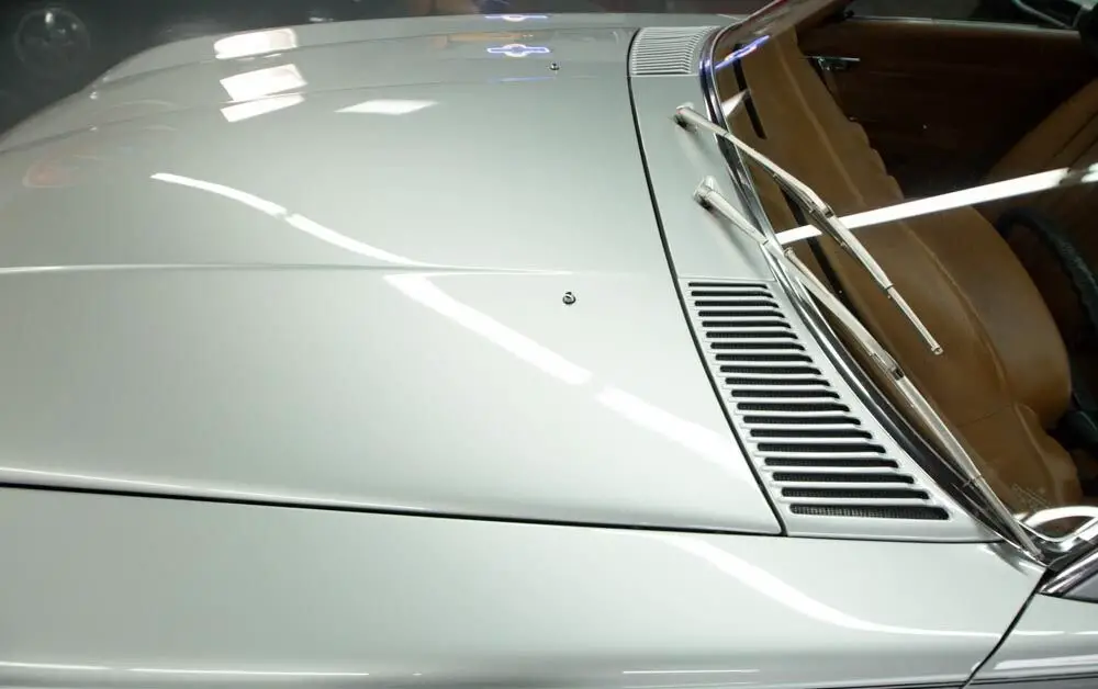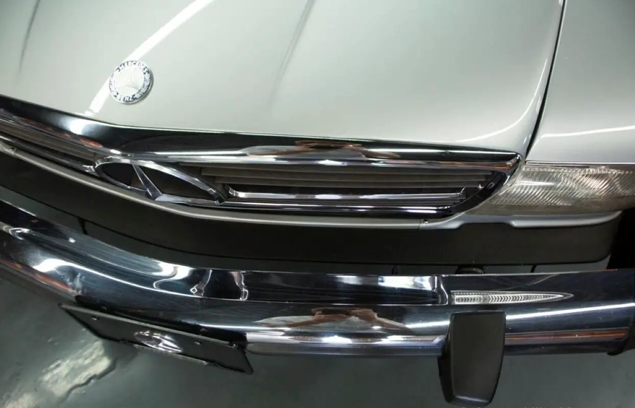 The Astral Silver exterior is in fantastic condition. As one can see in the photos, the paint has a brilliant gloss, deep shine, and smooth finish. Both doors open and shut nicely; it has that solid Mercedes touch and feels like a vault door closing. The car exhibits very nice body panel fit overall. The chrome and other bright-work look very nice. The original alloy wheels are in great shape with no curb rash. This car was always stored indoor and hasno rustissues.