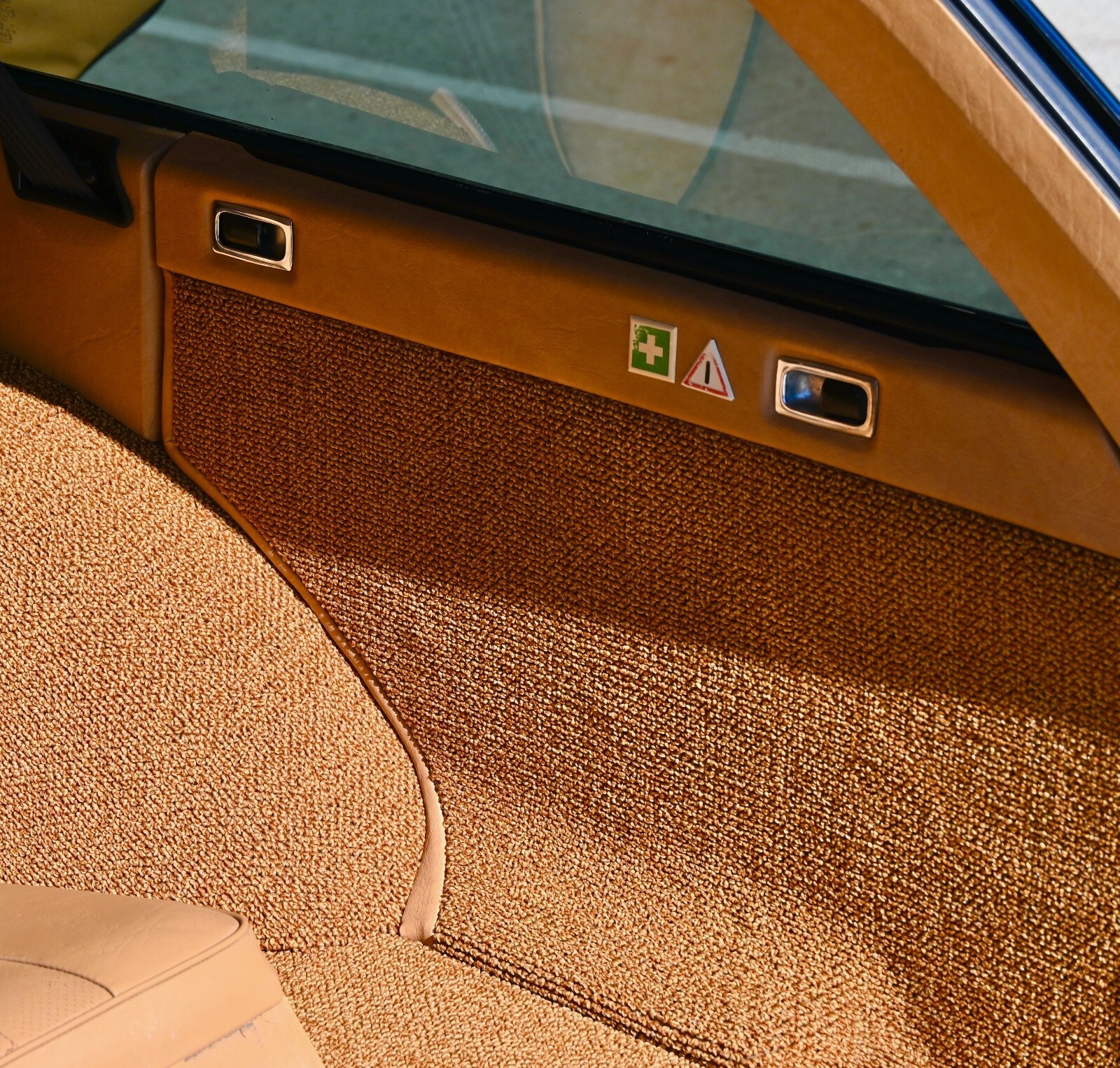 Full new interior carpets, window lace replacement and driver’s seat interior rebuilt by the amazing Thompson Tops, B pillar piping, repair R-hatch and new under-dash cover with matching grommets