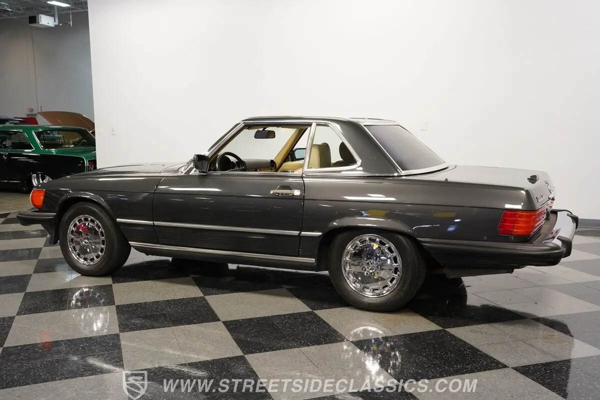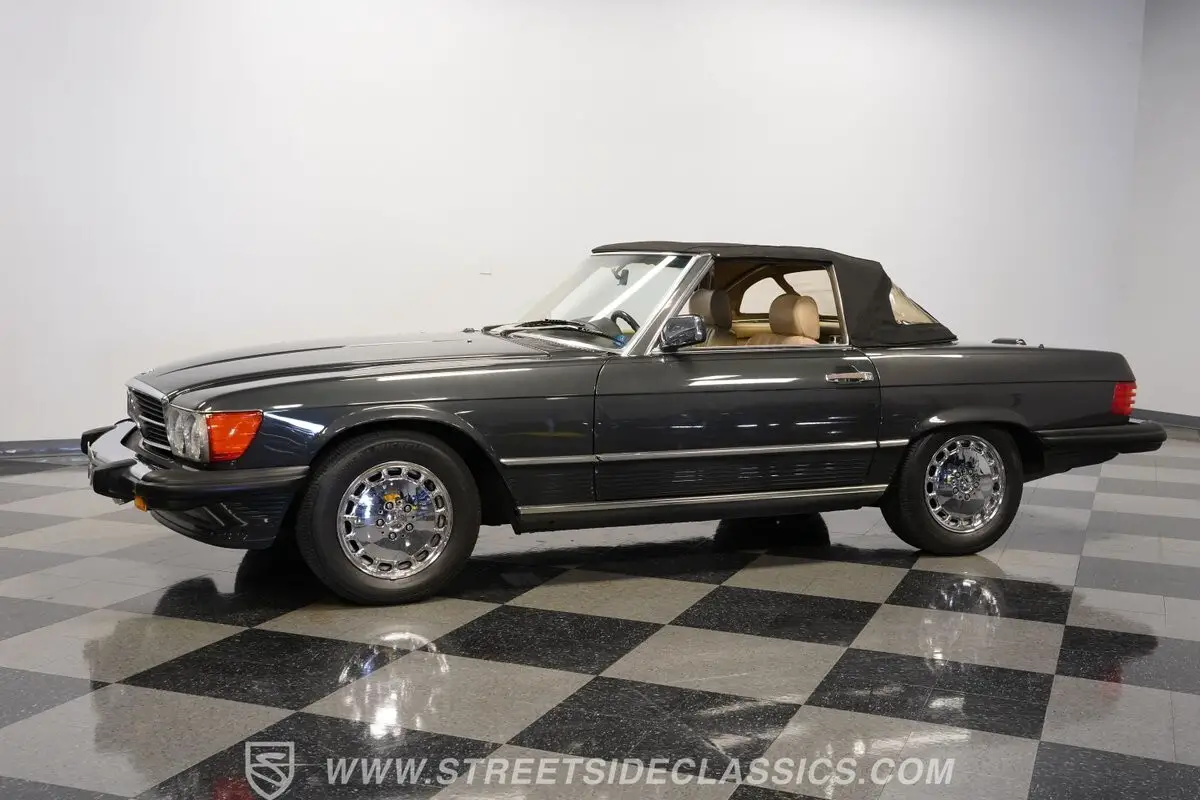 This 1989 Mercedes-Benz 560SL exudes classic German engineering in its handsome Black Pearl exterior. The bold lines and iconic styling define this roadster's presence. Its factory 15-inch chrome-plated alloy wheels wrapped in 205/60R15 Michelin tires provide a solid foundation. The canvas soft top and removable hardtop offer versatile driving options.