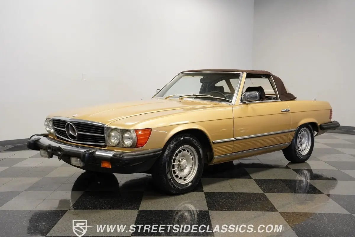 A professional repaint in 2022-2023 gave this 1982 Mercedes-Benz 380SL 107 its current Champagne Metallic finish. The convertible configuration includes a removable hardtop for all-weather options. Factory 14" wheels hold 205/70R14 tires, creating a proper German road stance. A manual convertible top allows quick changes to open-air driving. Chrome trim remains well-kept throughout, giving this German roadster a clean appearance from every view.