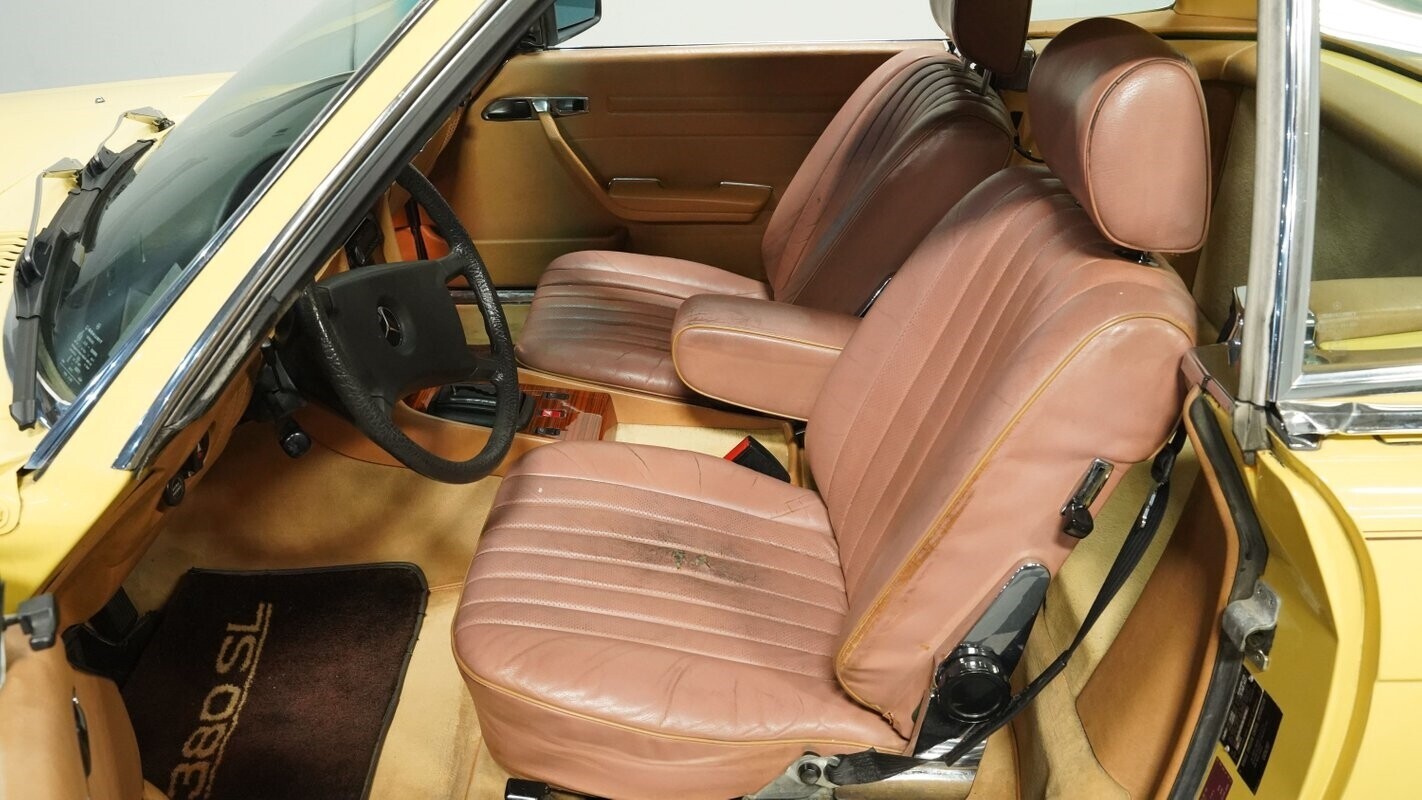 The 1982 Mercedes-Benz 380SL radiates luxury and performance in its Sunlight Yellow finish. This German roadster showcases the pinnacle of automotive engineering from the early 80s. Its sleek profile is accentuated by chrome accents and the iconic Mercedes grille. The power-operated beige canvas top provides open-air thrills, while the matching removable hardtop offers year-round versatility. Rolling on 14-inch wheels wrapped in 205/70R14 tires, this 380SL strikes an impressive stance on the road.