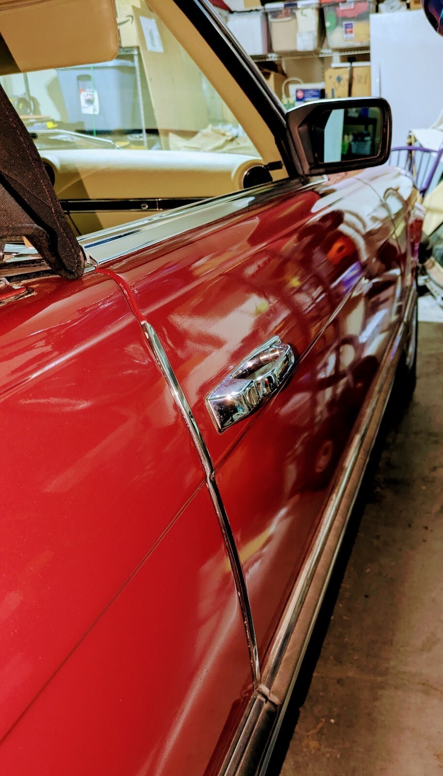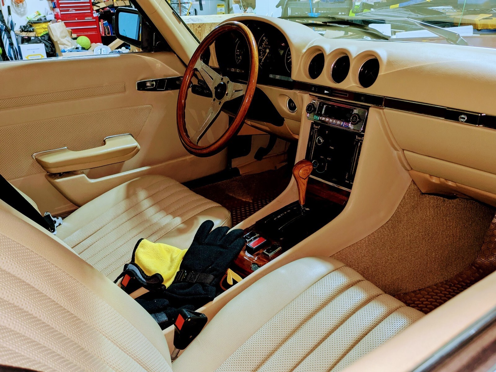 1977 Mercedes-Benz SL-Class 450 SL with 114427 original miles. It is a convertible with a tan interior and red exterior. This collector car has a hard top and new soft top, automatic transmission, power windows, climate control, metallic paint, AM/FM stereo, CD player, air conditioning (not tested, probably needs a recharge), leather seats, cruise control, CD player, and power steering/brakes. The vehicle has a 8-cylinder engine, automatic transmission, 2WD drive, and features partial service history available. It is a left-hand drive car with 2 doors, making it a stylish and luxurious addition to any car collection.Garaged at my house. Looks great, runs great, stops great. It is beautiful to drive, a true attention getter.