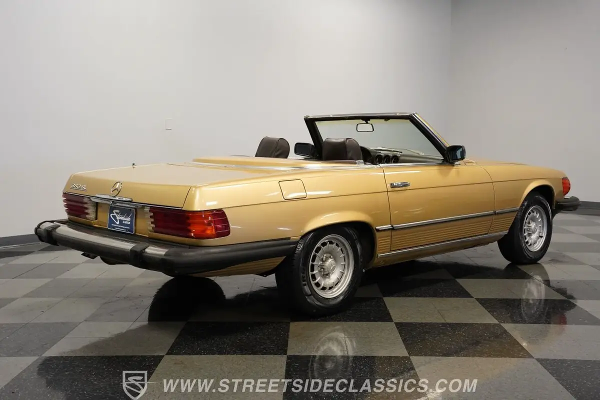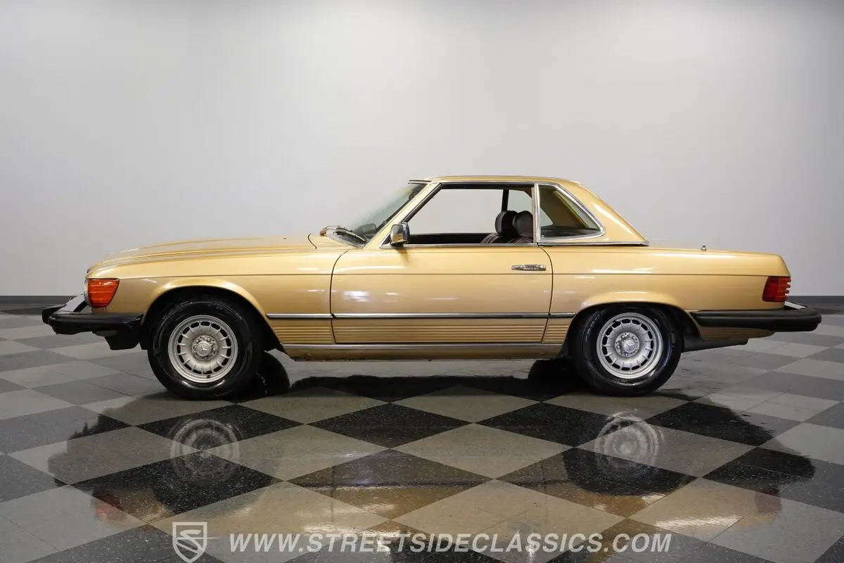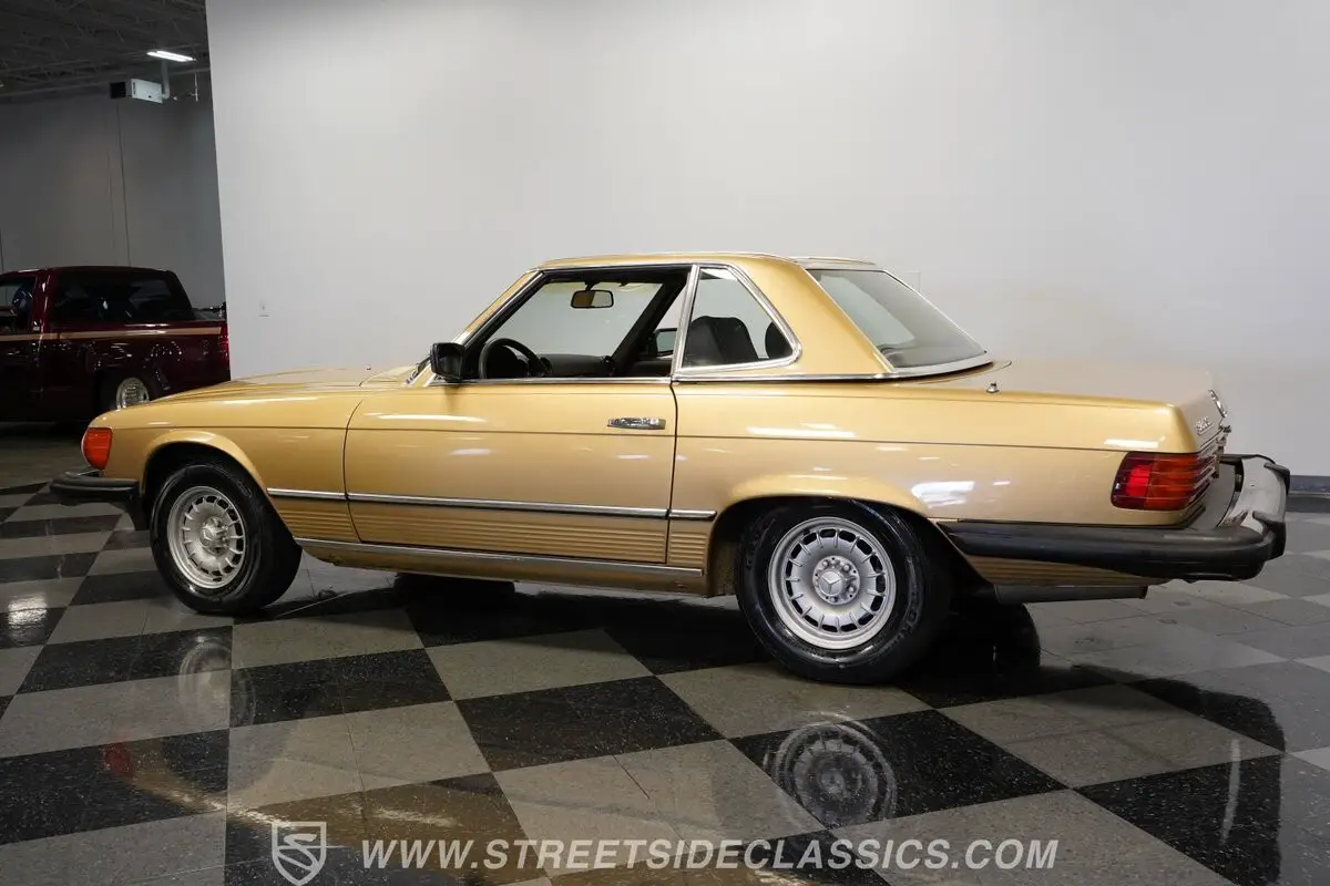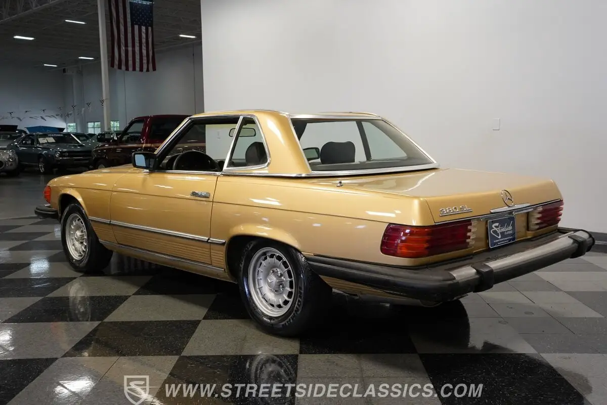 A professional repaint in 2022-2023 gave this 1982 Mercedes-Benz 380SL 107 its current Champagne Metallic finish. The convertible configuration includes a removable hardtop for all-weather options. Factory 14" wheels hold 205/70R14 tires, creating a proper German road stance. A manual convertible top allows quick changes to open-air driving. Chrome trim remains well-kept throughout, giving this German roadster a clean appearance from every view.