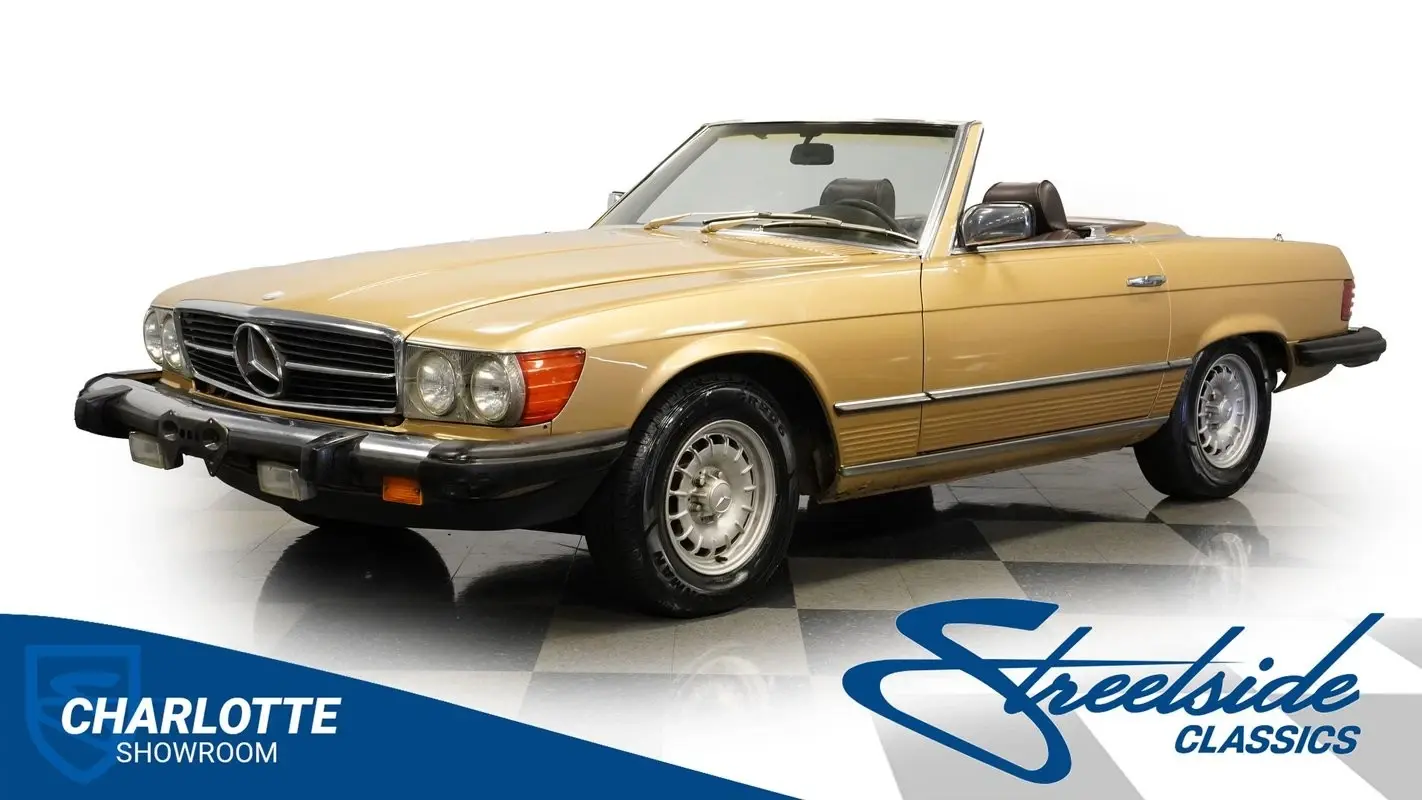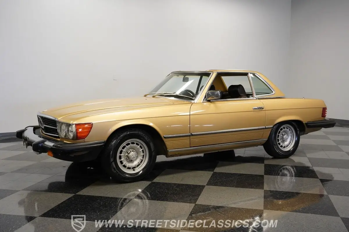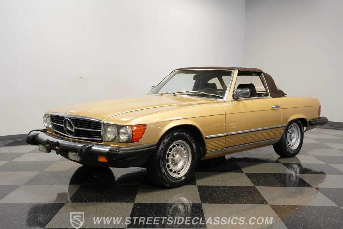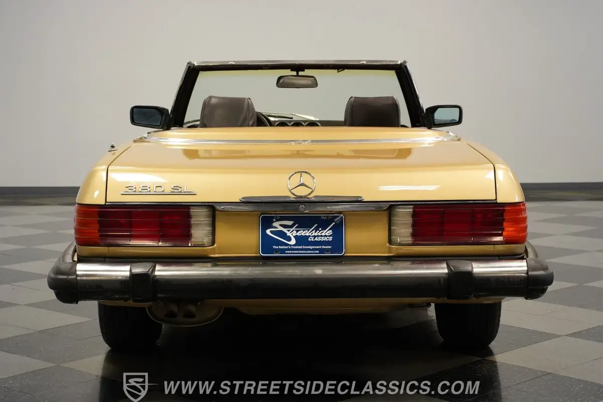 A professional repaint in 2022-2023 gave this 1982 Mercedes-Benz 380SL 107 its current Champagne Metallic finish. The convertible configuration includes a removable hardtop for all-weather options. Factory 14" wheels hold 205/70R14 tires, creating a proper German road stance. A manual convertible top allows quick changes to open-air driving. Chrome trim remains well-kept throughout, giving this German roadster a clean appearance from every view.