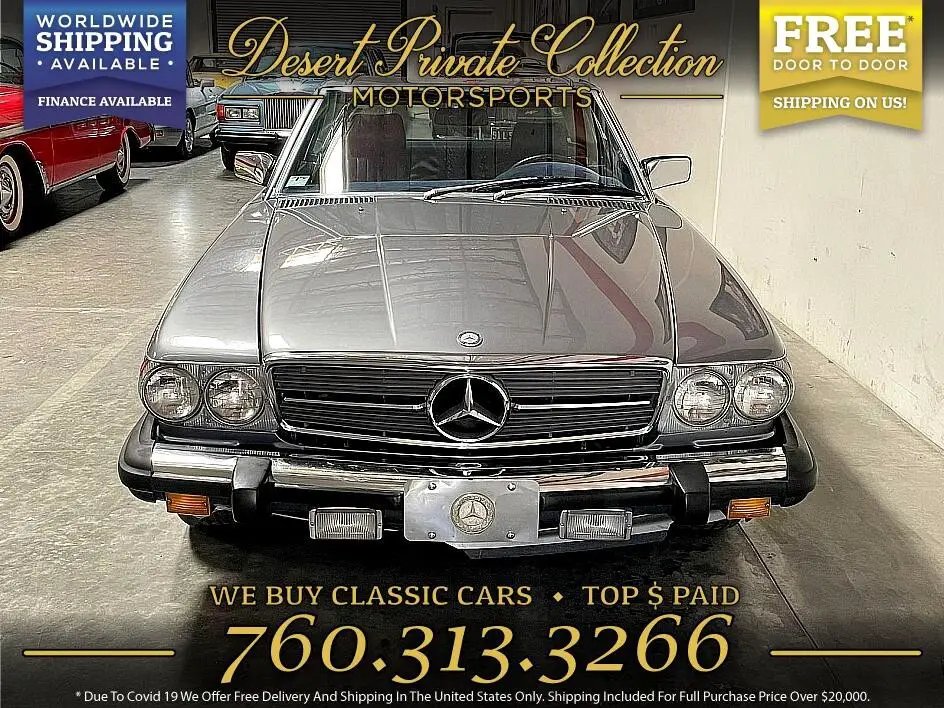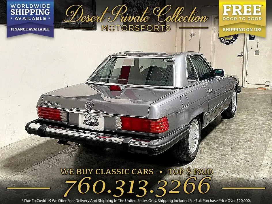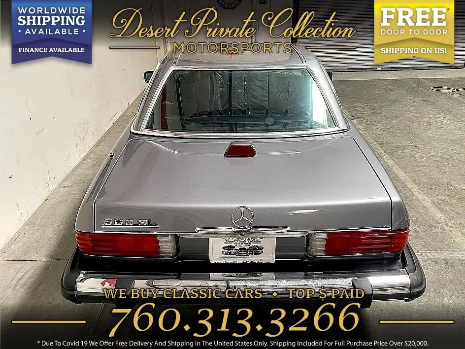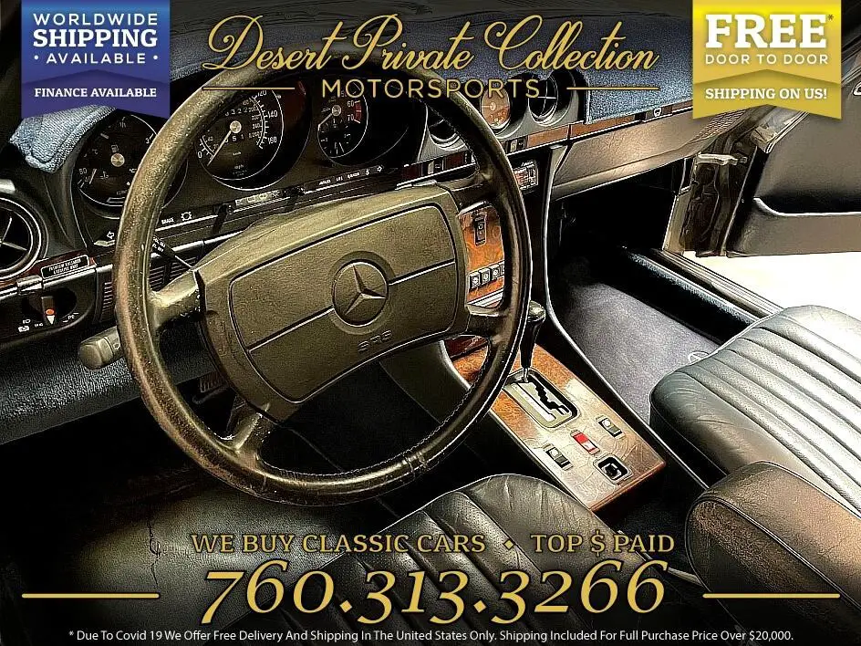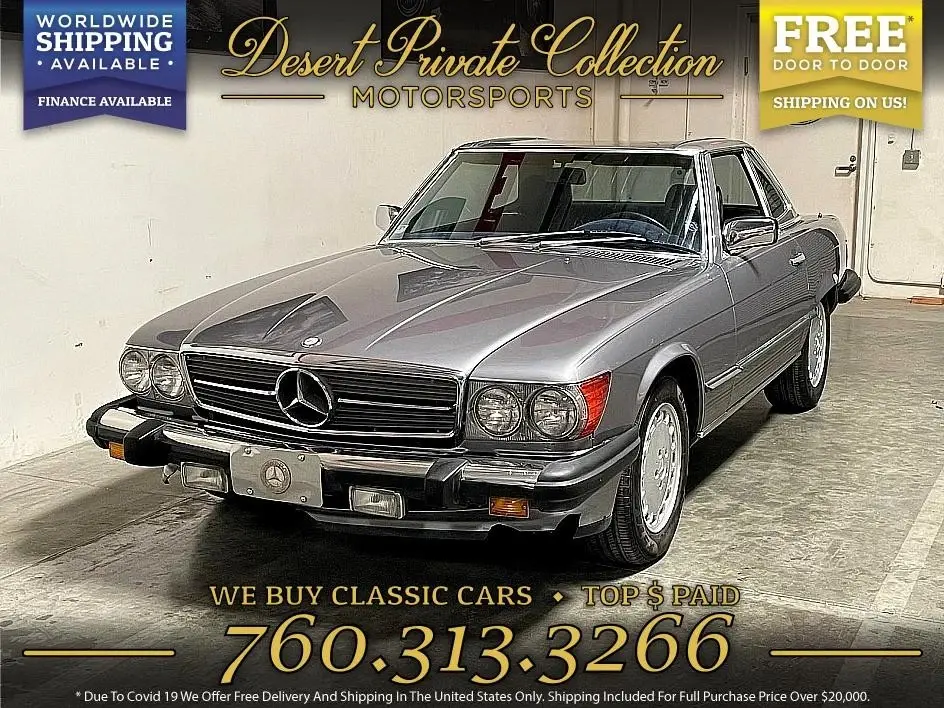 Welcome to our Timeless classic R 107 Chassis Mercedes Benz 560 SL. This California car has withstand the passage of time and with both its soft top and hard top (winter top) will let you experience motoring in style in any climate. With worldwide shipping available| it is easier than ever to get your California Dream Car delivered right to your Door!! Call us for details on this offer and thank you for stopping by our Collection.Click the link for the video:... Read the full description on our Website at: www.desertprivatecollection.com