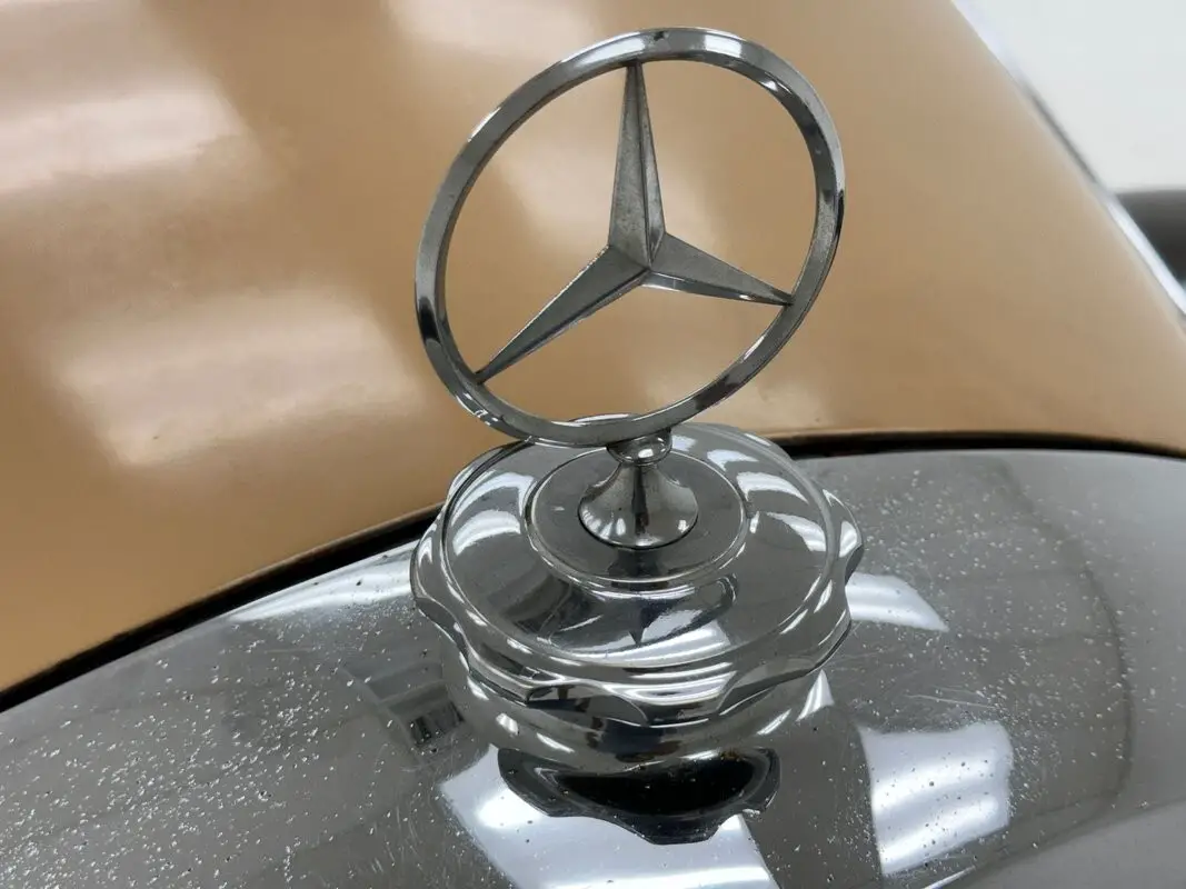 Dark brown fenders and roof sandwich a tan body. A tall and broad grille with mesh is flanked by the extended front fenders housing single headlights rather low and wide on the car while mismatched fog lights ride on the bumper just inside of the conical turn signals. Side strake trim pieces flow along the long engine cover sides where the A-pillar flows into the seam of the reverse opening front doors. The rear doors open traditionally and contour to the rear fender while the height of the cabin is accentuated by the brown roof which waterfalls to a C-pillar around a smaller rear window. Like some American cars at the time, the taillights are tiny in comparison to the sheer real estate of the rear of the car, mostly consisting of a bulbous trunk lid. 15-inch steel wheels are painted a different shade of brown, they may have been tan before, and wear Mercedes embossed dog dish type hubcaps. The car is unrestored and the paint and brightwork show their age. Imperfections are many and include checking paint, large chips that have been touched up, scratches, cracking and crackling, numerous scratches, missing paint, some pitting on the metal, scratches or missing paint on the wheel paint.