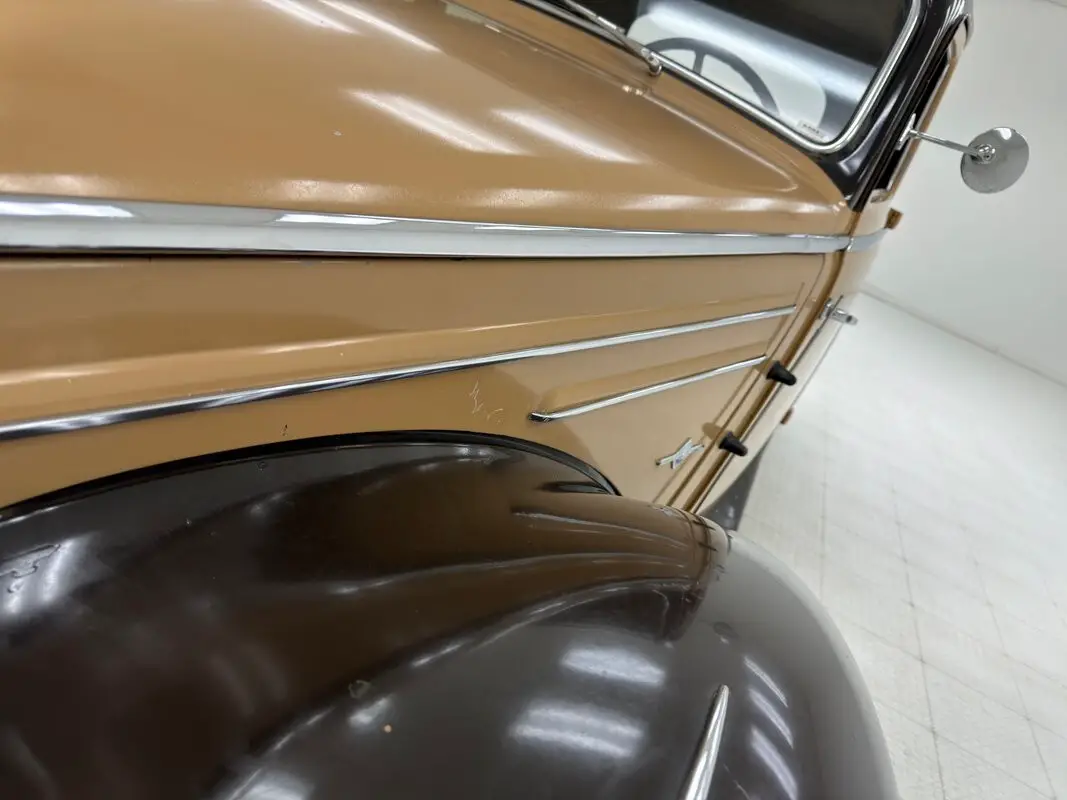 Dark brown fenders and roof sandwich a tan body. A tall and broad grille with mesh is flanked by the extended front fenders housing single headlights rather low and wide on the car while mismatched fog lights ride on the bumper just inside of the conical turn signals. Side strake trim pieces flow along the long engine cover sides where