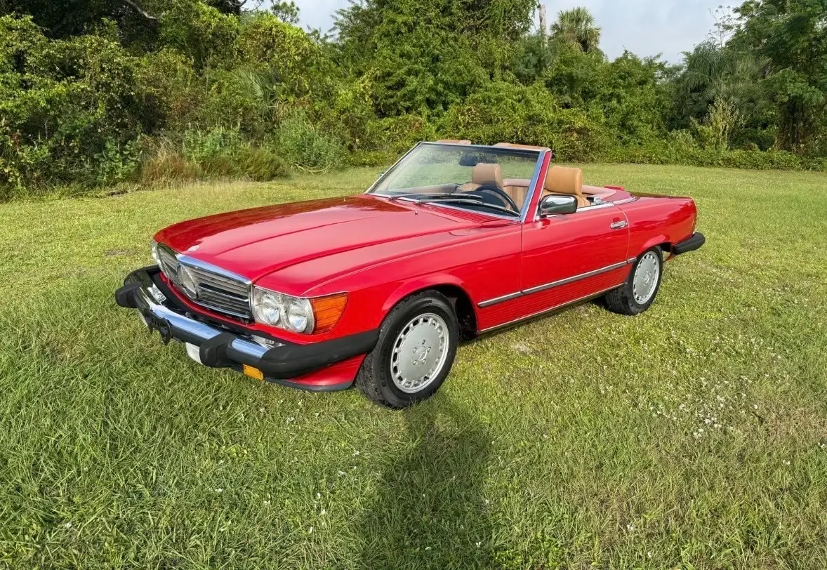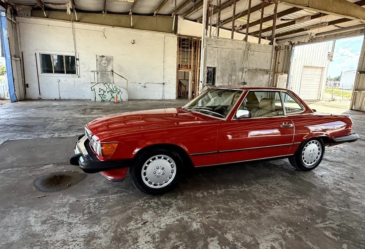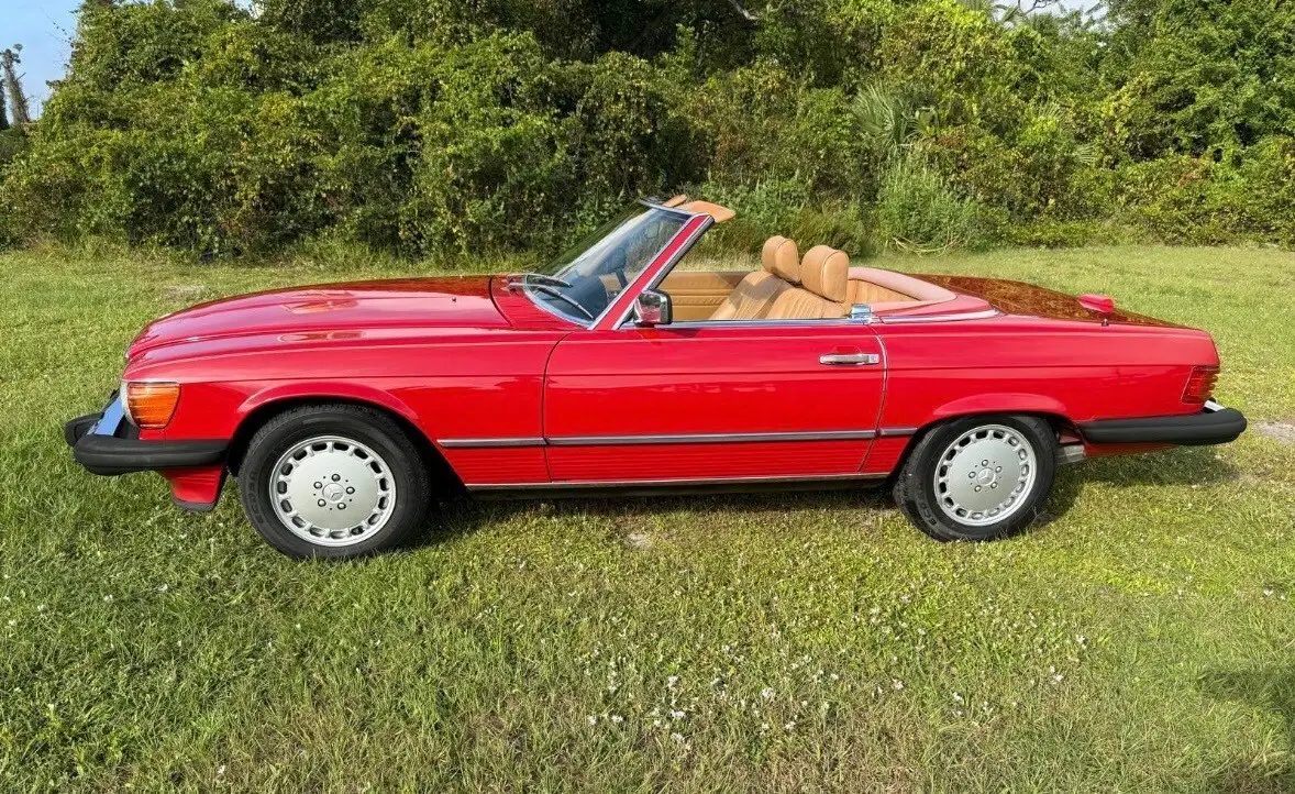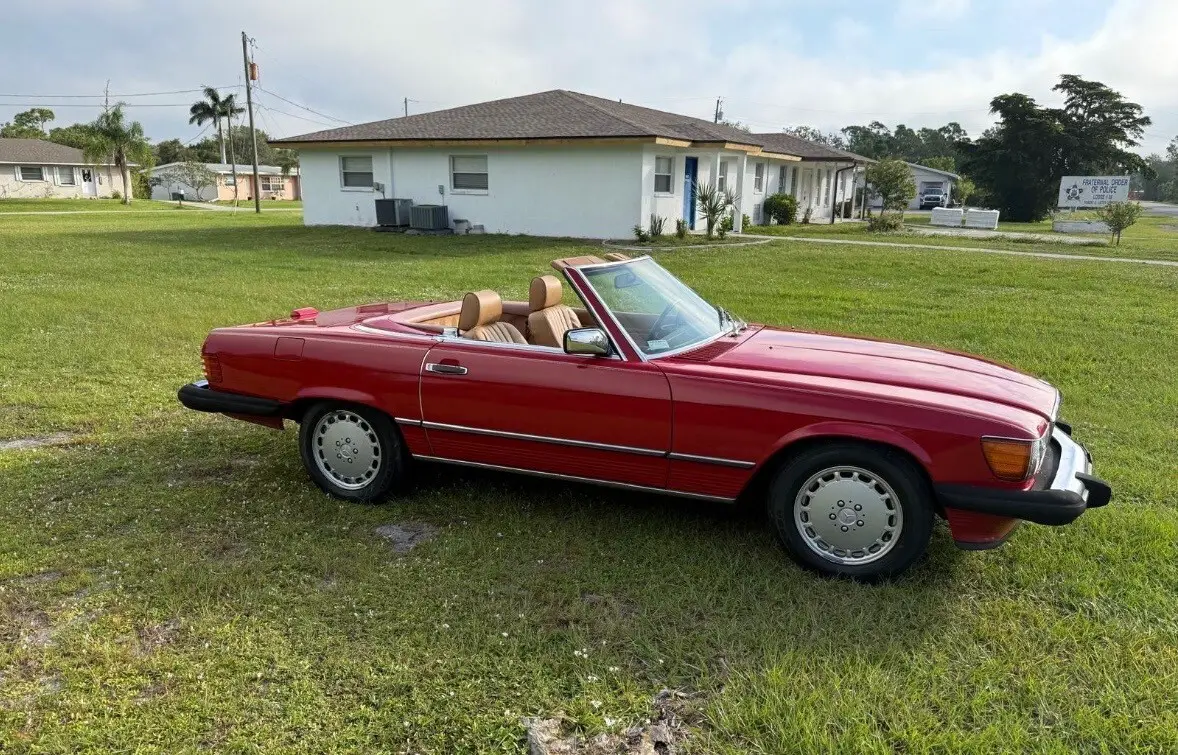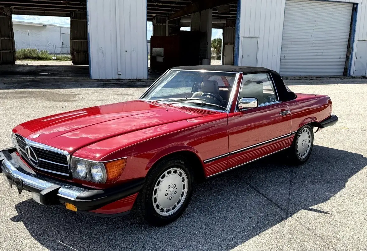 The 1988 Mercedes-Benz SL-Class SL is a classic convertible car with a red exterior and brown leather interior. It features a 5.6L gasoline engine, automatic transmission, and a powerplant ranging from 111 to 185 kW (148.74 - 247.9 hp). This stylish car comes with a range of features including power windows, climate control, seat heating, and cruise control. With only 64k miles on the odometer, this Mercedes-Benz SL-Class is a well-maintained vehicle perfect for those seeking a luxurious and high-performance convertible driving experience. and includes car cover