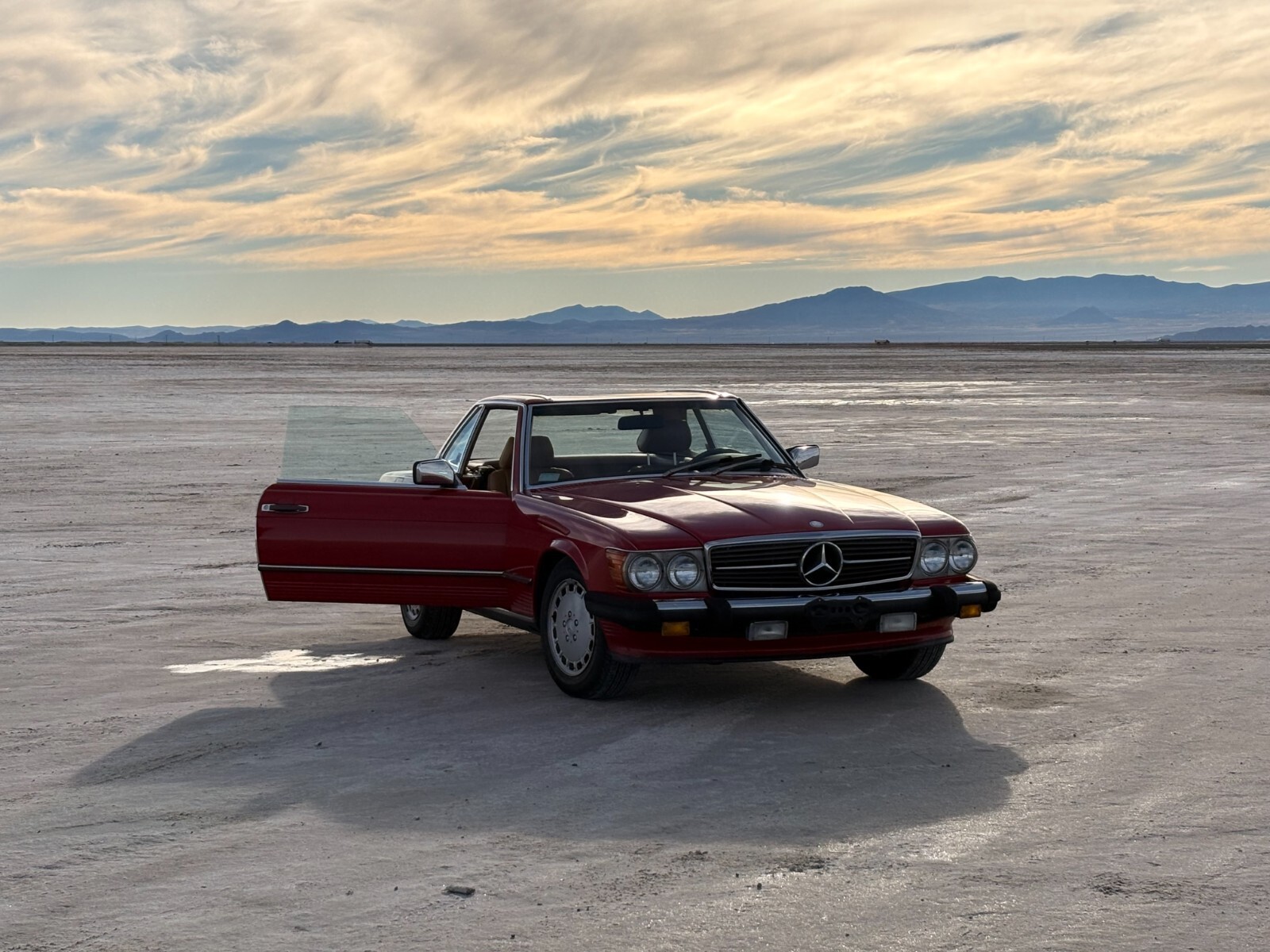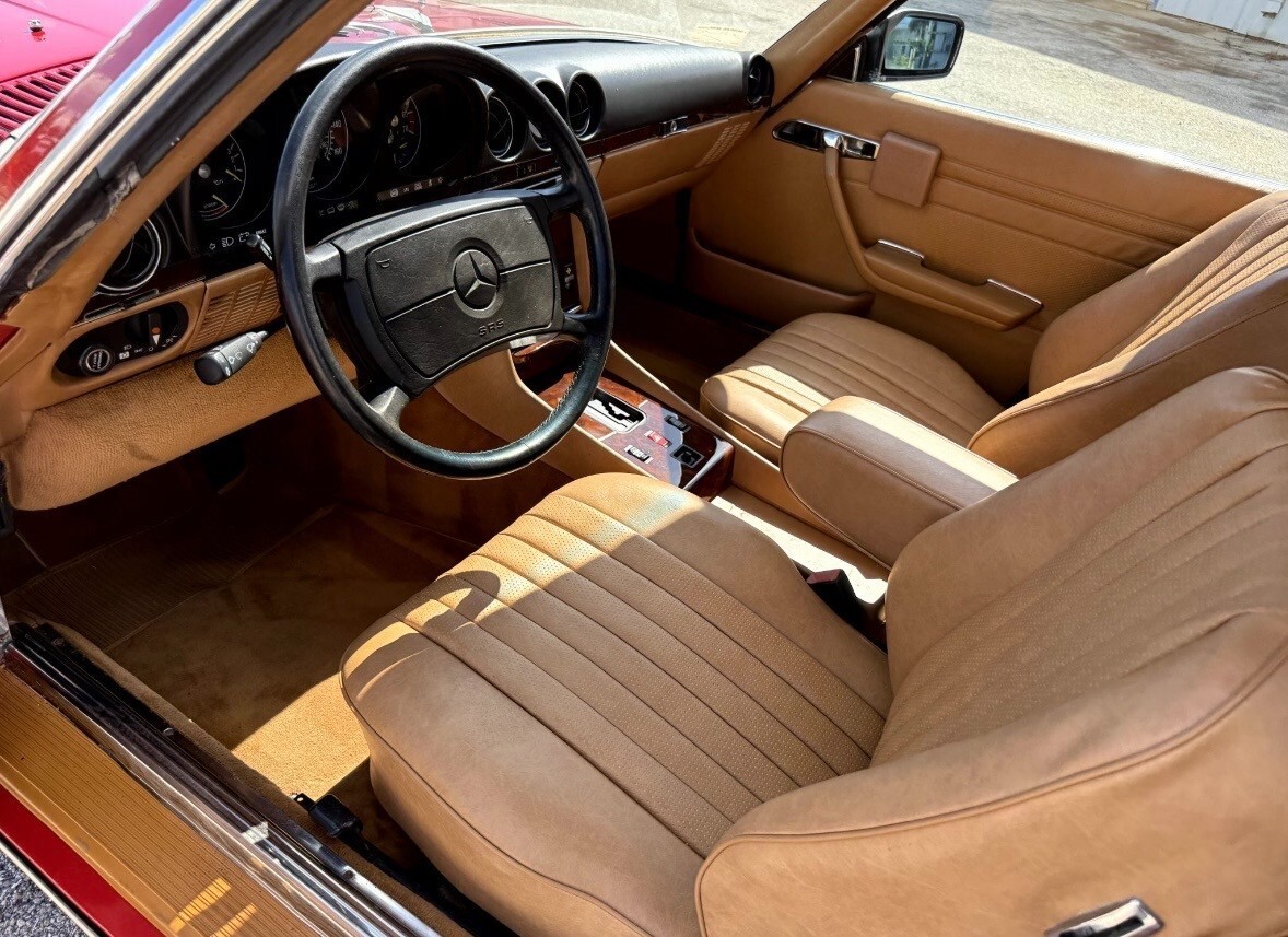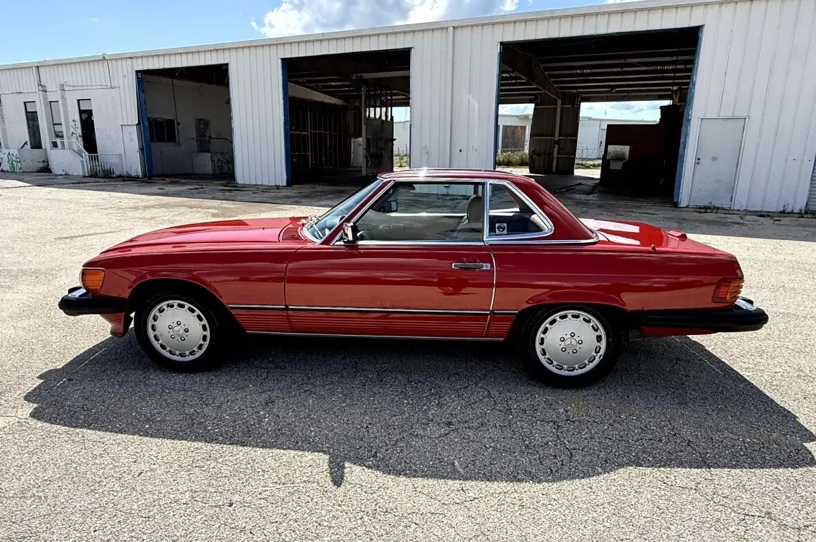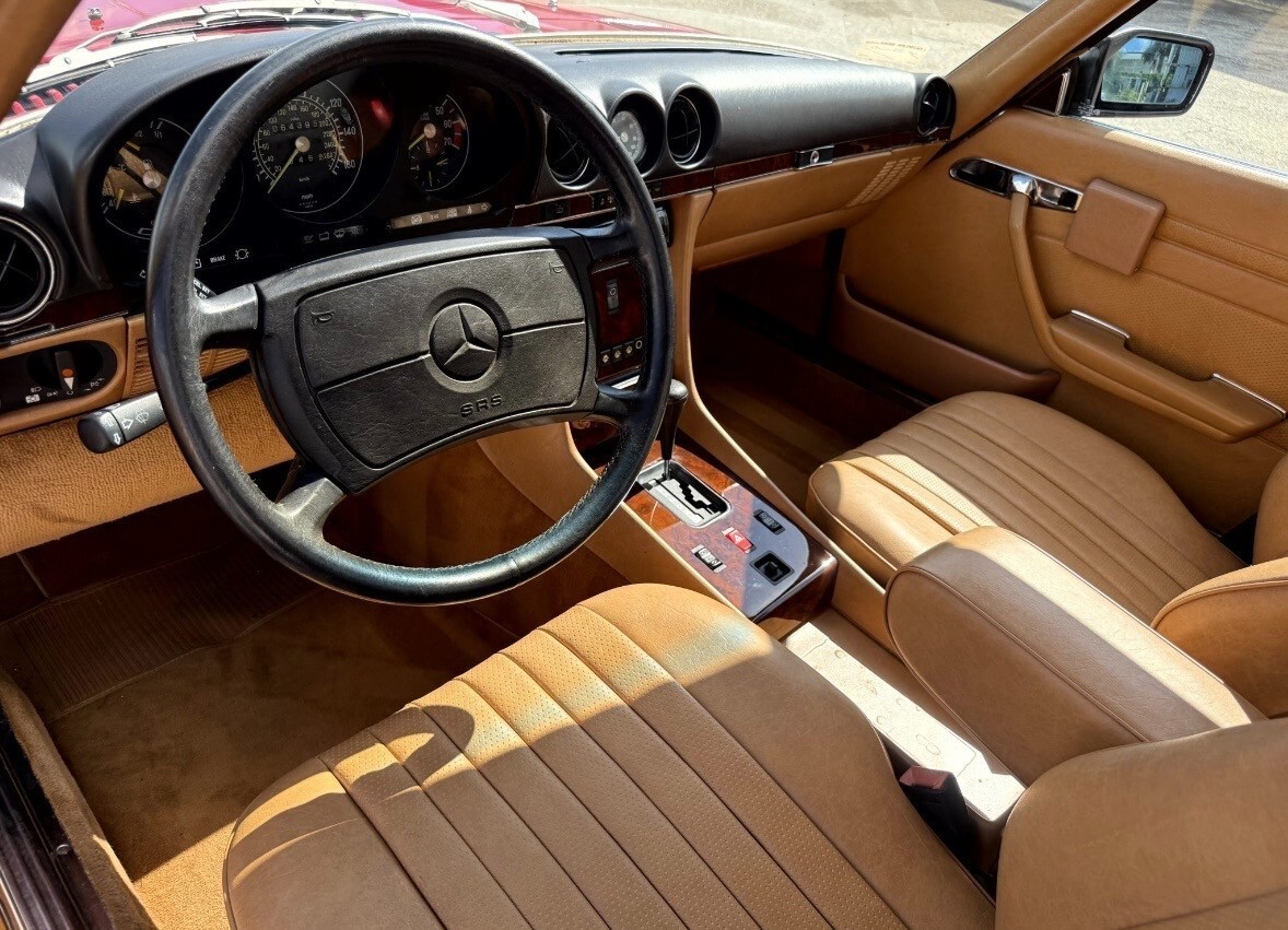The 1988 Mercedes-Benz SL-Class SL is a classic convertible car with a red exterior and brown leather interior. It features a 5.6L gasoline engine, automatic transmission, and a powerplant ranging from 111 to 185 kW (148.74 - 247.9 hp). This stylish car comes with a range of features including power windows, climate control, seat heating, and cruise control. With only 64k miles on the odometer, this Mercedes-Benz SL-Class is a well-maintained vehicle perfect for those seeking a luxurious and high-performance convertible driving experience. and includes car cover
