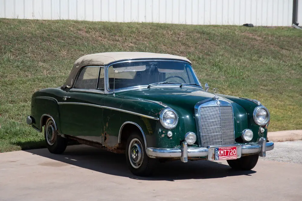 This 1957 Mercedes-Benz 220S 'Ponton' Cabriolet is a highly original example in need of complete restoration. Green with tan leather interior. This car has never been restored so you can be the first to do so. Just out of long-term ownership and storage. It comes complete but has rust. First introduced in 1956, the Mercedes-Benz 220S sat atop the 220 model range and was the last of the Ponton? series cars. Featuring a unitized body/frame construction and a fully independent suspension, the 220S provided the kind of motoring experience that Mercedes-Benz's demanding clients had come to expect of the brand. As one of only 1,251 Mercedes-Benz 220S Cabriolets produced, these elegant and exclusive limited edition Grand Tourers are highly prized.