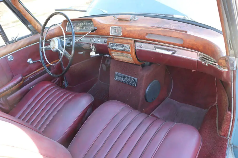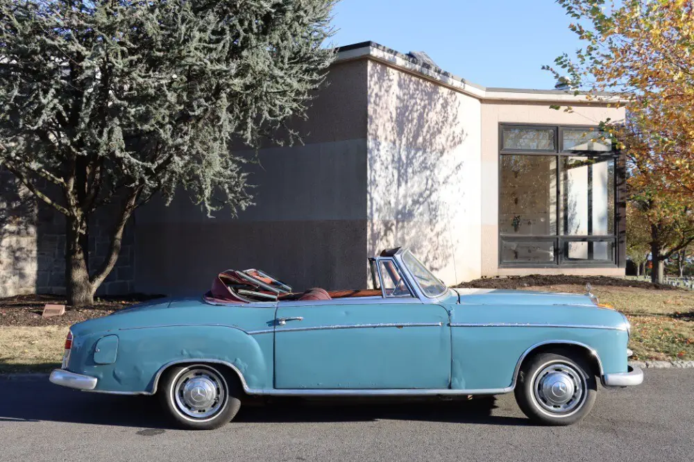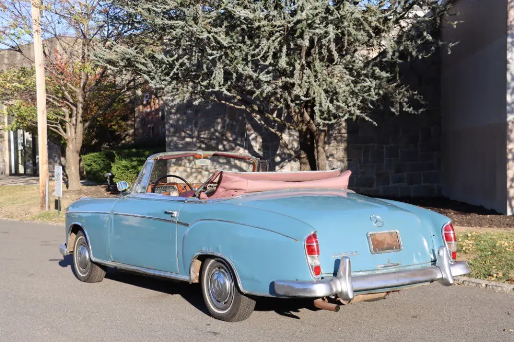 This 1959 Mercedes-Benz 220SE 'Ponton' Cabriolet is a highly original car in need of cosmetic restoration. Blue with red interior. An honest car with a lot of potential. It runs and drives but has some rust and needs paint, chrome, and interior work. In 1958 the 220 range was updated with a fuel-injected version of the 2.2-litre overhead-camshaft six, becoming the 220SE. Maximum power increased to 115bhp, and there was a useful improvement in acceleration, the 0-60mph time reducing by two seconds. One of the