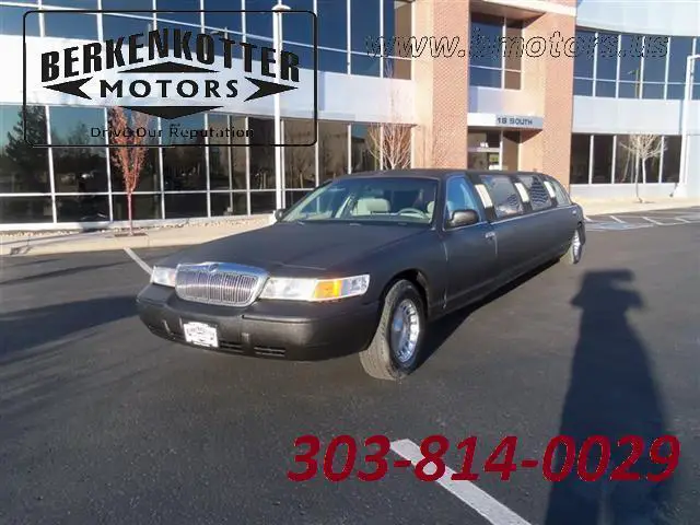 Call GLENN @ 720-371-3778n to make an immiate deal. 1998 Mercury Grand Marquis GS Limosine 1998 Mercury Grand Marquis GS 4-Door Sedan Limosine Exterior Color: Black Interior Color: Gray Stock Number: C2415 Mileage: 192,308 Engine: 4L NA V8 single overhead cam (SOHC) 16V Fuel: Gasoline Transmission: Automatic Warranty: Extended Warranty Available Title: Clear VIN: 2MEFM74W0WX636948 Additional Photos click on a Standard Features Air Conditioning: Front Air Conditioning Airbags: Dual Front Airbags Audio System: Cassette AM/FM Radio Brakes: Power Brakes Convenience Features: Cruise Control Trunk Release Multi-Function Remote Power Steering Tilt Steering Wheel Lights: Exterior Entry Lights Auto On/Off Headlights Mirrors: Power Side Mirror Adjustments Heated Side Mirrors Seats: Driver Seat Power Adjustments Split-Bench Front Seats Cloth Upholstery Security: Power Door Locks Tires And Rims: Tire Type 16 Inch Wheel Diameter Windows: Intermittent Front Wipers Power Windows Rear Window Defogger