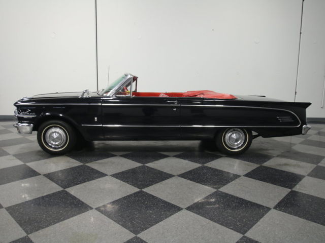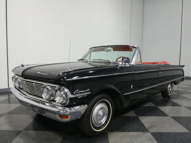 Like the tidy proportions and easy handling of a Ford Falcon but want something a little less common? How about a vintage drop-top that has a ton of class but is easy on the wallet when it comes time for gas, maintenance and insurance? And a bargain price wouldn't hurt either, right? Then take a good, long look at this 1963 Mercury Comet convertible, a cool find that stands out in a crowded field.Obviously the Comet was Mercury's version of the Falcon, but true to the Mercury brand mission, it's a bit more upscale with more features, more comfort, and a unique look. Not just badge engineered, the Comet wears unique sheetmetal that definitely looks like a Mercury, particularly with the bold grille, sweeping side trim and intricate rear panel, all of which were borrowed from the bigger models. Finished in basic black, it looks like a grown-up's car, and thanks to a repaint a few years ago, it has the kind of elegance usually reserved for much bigger cars. There are a few signs of use, which is especially evident on black cars, but a professional buff would really make this black paint look great. The chrome appears to be mostly original and in good condition, with bright bumpers, a grille that isn't bent, and ornate little details that delight, from the fender-mounted ornaments to the awesome 'Comet' script on the trunk lid. And those taillights are just too cool.With a black car, is there any better interior than red? The beautifully restored upholstery in this Comet ably demonstrates the upscale look that Mercury was seeking, with silver piping, two kinds of vinyl on the seat covers, and ornate door panels that add a bright white contrast strip. There's plenty of room with the bench seat and the driver gets to sit behind an attractive 3-spoke steering wheel with simple chrome horn ring. Factory gauges are in a chrome panel that seems to mirror the taillight panel out back and while it covers only the basics, it sure looks good doing it. You'll note that this car has a three-speed manual transmission, so it feels lively and is fun to drive and the factory AM radio provides vintage-sounding entertainment. Overhead there's a black power convertible top that's in good condition and a red vinyl boot is included with the car. Comets also offer a shockingly spacious trunk, complete with a full-sized spare and jack assembly.You'll be pleasantly surprised how energetic the 200 cubic inch inline-6 feels thanks to the Comet's featherweight body, especially with that manual transmission. The engine bay is beautifully detailed with some chrome dress-up to really make it sparkle, but for the most part it's very OEM. Actually, it's from a Mustang Sprint and there are less than 500 miles on the rebuild, so it's a lot of fun to drive. There's an upgraded MSD coil, a new radiator up front, and thanks to seven main bearings, it's turbine-smooth at any speed. It starts easily and with that single-barrel carburetor, fuel economy is impressive. There's a new clutch between the engine and transmission and according to the door tag, there are 3.50 gears out back, so it feels quick around town and easy to drive on the highway (that six doesn't mind the extra RPM one bit!). The underside is quite clean with original floors and factory-style reinforcements in place. There are some helper springs on the rear leaf springs which help keep it on an even keel and simple hubcaps and 185/80/13 whitewall radials complete the no-nonsense look.An unusual and affordable car that delivers big car fun, this Comet will be the hit of any show, but we're betting nobody will enjoy it more than the driver. Call today!