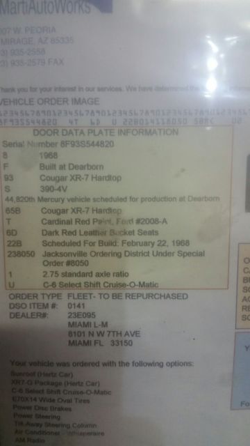Let me start off with this is not my personal vehicle, My dad has passed away and we (family) are selling what was left in his collection. please bare with us as we don't have all the info you may need but we will try to get it posted or answered for you, IT IS BEST TO MAKE ARRANGMENTS TO JUST COME LOOK AT THIS CAR. I DONT KNOW MUCH ABOUT THESE CAR'S, The 1968 xr7 G Mercury cougar is not cheap! serious enquiries only....! Very Rare Hertz rent a racer, Cougar is beautiful. ... . Marty report, big block FE 4bbl S code automatic C-6 (We have been informed the engine may not be a 390 but it is a FE Big Block One guy said its a 4 bolt main engine a 427, 428 etc... We just don't know. We've all heard of the Shelby GT350-H before. In short, it was the Cobra-289-powered Ford Mustang, thoroughly massaged by Shelby and loaned to the public by Hertz. These "rent-a-racecars" were popular with SCCA racers, with some coming back with leftovers from roll cages and other tell-tale signs of abuse. But the forgotten sibling of the Shelby GT350-H is the Shelby Cougar XR7-G; something of a big brother to the small-displacement 289ci Ford. "The Hertz XR7-G came with the 325hp S-code 390ci GT engine, C6 automatic transmission, power front disc brakes, power steering, tilt steering, air conditioning, and an accessory gauge pack installed by Shelby. Another unique feature was the retractable sunroof installed by American Sunroof Company. The XR7-Gs were originally shipped with Rader wheels, manufactured by the Trans American Products Company. However, there were issues with the wheels cracking, leaking air, or failing catastrophically. Ford issued a recall, replacing the Rader with a set of styled chrome steel wheels as seen here." . We are getting emails and calls from all over the country from as far as Canada .... but still no one has come out to buy this rare car, car is listed in other sales flyers and club web sights as well. WE RESERVE THE RIGHT TO END AUCTION EARLY. We don't know much on cars so it is best to just plan to come look at her in person. //// cash talks buy now!!! CALL FOR FURTHER INFO 717-968-5362 ASK FOR Bruce. We make every effort to represent this vehicle as accurately as possible and to the best of knowledge at the time of listing. Content is based on inspection, We encourage buyers to make a thorough, independent inspection and investigation to verify the accuracy of any claims to originality, history, equipment or other information provided prior to the purchase. Vehicle is being sold with no warranty in "As Is/Where Is" condition. XR7-G Registry WHAT TO PAY 1968 Cougar XR7-G Low -- $13,500 Average -- $21,000 High -- $32,500 Note: Documented XR7-G Hertz examples carry an estimated high value of $100,000. Add: Ram Air, 15%; four-speed, 10%; sunroof, 10%; air conditioning, 5%; 280hp 390-cu.in. V-8, 25%; 320hp 390-cu.in. V-8, 15%; 335hp 428-cu.in. V-8, 35%. Rare ..... This is one of 188 cars made FROM FACTORY with the XR7-G PACKAGE (HERTZ CAR) This is one survivor of the 188 made. how many others are there??? I cant answer that. I would guess less then 188. NOTE: this was a Florida car this info came off the Marti Auto Works Report I am adding info as I get more and more about this car. with the Thanks to all the dedicated and knowledge Cougar fans out there. Thank you all!!!
