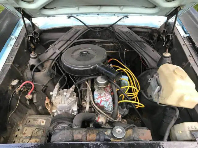 Driver door should probably be replaced or repaired. Minor rust spots on floorboard and fender could use patching and repairing but is Driveable as she is. Transmission out of car and in need of repair or full rebuild. Engine turns by hand but unknown if it will run as it sits. AC compressor installed and connected to engine by belt. Turns but other than that it's condition is unknown.