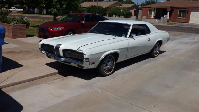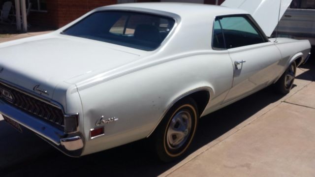 Complete mostly original 1970 Mercury Cougar, runs and drives. 121K miles onbelieved to beoriginal 351C 2 barrel engine and FMX transmission. Body is clean and straight with some heavy door dings on the drivers side and two dents onfront of thehood. Has a small rust spot on the quarter panelbehind driver back tire and that's the only rust I could findon the entire car. The car was one owner until I bought it a couple of years agoandwas normally parkedin the original owners garage in Phoenix for 46 years. It's now in my garage in the desertsoit's had minimal exposure to rain. I replaced the bent rear valence with a straight one and also have a replacement center hood extension (snaggle tooth) and driver side fender extension. The car has not been in any accidents that I'm aware of;it wasbumped on the front driverfender extension when original owners daughter was learning to drive. The car can use a paint job but I'd say bodyworkwill be minimal for a car this age--no surprises.