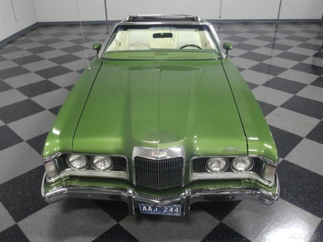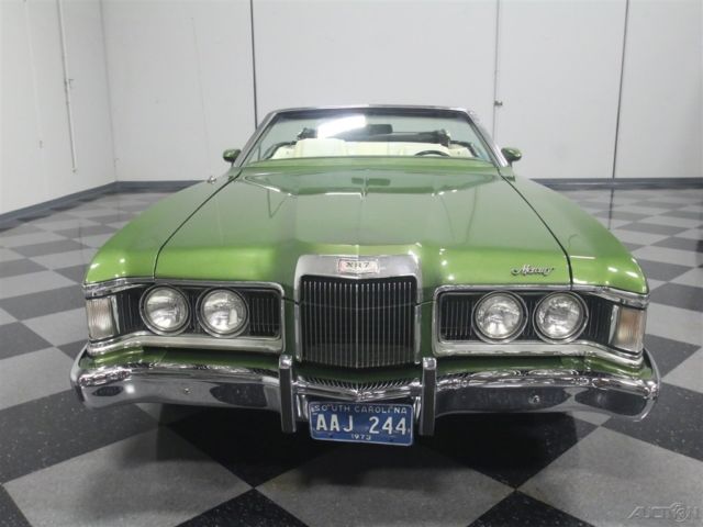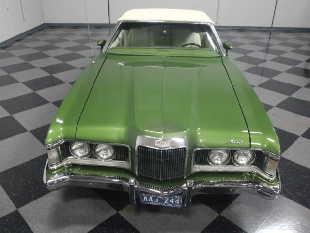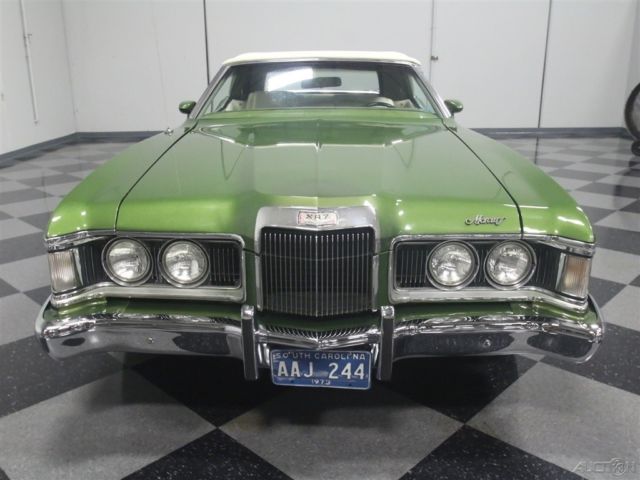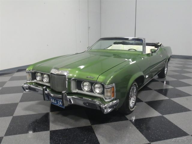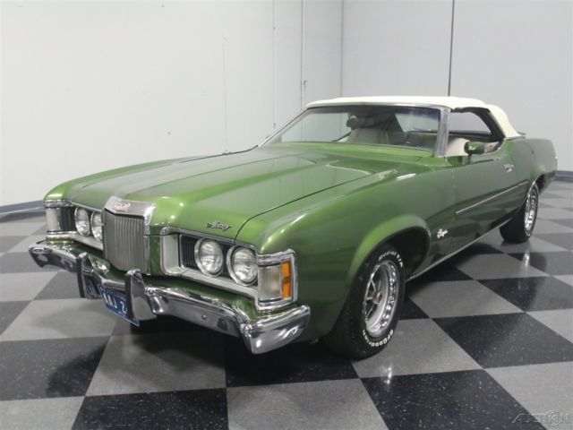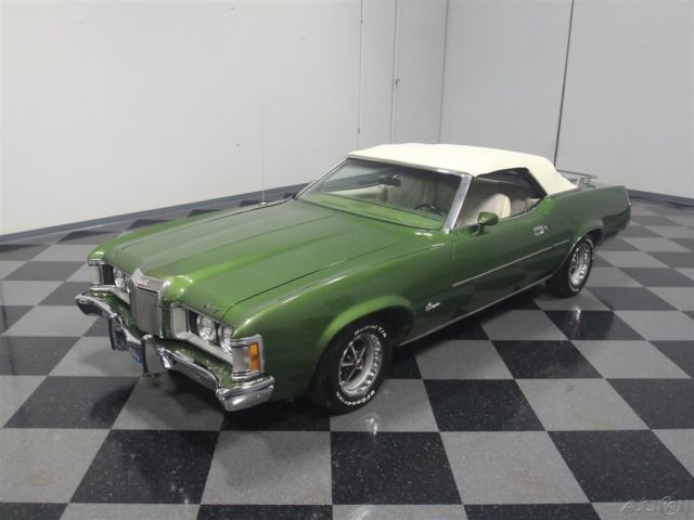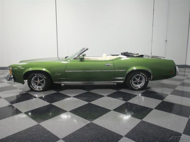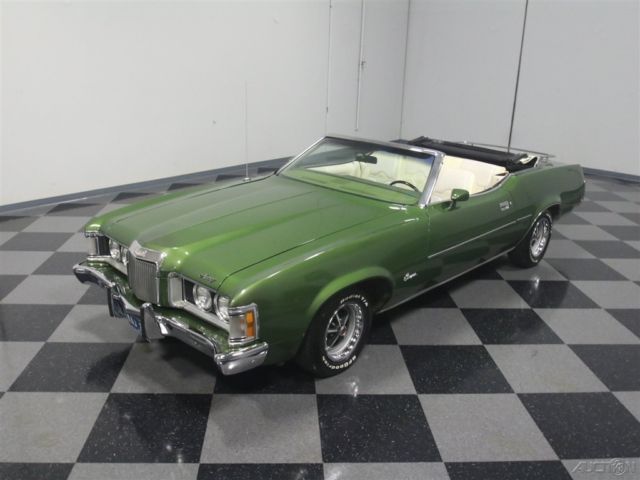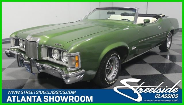 Both the Mustang and the Cougar grew in 1971, but the Cougar seems to wear the extra size better than its cousin. This 1973 Mercury Cougar XR7 convertible has a sporty look that works with a luxurious interior to create a unique kind of muscle car, and with a rare 351C Cobra Jet V8, it's more than just pretty. Subtlety was lacking in the early '70s but this relatively muscular cat keeps its performance credentials on the down-low. The chiseled good looks of the Cougar reflect both the pony car and Lincoln DNA in its family, and depending on the angle, it's both sporty and elegant. The narrow front grille with "power dome" hood are certainly reminiscent of Lincolns of the same period, while the kicked-up quarter panels behind the doors are pure Mustang, making for a very attractive package. It was repainted not too long ago and has a great shine and good sheetmetal underneath, a perfect Sunday afternoon cruiser that doesn't need any special attention. A chrome trunk rack is an unusual accessory but we have to admit that we like how it looks, and a set of Magnum 500 wheels keeps it looking aggressive. Nobody will mistake it for anything else from behind, as the downturned taillights and massive chrome bumper are unique to this model, and it still carries factory Cougar badging. If you've driven an early '70s Mustang, you'll feel right at home in the mostly original interior. The bucket seats are a little wider and a little softer, but the array of round gauges are pure pony car. The interior is showing some signs of age, but it's still serviceable and we're undecided on whether we'd preserve or restore the seats. The rest is pretty darned nice, including the carpets and door panels, so leave those alone. The gauges are still bright and crisp and the woodgrained applique still looks bright. For entertainment, it serves up the original AM/FM radio and the options list includes power windows, A/C (works, but needs a charge), and a tilt steering column. The top is power-actuated and stows with the touch of a button and is probably only a few years old. Ford's 351 cubic inch Cleveland "Cobra Jet" V8 was torquey and very user-friendly in the Cougar, offering good performance without being fussy. Given the condition of the engine bay, we have every reason to believe this is the car's original powerplant and has probably never been out of the car. Ford Blue paint is nicely preserved and like the interior, it would probably be a mistake to start restoring things. Clean it up but don't go too far. Power steering and power front disc brakes were standard equipment on the heavier, more luxury-oriented Cougar, and it exhales through a proper dual exhaust system with both mufflers and resonators, so it never sounds too aggressive. An FMX 3-speed automatic transmission is unobtrusive in operation and it carries a heavy-duty 9-inch rear end with towering 2.75 gears, making this a fantastic highway cruiser. The undercarriage is pretty original, but this car has spent most of its life in a warm climate so while it's a little grungy, you won't be worried about its structural strength while you're out cruising. Magnum 500 wheels can make even a school bus look sporty, so they're perfect for the Cougar and carry 205/70/14 BFGoodrich radials at all four corners. A nice combination of performance and luxury, this Cougar ragtop suggests that you don't have to give up fun when you grow up. Call today!