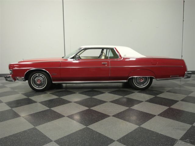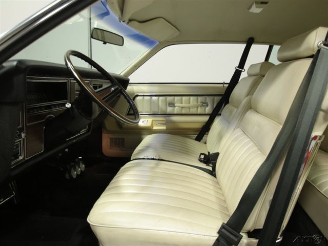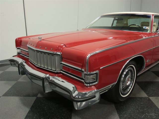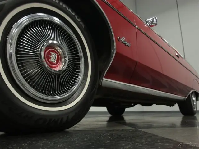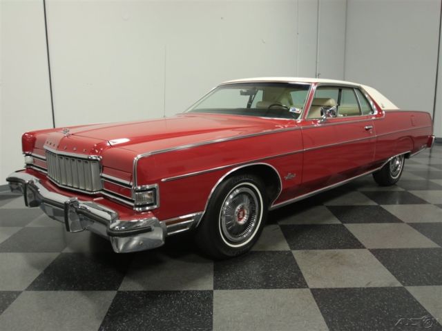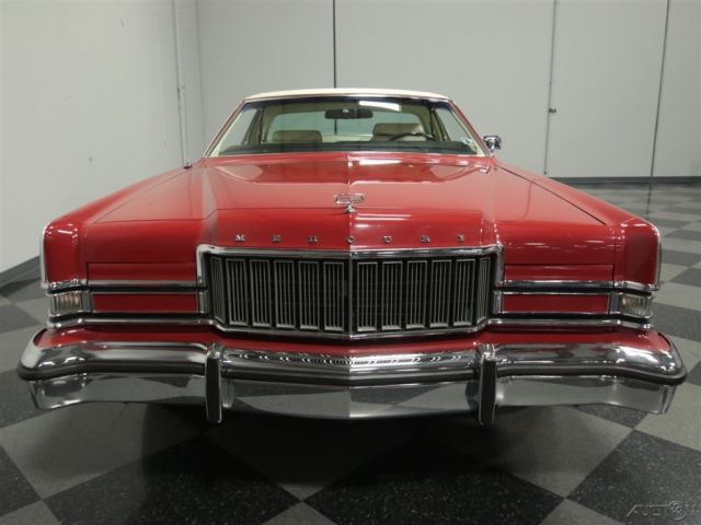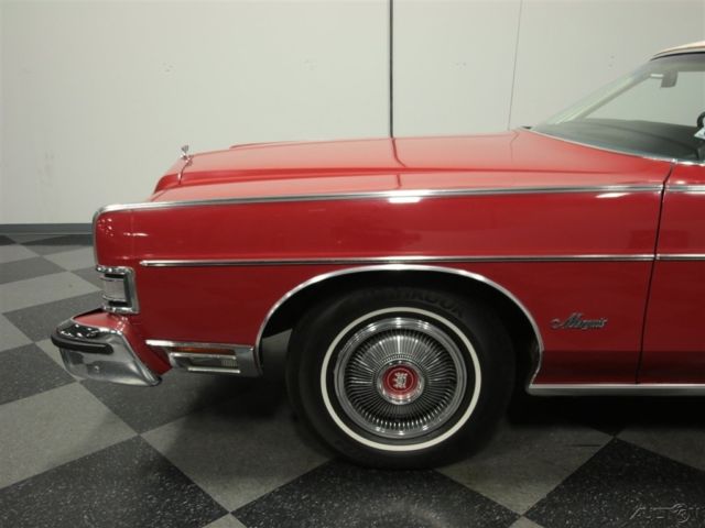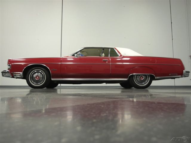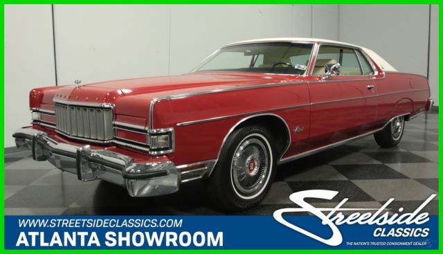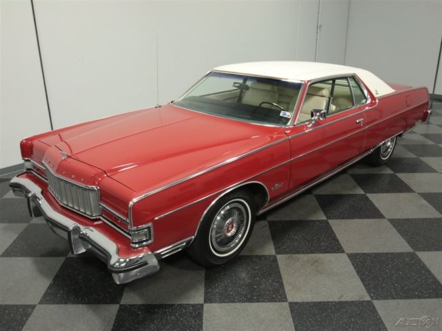Full-sized '70s luxury cars are heating up in the collector car market as the guys who knew them when they were younger are buying up the cars of their youth. For the guy whose family traveled with the Cat, this 1974 Mercury Grand Marquis Brougham should be a neat throwback to a time when luxury meant big V8s, couch-like seating, and a pillow-soft ride. If you like your coupes big and flashy, this Mercury is right for you. As long as a school bus and bright red, it proudly stands as a monument to the excesses of the 1970s. The red paint appears to be all-original and this car still looks great, suggesting that someone went the extra mile to take care of it even during the oil crisis in which it was born. The sheetmetal is in great shape, with sharp creases along the tops of the fenders, that hood that's probably six feet long all by itself, and long quarters that seem even longer thanks to trim-fitting fender skirts. The paint isn't perfect, but for a high-quality survivor, this car needs to make no apologies. The hidden headlights make it look a lot more like its big brother Lincoln and don't worry, there's plenty of bright chrome and stainless trim to make it look expensive, and it's all in very good shape. Even the white vinyl top, which adds some great contrast, remains bright, clean, and with no clear issues underneath. You got genuine 6-passenger comfort in your Grand Marquis, and nobody will be complaining about the accommodations. The handsome white upholstery remains in great condition and offer that kind of all-day comfort that you just can't buy anymore. Like the exterior, the interior appears to be mostly original, so there's some mild discoloration in a few spots like the door arm rests, but also like the paint, it would be a crime to change any of it. Gauges cover the basics, but some enterprising soul has added auxiliary gauges under the center stack, probably a good idea. This car also has just about every option Mercury offered in 1974, including A/C, power windows, locks, and seats, cruise control, a tilt steering column and an AM/FM stereo radio. Both the back seat and the trunk are massive, with the trunk area expensively upholstered in matching gray carpets. Ford gave you plenty of horsepower to move all this sheetmetal in the form of a 460 cubic inch V8. This is reportedly the car's original engine, and it is indeed effortless in everything that it does. Smooth, torquey, and able to consume vast quantities of interstate in a single stretch, this is a fantastic cruiser. It's still wearing original Ford Blue paint on the major components and aside from routine maintenance items, it's quite original. It's backed by a C6 3-speed automatic transmission and a 9-inch rear end with towering highway gears inside. The underside is just as clean as you'd hope on a survivor like this, and includes a mellow-sounding single exhaust system that just whispers along at speed. Factory steel wheels with Mercury hubcaps are the right choice, as are the recent whitewall radials. One of the feature cars in "Collectable Automobile" magazine, this clean, handsome Grand Marquis is a great entry-level hobby car with a strong pedigree and a lot of character. Call today!