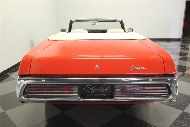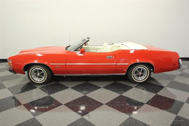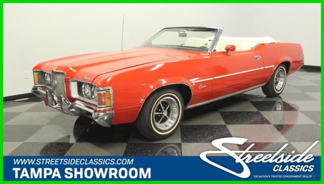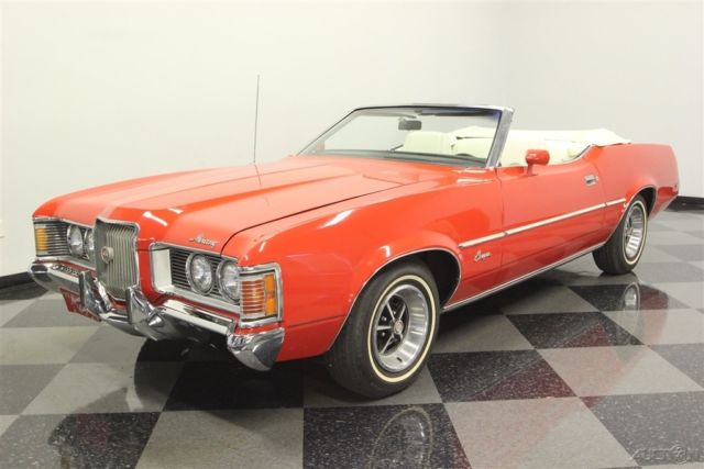 So you want a drop top convertible, but you also want something rare and luxurious? This 1972 Mercury Cougar XR7 convertible gives you all of this with V8 power and a value price. The Cougar was built to be a Mustang in a dinner jacket, and this red body with a refined white convertible top just seems to deliver on this sporty sophistication. This car has spent a life as a cherished driver, so you have good gloss and nice panels - exactly what you want is an eye-catching classic. And you'll love the details like the white rub strip that matches the convertible top, and the sporty Mag wheels with proper Mercury center caps. This was part of a grand tradition at Mercury of offering serious style, and you see it everywhere from the waterfall grille to the form-fitting rear bumper with integrated lights. And despite this appeal, the upscale XR7 convertible is quite rare - with barely over 1,900 example produced this year. And how many do you think survived to look this good? If you like the look of the white roof, then with the flip of a switch, you'll love to power it down and show off the interior. The XR7 package was the top of the line for the Cougar, so you can certainly expect this one to be loaded. It starts with the high back bucket seats that are all-day comfortable. Those who have driven Mustangs from this era will find something familiar about the layout of this Cougar, except there's an added premium feeling. For example, you still have the same sporty sloping center console and dashboard setup, but now there's more wood trim and a substantially larger gauge package with tachometer. And this really feels like a well-preserved time capsule, even in the features - from the AM/FM stereo to the factory air conditioning. Open the hood and you'll see an engine bay that looks quite correct. The first thing you'll notice is the big blue air cleaner on the Cleveland 351 V8 motor that still has its original-style tags. Often this would have been replaced with a chrome unit, but that wouldn't be right on such a well-presented Mercury. And the V8 is not just there for all-out power, but also it's part of a confident driving package. Add in the three-speed automatic transmission, power steering, and front disc brakes, and this is the convertible that's easy for any day of the week. You're looking at well-preserved history. In fact, it's believed this has only had two owners and was always garage-kept. That makes this value-priced classic droptop a true legacy you can join...but only if you're first to grab this deal. Call today!!!