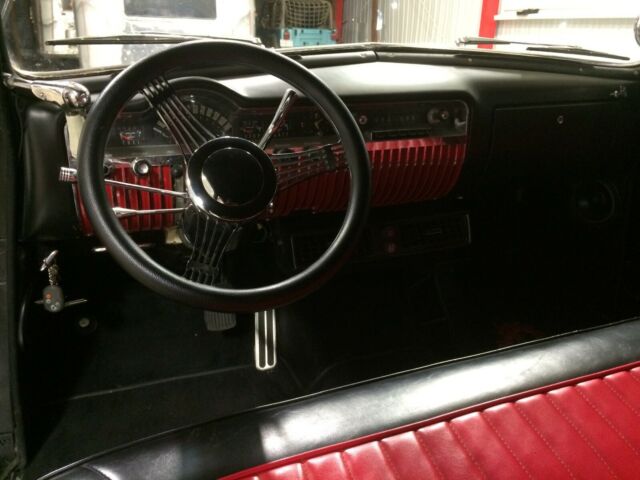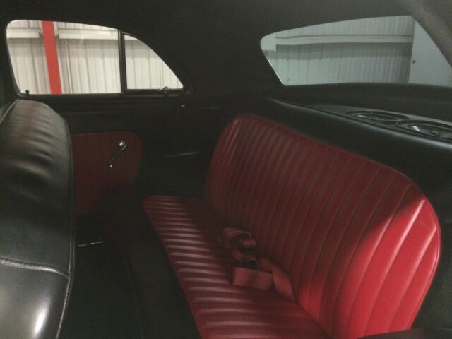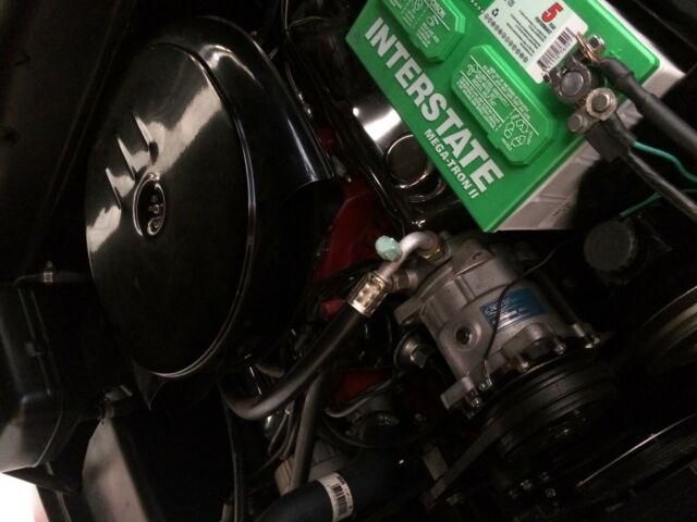 The interior has the vintage seats re-upholstered in black and red leather. The original dash was restored and all the gauges updated. The vintage look AC blows hard and cold. The scuff plates were just replaced.