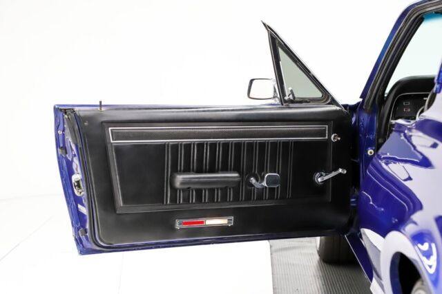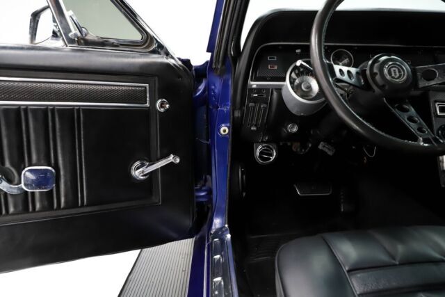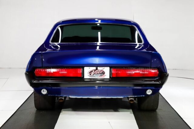 EXTERIOR: The body looks to be in excellent shape. The body lines are nice, it's straight. No emblems for a clean look. It has a fiberglass dovetail trunk lid and endcaps, big scoop on the hood and hood pins. The Cobalt blue is a gorgeous color. It has a glossy finish. Jambs are painted glossy, weatherstrips were replaced. The bumpers have been blacked out, the grill has been custom made so the headlights shine through. 17 inch American Muscle wheels with performance tires, a little bit meatier in back.