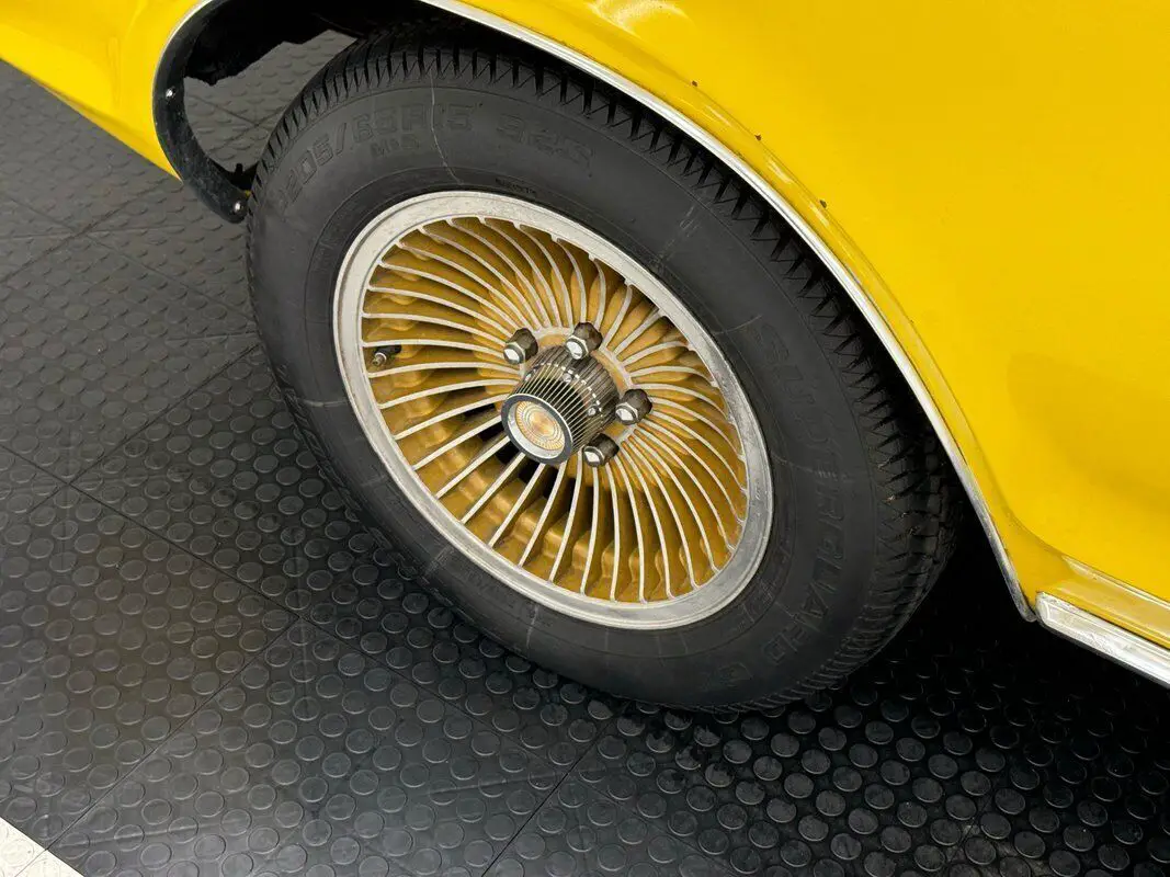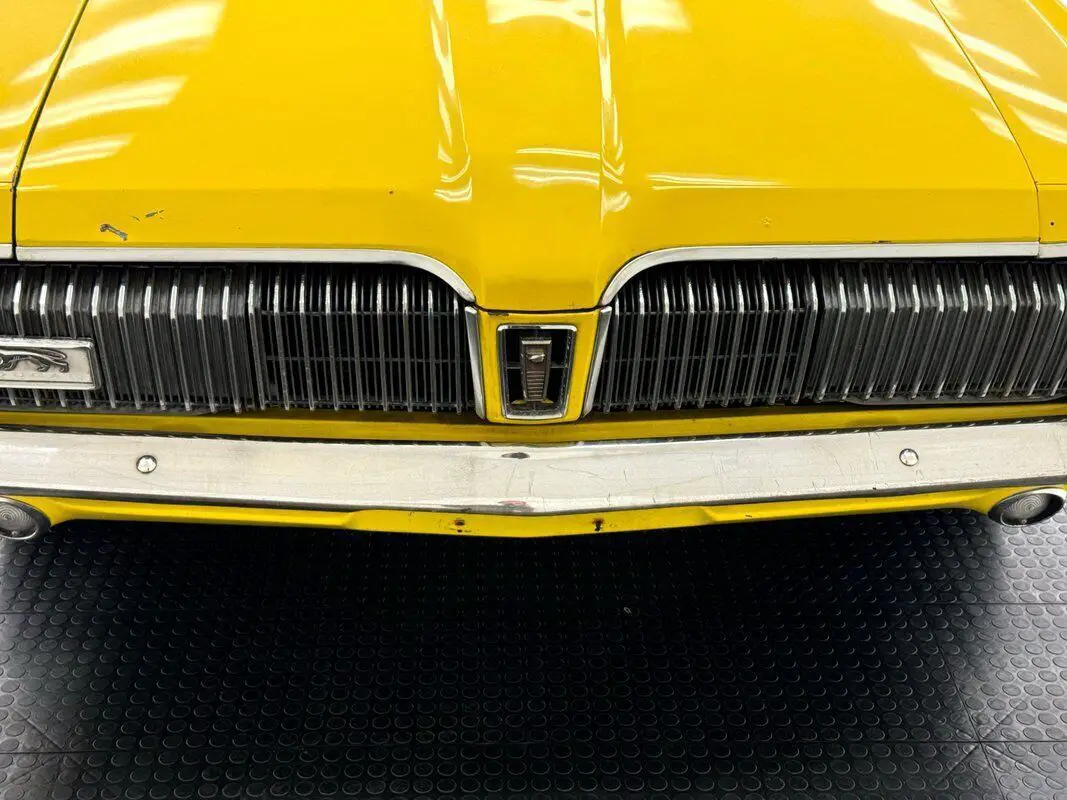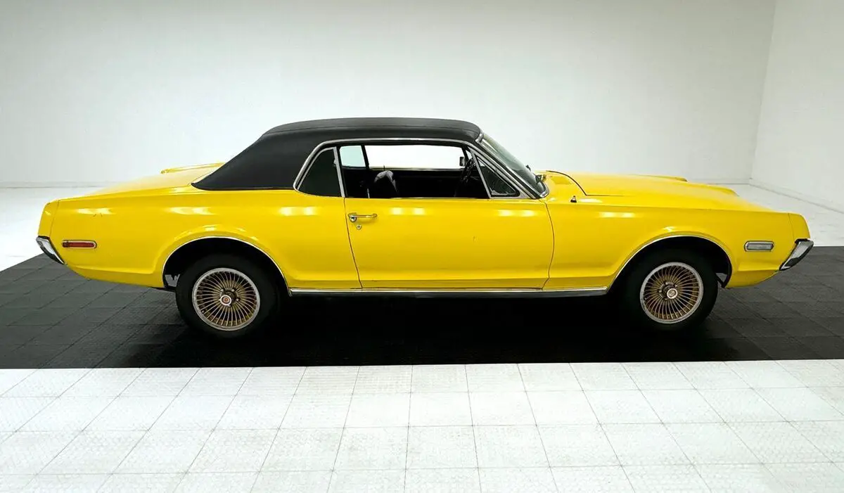 You can't miss this cat coming down the street and not just because of its classic lines. That yellow paint is bright with a capital B and is contrasted nicely by the black fill between the bright trim of the grille and headlight covers, the vinyl top, and of course the tires riding on 15-inch gold accented hurricane wheels. In a conscious design choice, the car's tail lights mimic the front and span nearly as far, interrupted only by the space for the license plate. It's here where the Mustang lines are evident and the valance mounted reverse lights bring the point home, forget Jaguar, this was Mercury's Mustang! The profile lacks some of the dress up bits from the Mustang and the Cougar was marketed as a luxury sports car, so removing those add ons tamed its exterior profile. There's nothing left on the side but sizable side markers while a Cougar emblem is planted on a front headlight cover. Some of the brightwork will need refurbishing, but the vinyl top seems to be in great shape. Imperfections include rust at the pinch weld below the rocker panel, various sizable paint chips, porous and uneven filler, and numerous spots of bubbling.