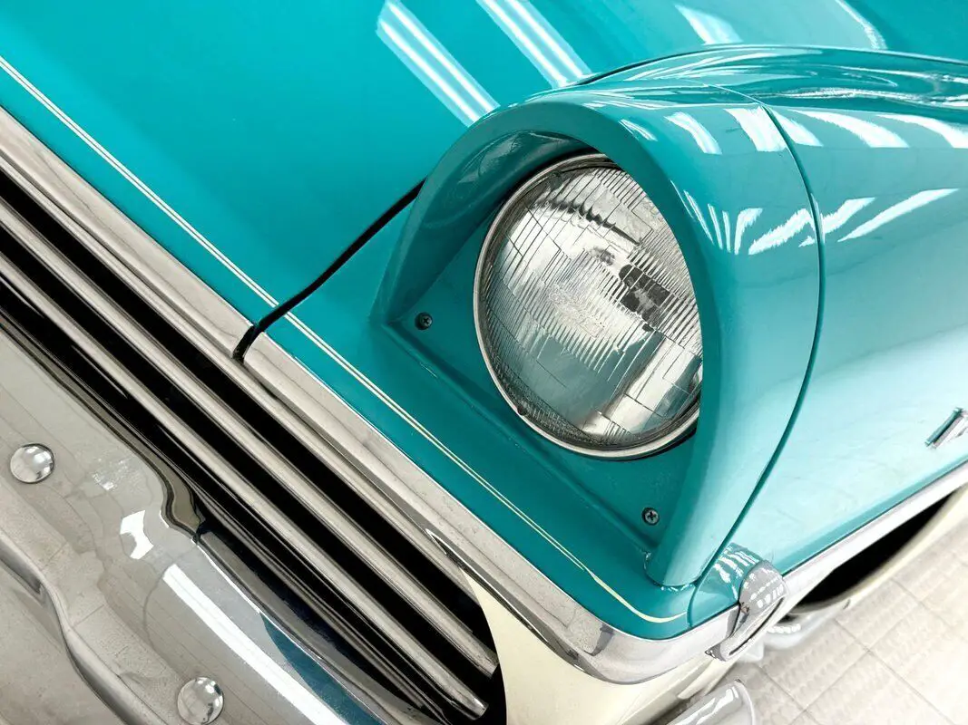 Sharp angles reappear on the door panels where metal trim separates white panels from the turquoise one and both of the big doors are in good shape. A vinyl split bench wraps turquoise vinyl around cloth green inserts over a white base and the pattern is mirrored in the back bench in fine, fifties fashion. A white plastic steering wheel is in good condition and leads to the V-shaped gauge cluster with arching gauges in tiered, delineated rows. Switchgear is metallic and robust, and the center AM radio sits adjacent to a square clock that looks like something out of a country kitchen. Our spider reappears on the floor mounted shifter which rises from the hump covered with turquoise loop carpet showing a bit of usage. The turquoise headliner is in great shape and the trunk is completely lined in a plaid mat and houses a spare.