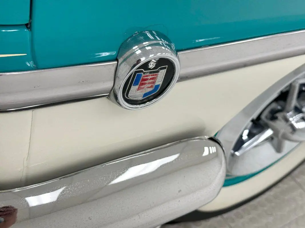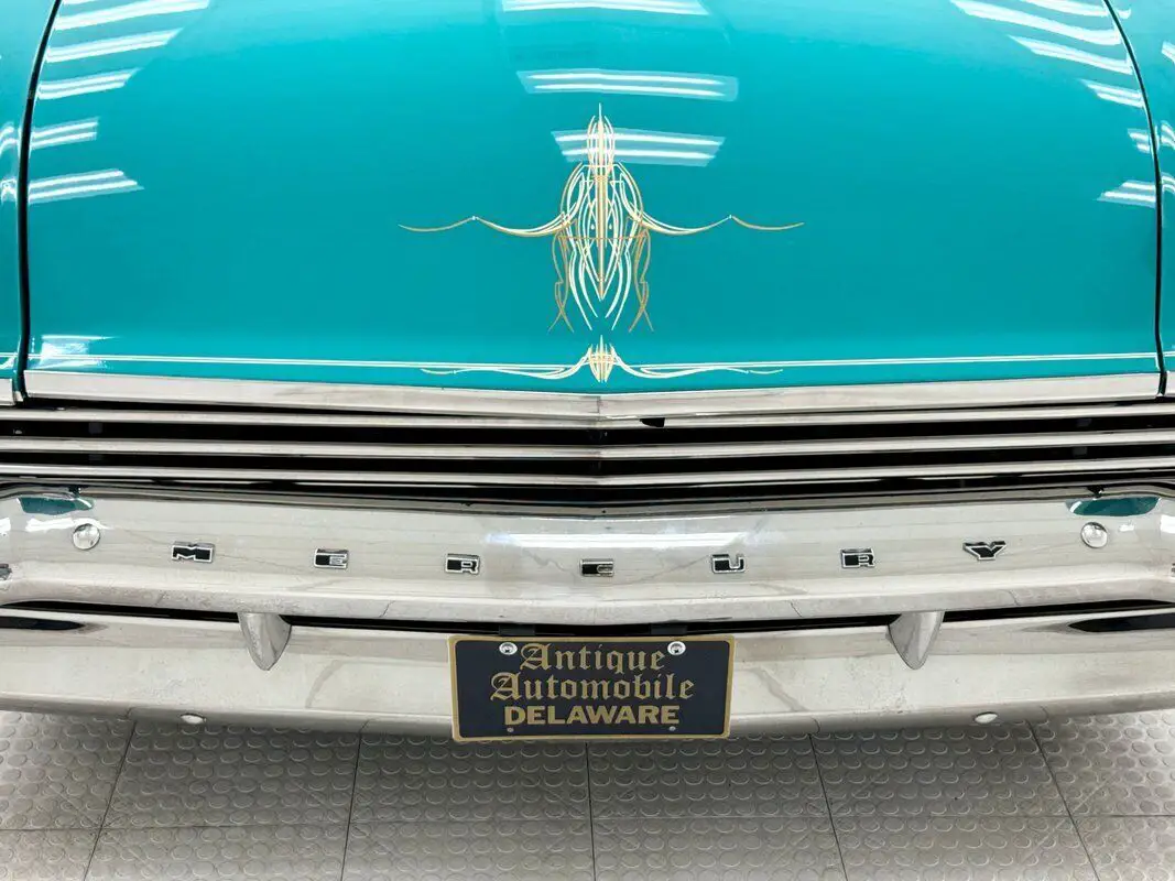Verona Green is sandwiched between panels of Classic White, separated on the body by an ornate and unique side molding is a combination of straight lines, louvered accents, sweeping curved lines, and an integrated gravel guard. There were plenty of bi-colored cars in the 50's but the separation was never as bold as the Monterey's. The roof wears the white and is framed in robust polished metal trim and window frames. Mercurys are known for their use of chrome up front, and this one is no exception with thick crossbars under thinner bars of the grille which travel from one side to the other. Circular ducts added to the hood actually function to bring air into the engine bay which is flanked by two spotlights affixed to the cowl. More chrome is found in the faux side pipes and the rear bumper and bumper bars just under chrome rimmed taillight that are artful ovals. The car has pinstriping and a painted spider on the front fender that had us pause for a second. The paint and metal are great on the car and no noticeable flaws were detected.