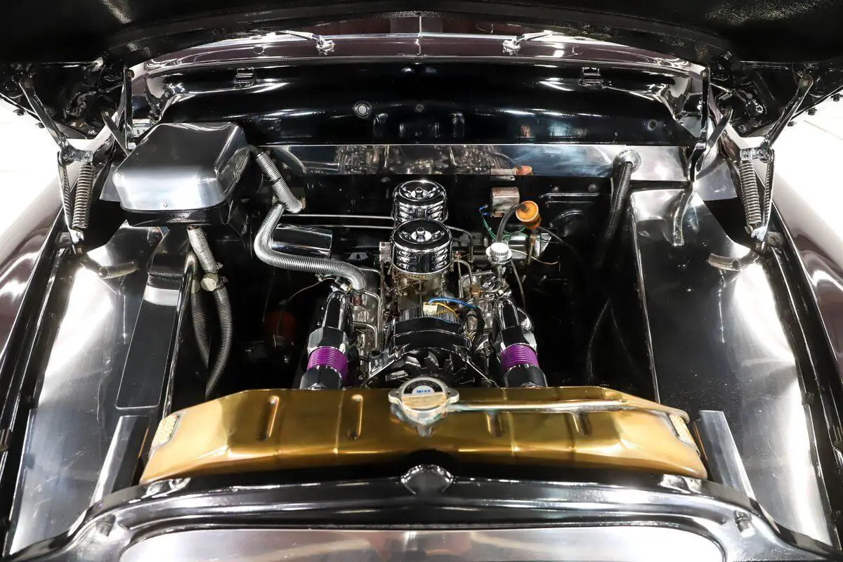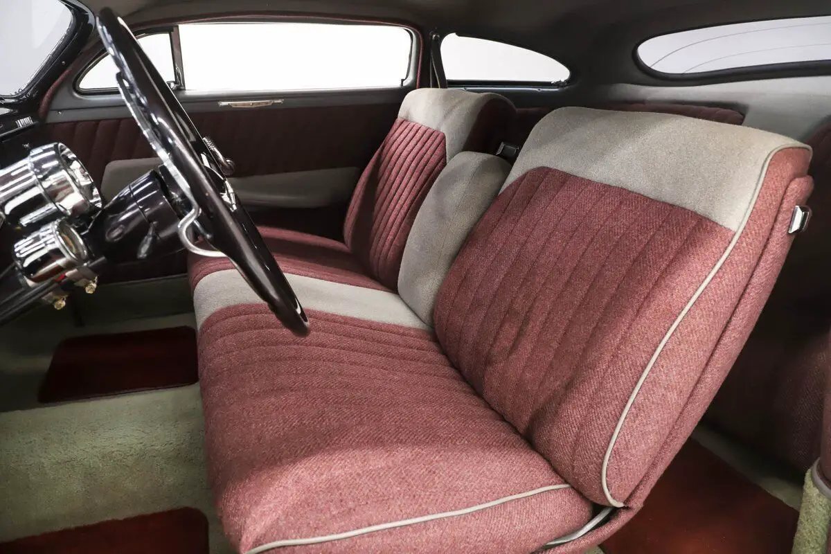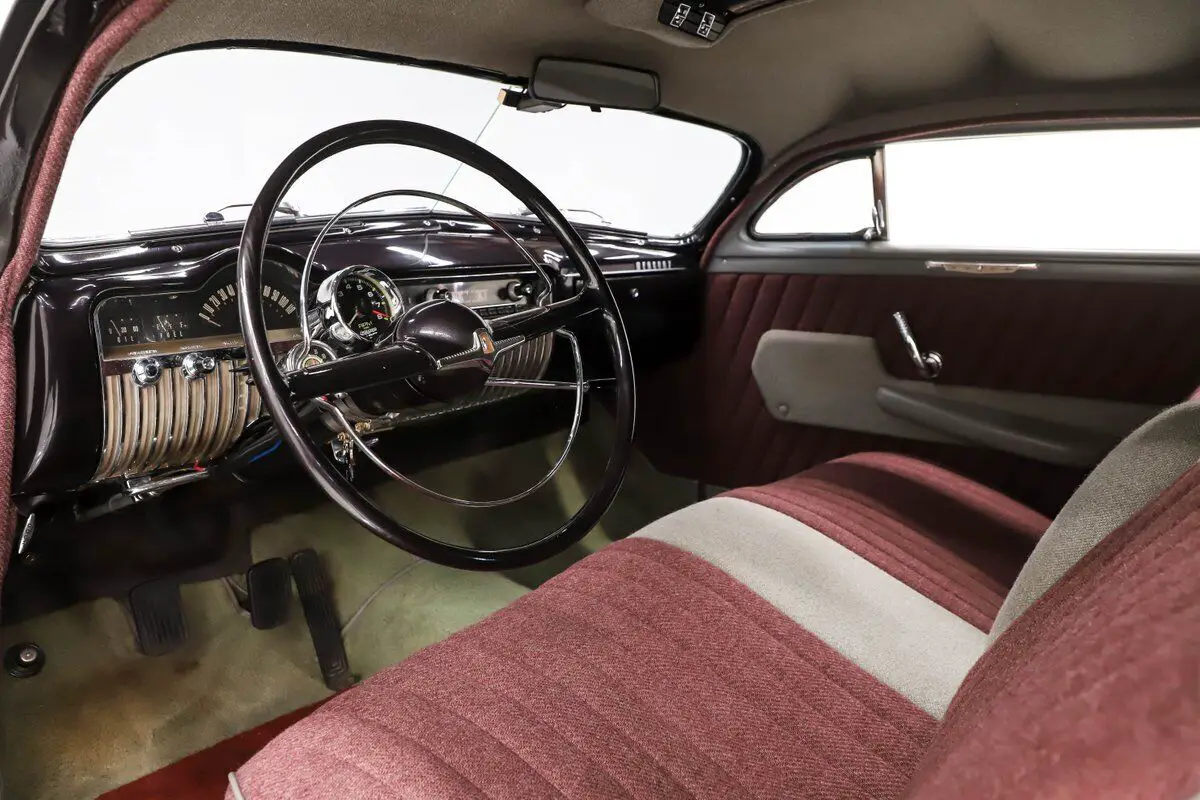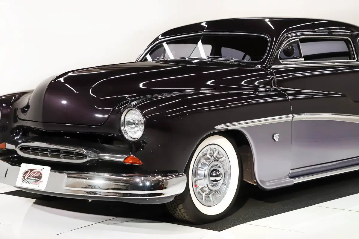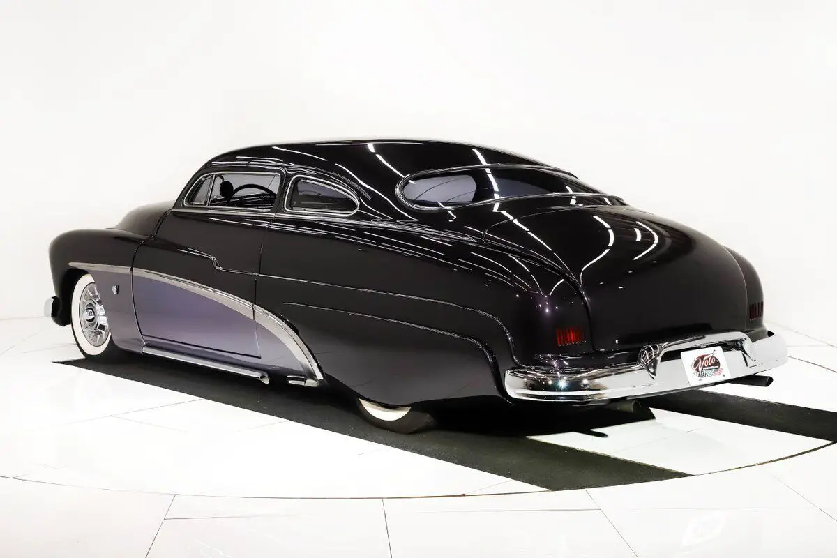 EXTERIOR: Extensive bespoke body modifications! There is so much more custom work than meets the eye. The top was chopped 4 inches. The hood, trunk and doors were shaved, plus all the corners were rounded. First time I have seen Mercury emblems on the fenders act as door poppers. The lakes pipes were custom molded into the body. The grill shell and front pan were molded. The headlights were frenched, and parking lights were removed. The turn signals are integrated in the Pontiac grill that was lengthened by 10 inches. The front bumper and the bumper guards were removed, the holes were filled, and it was chromed. Custom bubble fender skirts that have a rolled top edge and 3 teeth were added in the front scoop. The taillights are custom made and the rear pan was molded. The rear bumper was smoothed and has Pontiac bumper guards. The antenna was removed, and the gas door was filled in. It has 1953 Buick side moldings and a beautiful custom mixed Grape and Lavender paint job with a urethane clear coat. Very practical v-but windshield plus working vent and rear 1/4 windows. Cadillac sombrero hubcaps with bullet centers sitting on classic wide whitewall radial tires.