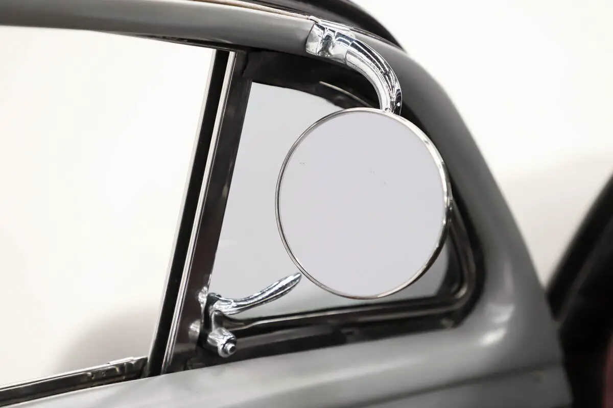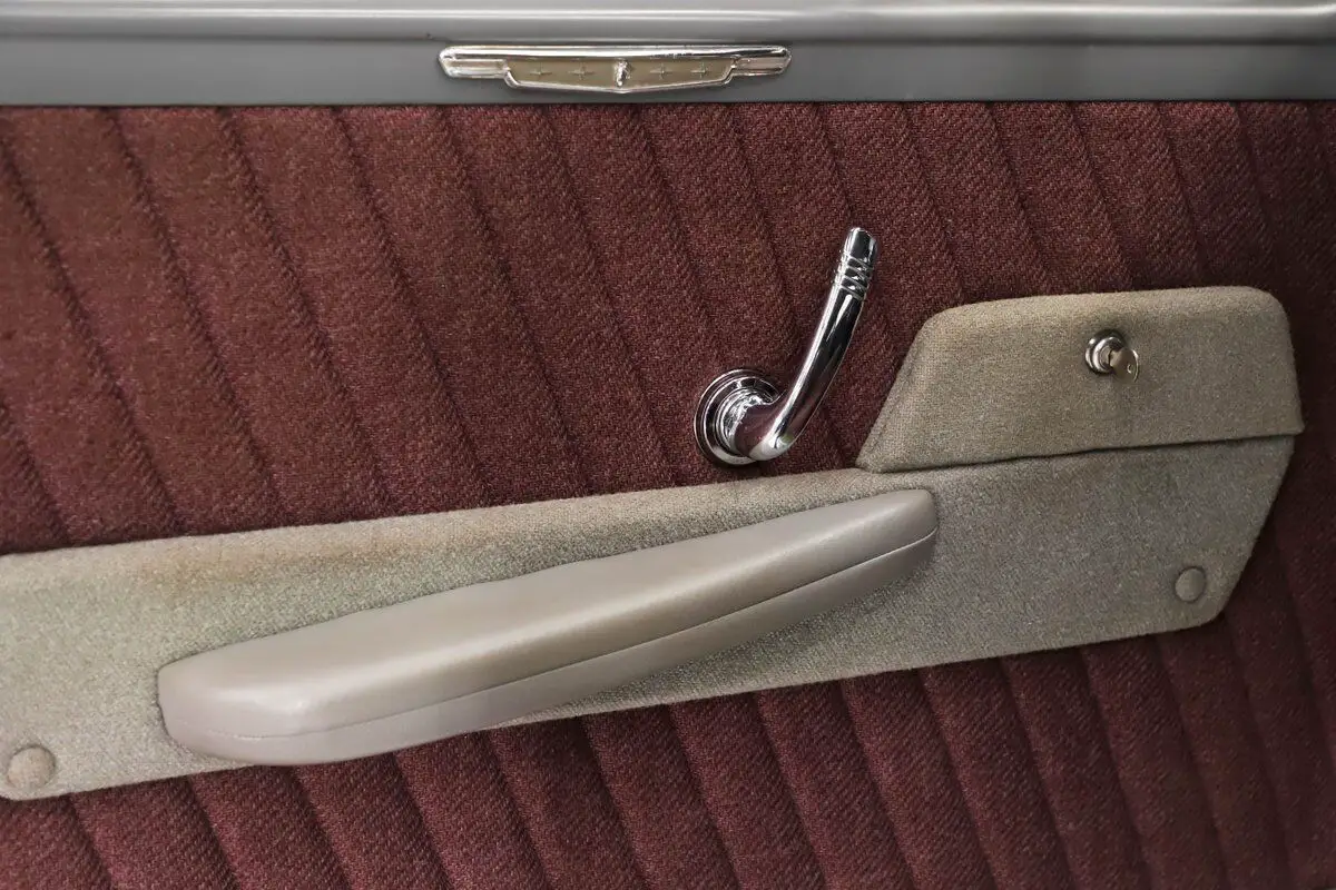 INTERIOR: It's a custom Interior by Kasper! Up front is a power Cadillac bench, and in back is a wraparound Thunderbird seat. Both seats have a fold down arm rest. The stereo is cleverly hidden in the driver's door panel and has a hidden antenna too. Courtesy lights are also hidden under the rear seat. The overhead console has power window switches and map light. On the column is a tachometer, vintage Stewart Warner amp and oil gauge. 3 on the tree manual shifter. The custom mounted side view mirror is much more useful than expected. This interior is just as comfortable as it is beautiful!