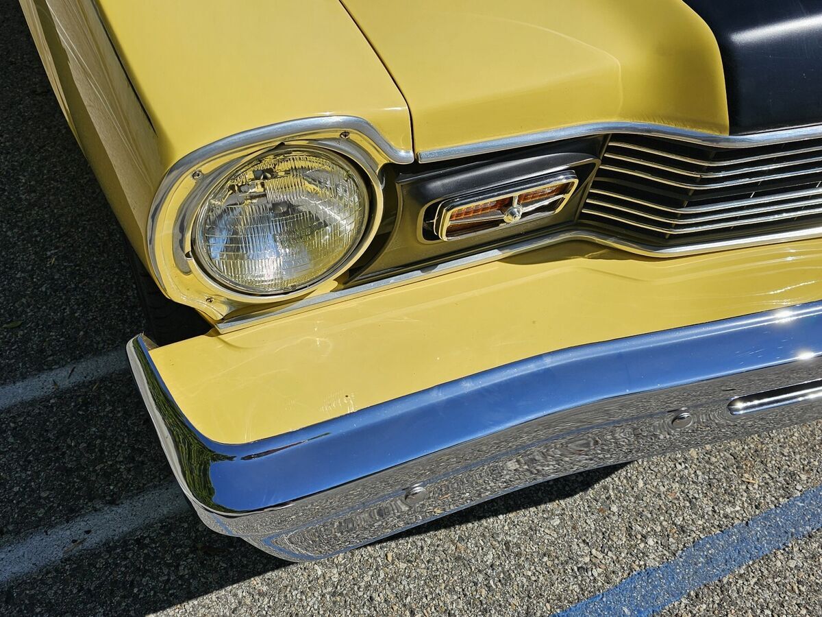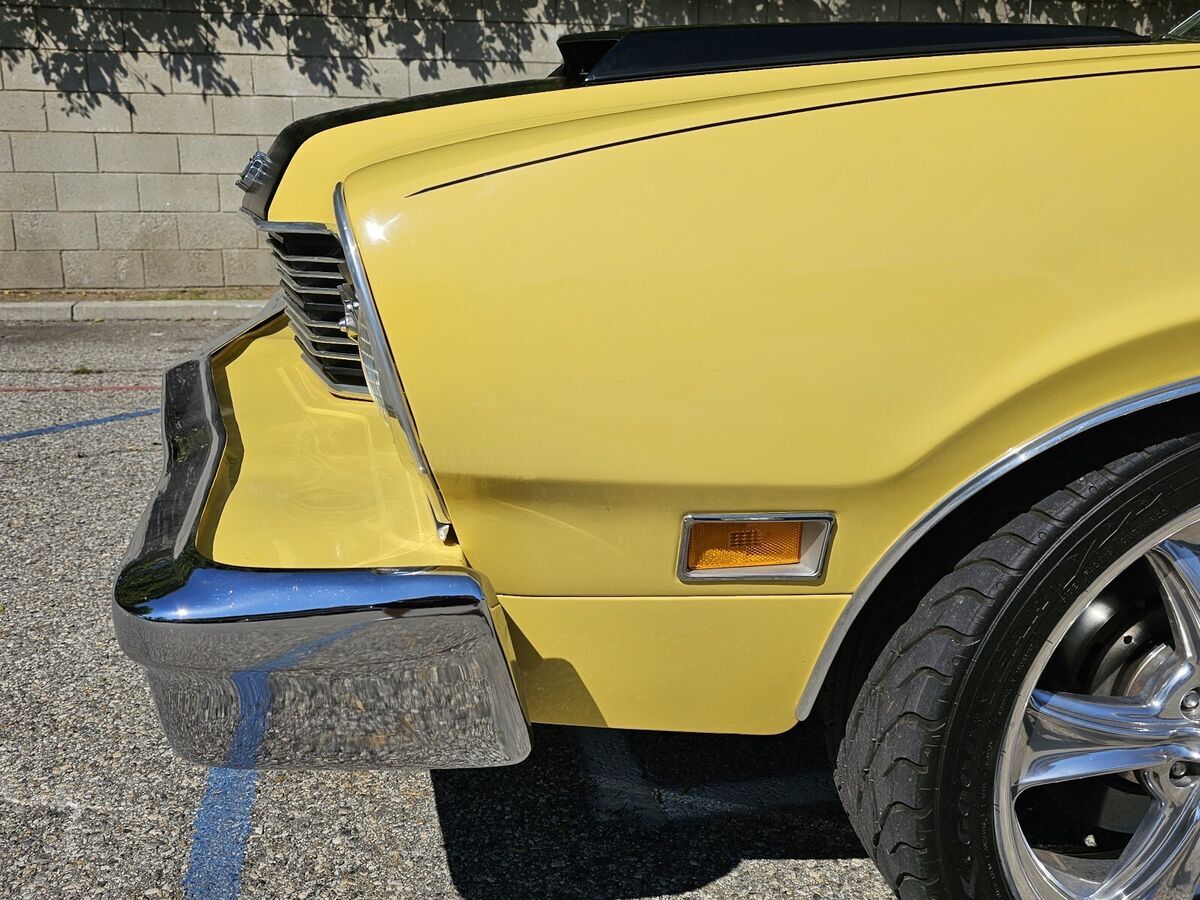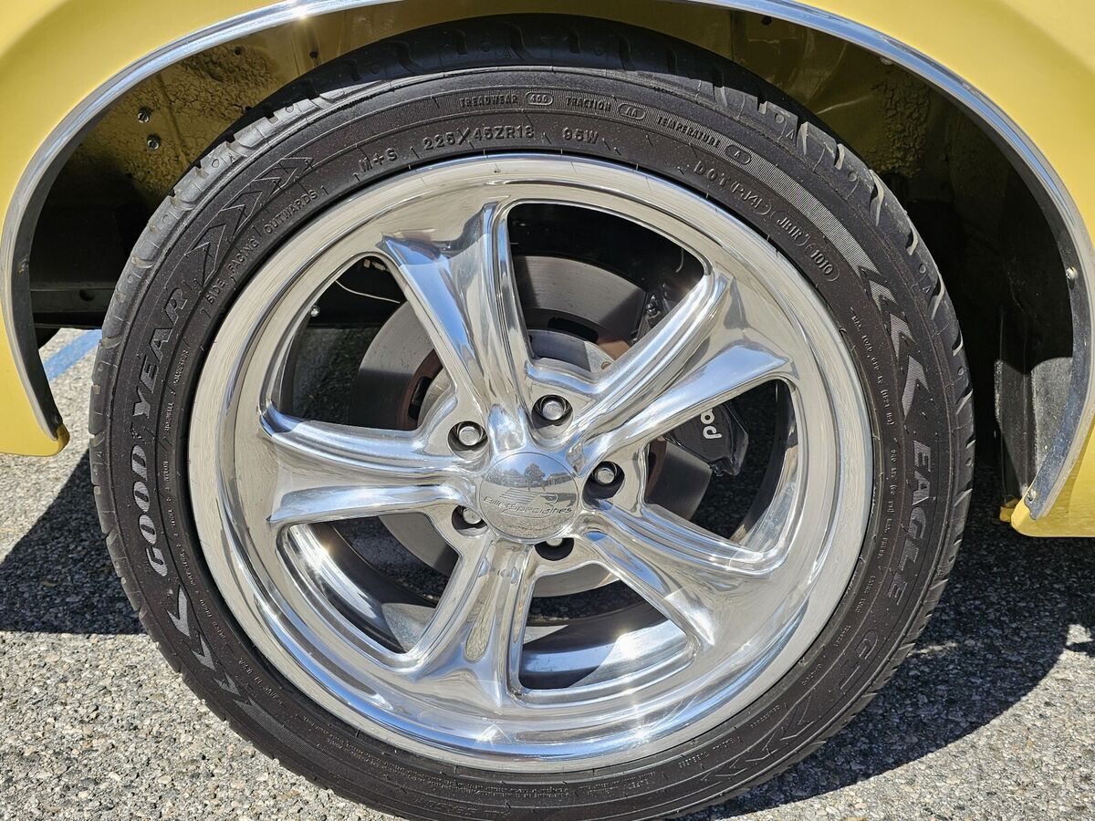 The exterior of this car has been completely disassembled and restored to the condition that you see it in now his body was a bare metal respray 100 of hours block sanding and aligning body panels potty is laser straight quality two-stage PPG paint on a non-metallic yellow lots of clear color sand and Polished to show quality all jams are finished like the rest of the car all Chrome has been replayed All Glass rubber stripping and trim also do car sits on 18-in billet wheels with new Goodyear tires Tires and also features a four wheel wood disc brake, frame has been Boxed, upgraded sway bars with all polyurethane bushings inch dual exhaust with Cooks long tube headers conversion with a larger master power booster car stops excellent power comes from an apex 4.9 l 3 valve Ford motor delivery 480 horsepower to the rear wheels through a Mustang 5 speed transmission car has Vintage Air and Heat interior has been redone to the condition that you see it in now with everything new upgraded stereo coilover suspension dual exhaust Cooks long tube headers lots of little add-ons motor compartment car drives cool tight and balanced hiets front end