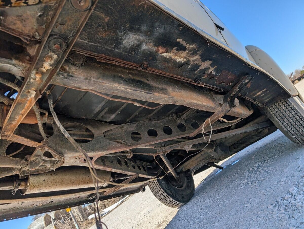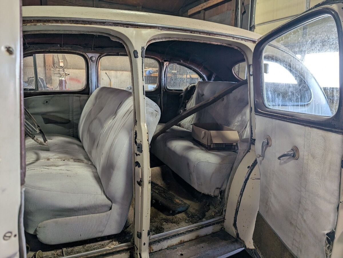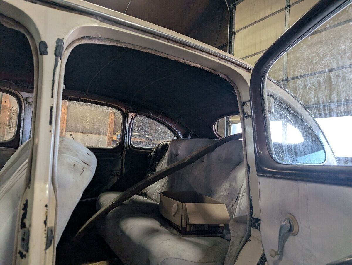 Interior. Rough around the edges as shown. Really doesn't smell. Floors are solid! Have miscellaneous hardware, handles, clock, window cranks. Glass in pretty good shape. Have rear window and seal.