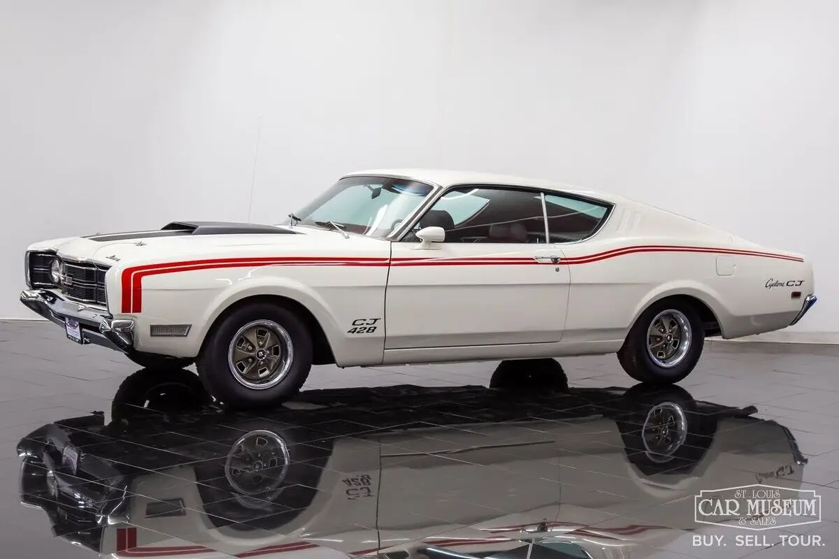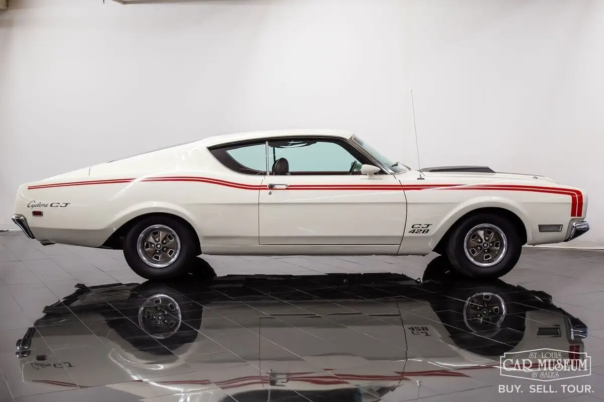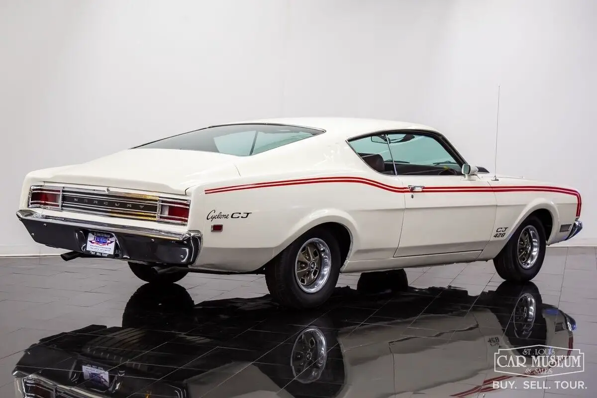 Details about our available 1969 Mercury Cyclone: This sharp, 1969 Mercury Cyclone CJ Fastback for sale is finished in factory code correct White over original Dark Red Vinyl interior and comes with its appointed 428ci Cobra Jet V8 along with optional factory Ram Air Induction. This addition includes forward hood pins, Whisper-Aire air conditioning, Select-Shift C6 automatic transmission, power front disc brakes, power steering, AM/FM Stereo radio with rear speakers; Sports Appearance Group to include color-keyed outside racing mirrors, driver side remote adjustment, bucket seats with center console; all tinted window glass, styled steel wheels, and dash tachometer! It was even originally equipped with very rare rocker panel moldings, that were not reinstalled after a recent repaint of the exterior. Exactly 200 of the 2,175 Cyclone CJs were painted white, and 105 of those had the Dark Red vinyl bucket seat interior, like the example seen here. Considering the list of impressive options that came on this car, we are extremely confident there is no other example like it! Built late in the 1969 production season, this particular Mercury Cyclone was finalized at the Lorain, OH plant on June 17th,1969, and delivered new to its first owner on June 23rd,1969, indicating it was special ordered. The selling dealer was Willett Lincoln-Mercury based in Decatur, Georgia where it started life in the dry southeast. It was most recently located in North Carolina with its former owner. Upon arrival at the St. Louis Car Museum, this beautiful muscle car was thoroughly inspected and treated to a comprehensive service including replacement of the gas tank, sending unit, filler hose, and mounting hardware; new front wheel bearings & seals; new brake rotors, rear shoes/drums/brake cylinders, along with a brake fluid flush; new spark plugs/wires, distributor cap, rotor, & condenser; new heater core, hoses, & new coolant system; fresh engine oil/filter; rebuilt power steering cylinder with new hoses, idler arm bushing, upper control arms, lower ball joints, and tie rod ends; new air conditioning expansion valve and evaporator along with evacuating and charging the system with R134a refrigerant; replaced rear axle gear oil, and installed a new air cleaner. It already has a newer Holley 770cfm carburetor installed that has been properly tuned and is in excellent condition making this Cyclone Cobra Jet ready for proper use once again. The exhaust system and tires were replaced by the former owner in approximately 2023. This very special classic Mercury is truly a one-of-one with its incredible list of factory options! A Deluxe Marti Report is provided with the car and included in our photos above. It easily proves to be a terrific muscle car investment and an equally solid weekend driver! With only a partial restoration, it retains many original attributes, supporting that this CJ has had a well-kept, garaged lifestyle since new. Contact Jon Faust at 855-586-3413 to schedule a test drive. History of Mercury's Cyclone CJ428: Produced for only one year, the 1969 Cyclone CJ was Mercury's answer to the Plymouth Road Runner and Dodge Super Bee, not to mention its counterpart from Ford. It was a stripped down, performance-inspired Fastback model intended to attract horsepower junkies. They would be equipped with a 428 Cobra Jet as standard, along with dual exhaust, Competition Handling Package with heavy duty springs/shocks, blacked out grill treatment, engine dress-up kit, hood stripes, and Traction-Lok 9" rear axle. All other equipment features were left as optional. Whisper-Aire air conditioning was only available on CJs with an automatic transmission and a 3.00:1 Traction-Lok rear axle. Drivers wanting a four-speed and higher axle ratios would need to find another way to keep cool in the summer months. Given a slight reduction in performance with the taller gears and automatic transmission, along with a cost of more than 10 percent of the base CJ price, it's no surprise that air conditioning ended up a rarely selected option. Only 2,175 Cyclone CJ's were produced that year, making them exceedingly rare to find today. Finding one with this long list of additional options is nearly impossible! Contact Jon Faust to schedule a test drive or to ask about financing and trading options - 855-586-3413 | email