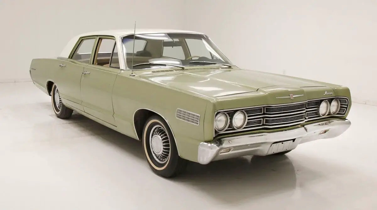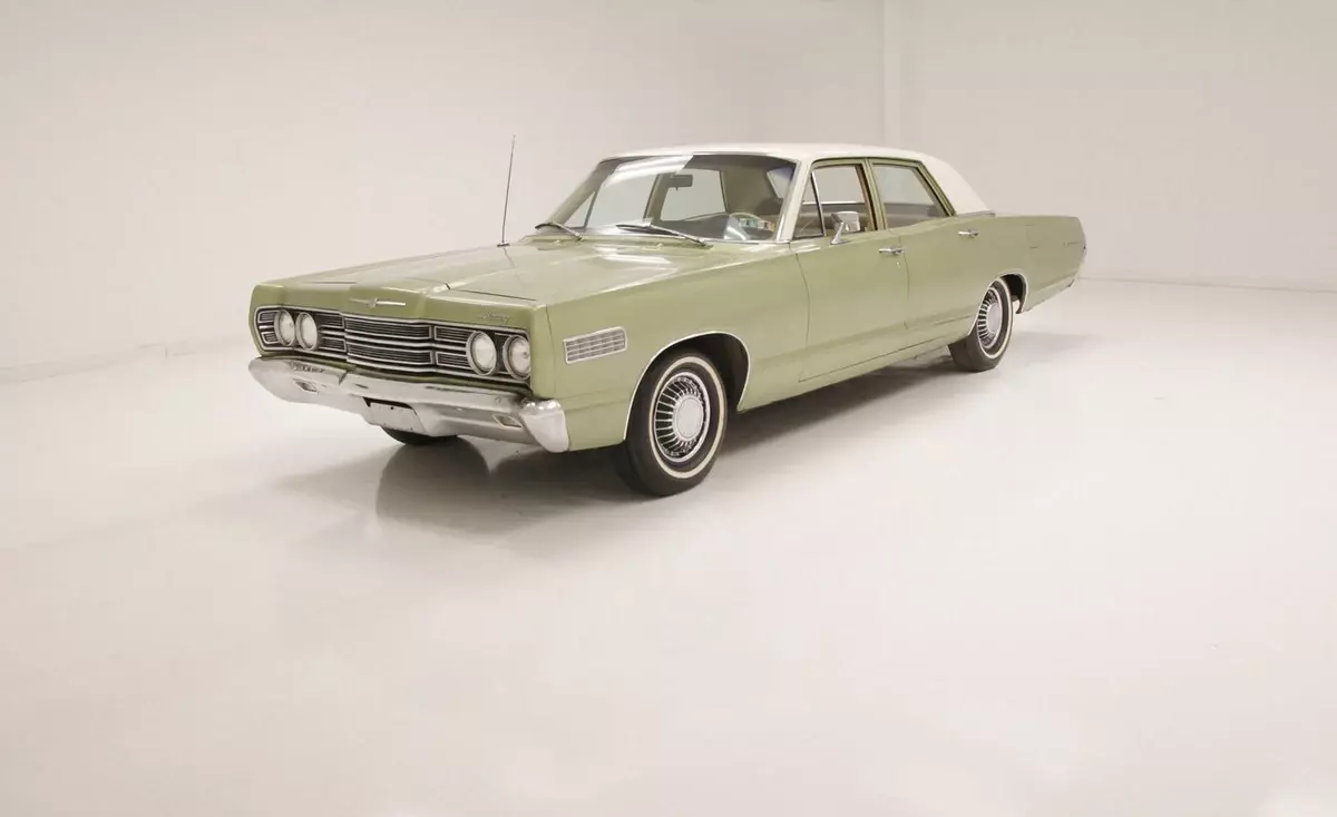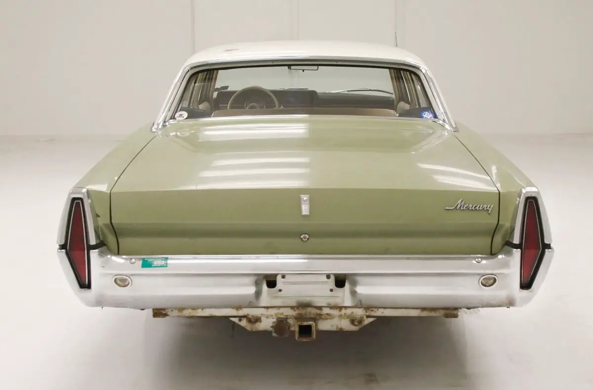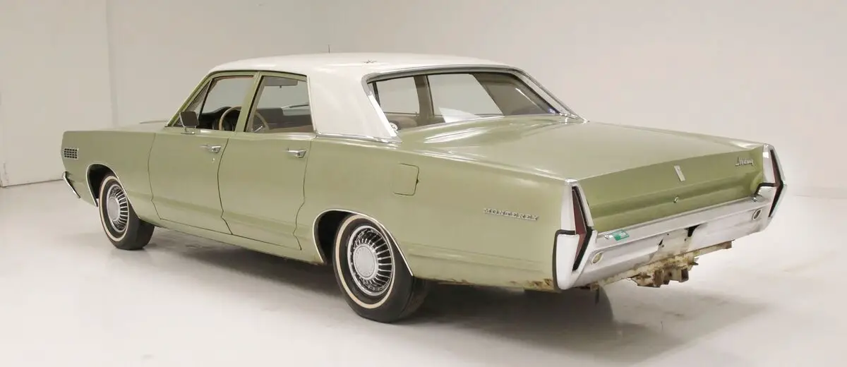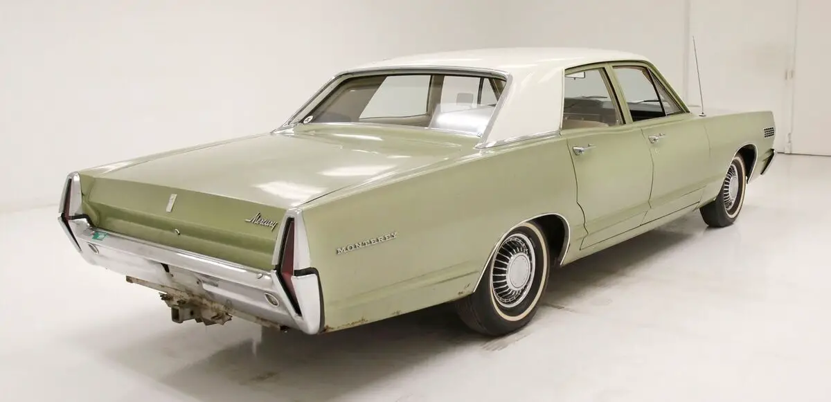 1967 Mercury Monterey The Mercury Monterey is a series of full sized cars that were manufactured by the Mercury division of Ford from 1952 to 1974. Deriving its name from Monterey Bay, the Mercury Monterey served as a replacement for the Mercury Eight, the debut model line of the Mercury Division. During its production the Monterey would be offered in multiple body styles, ranging from coupes, convertible, station wagons, sedans, and hardtops. Following the 1974 model year, Mercury discontinued the Monterey nameplate, consolidating its full size line down to the Marquis and Colony Park station wagon. This 1968 Mercury 4-door hardtop allows you to experience the suburban side of life that was the mid to late 1960's in Anytown, USA. Seemingly pulled from storage and given a once over, this car can serve as a great father/son project or even an affordable project car for someone who wants to learn the ropes wrenching on a classic. Exterior Lime Metallic, in worn condition showing chips, dings, nicks and some rust but retains some of its original shine, is the paint color for the lower body of this Monterey. A white painted top is on and shines well but does have some rust staining, particularly toward the rear of the roof. The chrome bumpers are nice and straight but suffer from some tarnish and staining. All brightwork, correct badging, and exterior lighting are in good condition. Gaps are a bit funky at places but overall, within acceptable tolerances just not perfect alignment. A sizable dent is noted just in front of the fuel filler door and invasive rust is starting both fore and aft of each rear wheel. Elongated diamond shaped vertical tail lighting, which is iconic to this car, is seen on the back and integrates with the rear bumper. Turbine style wheel covers with a central Mercury badge are on all 4 corners and are wrapped in thin whitewall bias ply tires. Interior A swing of any of the well-balanced doors reveal parchment vinyl panels with eye catching embossments and a nice faux mesh insert. Each panel has varying degrees of wear and soiling but no tears. The original cut and sewn faded black carpet flood the floors and is protected by a black rubber mat. The bench seat up front shows smooth parchment vinyl boosters and nice cloth inserts, and the rear bench follows suit. All seating areas show soiling and water staining, particularly in the cloth insert areas. The black and chrome ribbed dash is in nice condition and houses all the essentials. An aftermarket AM/FM/Cassette stereo has been added and a crack free black padded topper completes the dash. Even in the trunk all is factory appearing with minimal rust. Drivetrain Bright blue valve coverings and an air cleaner assembly grace the 390ci V8 with a 2bbl carburetor is perched on top. This engine rests within an unrestored patina riddled engine bay. Bolted to the back is a C6 3-speed automatic transmission and putting the power to the ground is a Ford 9" rear axle weighing in with a 2.75 ratio. Undercarriage Some surface rust coats the undercarriage, but it remains structurally sound and invasive rust free. A trailer hitch and wiring have been added to the back of the frame for all your hauling needs. Independent coil springs for the front and a 4 link with coil springs for the back along with power drum brakes on all 4 corners can be seen underneath. A single exhaust system with a stock style muffler is in charge of expelling spent fumes and shows with surface rust throughout. Drive-Ability She fired right up and idled well. The first thing we always check before heading to the test track are the brakes. In this case, the pedal went to the floor. Our consignor has an appointment scheduled for next week to have the brake system repaired. More information will be provided upon return. Overall this car presents honestly and is mostly original. The 1960's were not all 2 door muscle cars and back door experiments from the Big 3. The average neighborhood had its share of 4 door haulers and grocery getters so it's nice to see one still around. With some spit shining and polishing you can have a cruiser to be proud of without breaking the bank. VIN DECODE 7Z44H580708 7-1967 Z-St. Louis, MO Assy Plant 44-Monterey 4 Door Sedan H-390ci V8 2bbl 580708-Sequential Unit Number WARRANTY TAG BODY 54A-Monterey 4 Door Sedan COLOR IM-Lime Metallic, White TRIM IU-Parchment Cloth & Vinyl DATE 18D-April 18th Build DSO 16-Philadelphia AXLE 8-Ford 9" 2.75 Conventional TRANS U-C6 Automatic