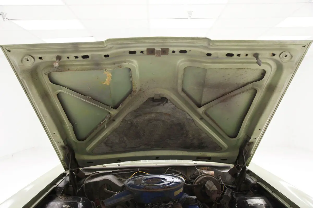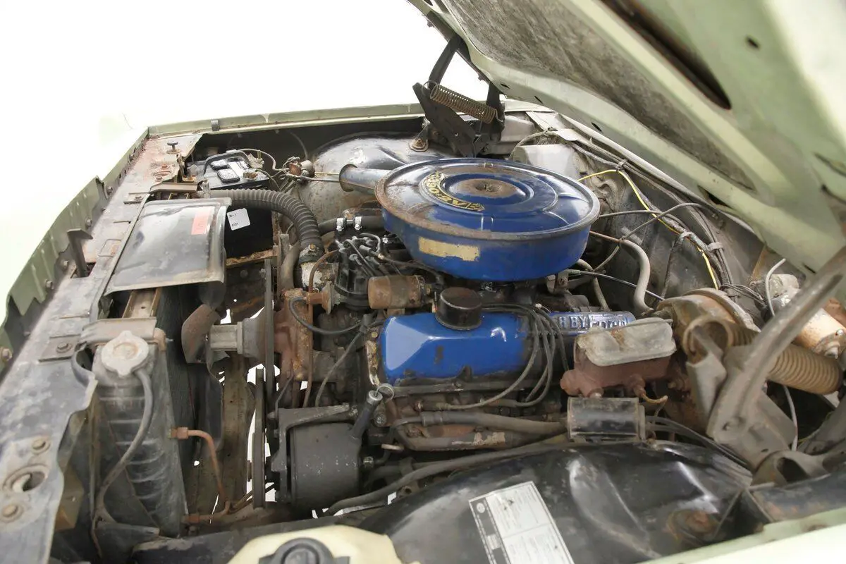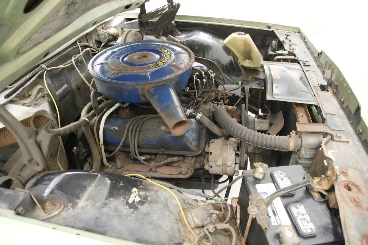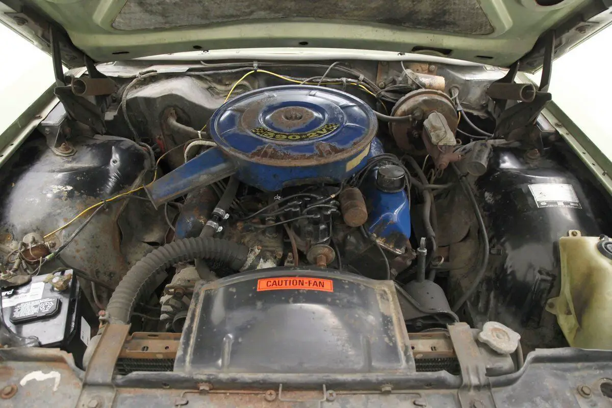 Bright blue valve coverings and an air cleaner assembly grace the 390ci V8 with a 2bbl carburetor is perched on top. This engine rests within an unrestored patina riddled engine bay. Bolted to the back is a C6 3-speed automatic transmission and putting the power to the ground is a Ford 9" rear axle weighing in with a 2.75 ratio.