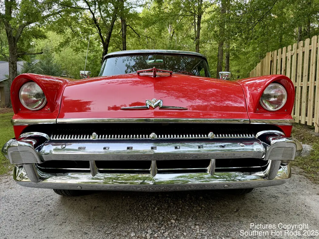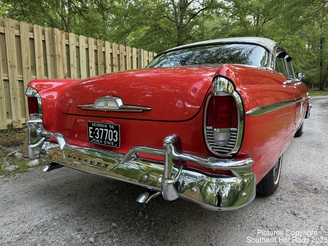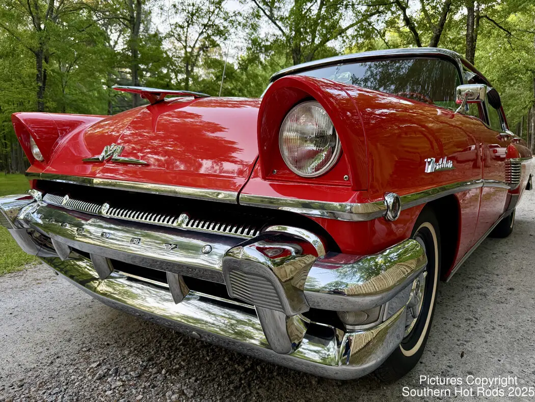 The engine is the factory original, advanced, short stroke, low friction design, one-piece, 312c.i. V-8 block. These Y-Block motors were built with deep skirt crankcase, precision molded crankshaft with 5 selectively fitted main bearings, rubber-floated vibration damper, wedge-shaped (high turbulence) combustion chamber, solid-skirt aluminum alloy pistons with embedded steel struts, and free breathing intake and exhaust. This Mercury still retains its Holley 4000 Teapot carburetor.