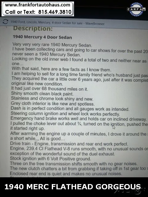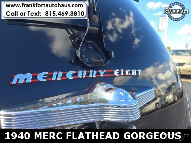 1940 Mercury , 4 door Flathead V/8 RWD 3spd Black Want to learn more? Frankfort Auto Haus is a family owned dealership established since 1978. I personally buy and drive every vehicle I sell, one of the reasons I have been in business over 40 years and have 1000's of happy customers. Every vehicle I sell comes with a free car fax vehicle history report available on our website www.frankfortautohaus.com . We can arrange low cost financing and shipping to your door worldwide. Visit us today at 19915 s. La Grange Road,Frankfor, Il 60423. (30 min south of Chicago). Contact Information: TEXT or CALL us at 815-469-3810.
