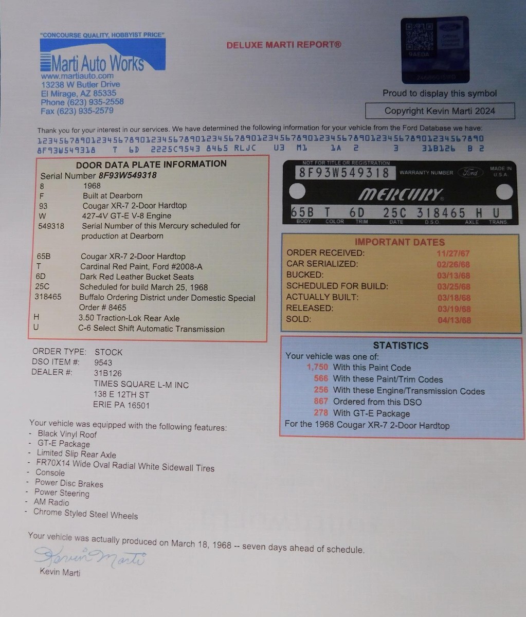 427 side oiler Block C8AE-AEngine Tag 427 68 68 B C 362Distributor C8OF-12127-GIntake C7AE9425-F*Carburetor C8AF-9510-ADLIST-4088964* Cylinder Head C8AE 6090NUMBERS MATCHING Transmission C8APTransmission TagPGB WC11030The "W" Cat with big claws is the lucky recipient of a Rotisserie restoration to the highest level! This 1968 Mercury Cougar XR-7 7.0-Litre GT-E is one of 256 examples produced for the model year with a 427ci V8 paired with a three-speed automatic transmission. This Cougar XR-7 GT-E left the factory finished in Cardinal Red over Dark Red Leather upholstery. Equipment includes silver-colored lower trim, dark grille and taillight accents, covered headlights, a hood scoop, power steering, power brakes, and the Super Competition Handling Package. The car was delivered new to Times Square L-M INC of Erie, Pennsylvani, in March 1968. The car is said to have been refurbished under previous ownership. This W-code Cougar GT-E is now offered with an Deluxe Marti report and a clean Florida title in the seller’s name.The car was finished from the factory in Cardinal Red (2008-A) with silver-colored trim on its lower sections. Features include blacked-out grille and taillamp trim, hidden headlights, a simulated hood scoop, chrome bumpers, and quad exhaust pipes. Silver and chrome-plated styled steel wheels are mounted with (NEW) red-stripe BFGoodrich tires. The GT-E’s standard Super Competition Handling Package featured stiffer springs plus a larger-diameter sway bar, heavy-duty shock absorbers, and a 3.50:1 Traction-Lok axle ratio. A full-size spare wheel and tire are located in the trunk.The cabin features red leather seats with matching carpets and trim. Equipment includes a center console, a Philco AM radio, and a clock. A wood-rimmed tilting steering wheel fronts instrumentation that includes a 120-mph speedometer, a 6k-rpm tachometer, and gauges monitoring amperage, fuel level, and coolant temperature, while an oil-pressure gauge is mounted on the glovebox door. The five-digit odometer shows 79,449 miles.The 7.0-liter V8—alternately known as a 427 side-oiler—was rated at 390 horsepower and 460 lb-ft of torque when new and is fed by a Holley four-barrel carburetor. The lower block area is cross-bolted to the main-bearing caps, and the engine has a hydraulic camshaft, high-strength pistons and connecting rods, and heavy-duty valve springs. The oil was changed and fluids checked in preparation for the sale.Power is sent to the rear wheels through a Select-Shift Merc-O-Matic C6 three-speed automatic transmission. The Deluxe Marti report decodes the car’s trim tag and also documents selected features, build dates, and production numbers for XR-7 GT-E cars with the 427ci engine. A total of 256 GT-E Cougars were built for the 1968 model year.DOOR DATA PLATE INFORMATIONserial Number 8F93W5493188 1968F BUILT IN DEARBORN93 COUGAR XR-7 2 DOOR HARDTOPW 427-4V GT-E V-8 ENGINE549318 SERIAL # OF THIS MERCURY SCHEDULED FOR PRODUCTION @ DEARBORN65B COUGAR XR-7 2-DOOR HARDTOPT CARDINAL RED6D DARK RED LEATHER BUCKET SEATS25C SCHEDULED FOR BUILD MARCH 25, 1968318645 BUFFALO ORDERING DISTRICT UNDER DOMESTIC SPECIAL ORDER #8465H 3.50 TRACTION – LOK REAR AXLEU WITH C-6 SELECT SHIFT AUTOMATIC TRANSMISSIONORDER TYPE: STOCKDSO ITEM # 9543DEALER # 31B126TIMES SQUARE L-M INC138 E 12TH STREETERIE PA 16501EQUIPPED WITH THE FOLLOWING FEATURES- BLACK VINYL ROOFGTE PACKAGE- LIMITED SLIP REAR AXLE- FR70X14 WIDE OVAL RADIAL TIRES WHITE SIDEWALL TIRES- CONSOLE- POWER BRAKES- POWER STEERING- AM RADIO- CHROME STYLE WHEELS"IMPORTANT DATES"ORDER RECEIVED: 11/27/1967CAR SERIALIZED: 02/26/1968BUCKED: 03/13/1968SCHEDULED FOR BUILD: 03/25/1968ACTUALLY BUILT: 03/18/1968RELEASED: 03/19/1968SOLD: 04/13/1968THIS 1968 COUGAR XR7 IS ONE OF:1,750 WITH CARDINAL RED PAINT566 WITH CARDINAL RED PAINT WITH DARK RED LEATHER BUCKET SEATS256 WITH 427 ENGINE WITH C-6 SELECT SHIFT AUTOMATIC TRANSMISSION867 ORDERED FROM THIS DSO278 WITH GT-E PACKAGEThis is a rare opportunity to own a stunning example of a "W" code 1968 Mercury Cougar XR-7 GT-E 427 and the last car the Blue Oval put a 427 in from the factory! Everything on the car is working and functions as it should except the drivers door light. This car runs and drives fantastic and is a true part of MUSCLE car history.Call 314-346-6039 to purchase or with any questions.314-346-6039WE HAVE FINANCING WE HAVE FINANCING WE HAVE FINANCING