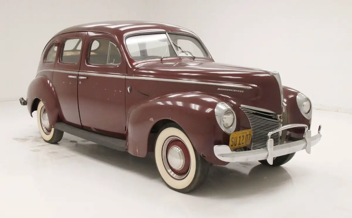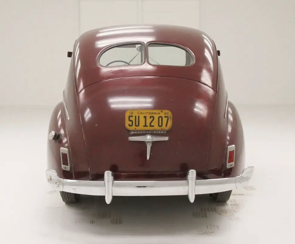 The overall designs they are-a-changin' with disappearing running boards, integrated teardrop headlights in the fenders, a belt line trim spear, simple curved solid bumper complete with optional guards, bulbous fenders, and a rounded sloping down roof line and trunk lid. The beginnings of aerodynamics are in their infancy with the design of this car. The chrome is lightly pitted but still retains its shine and the metal panels are fairly straight. Invasive rust rears its head on the right side of the lower front valance and a few spot in paint repairs are noted throughout the body. A few bars of the grille have broken off and more invasive rust is showing on the rears of the front fenders. The running boards, with their ribbed covers, remain intact and strong, doing a fine job of connecting the graceful pontoon fenders. All of this steel is bathed in a classic hue of maroon, which has areas of light application and some notable chipping. Deeply treaded 16-inch pie crust wide whites are wrapping the maroon steel wheels with chrome beauty rings and dog dish chromed centers. The 1940's have started off with a bang.