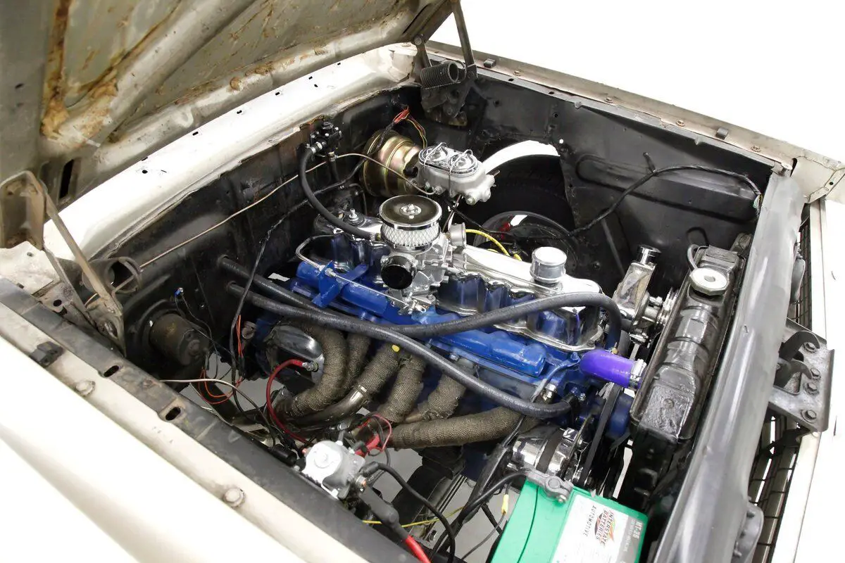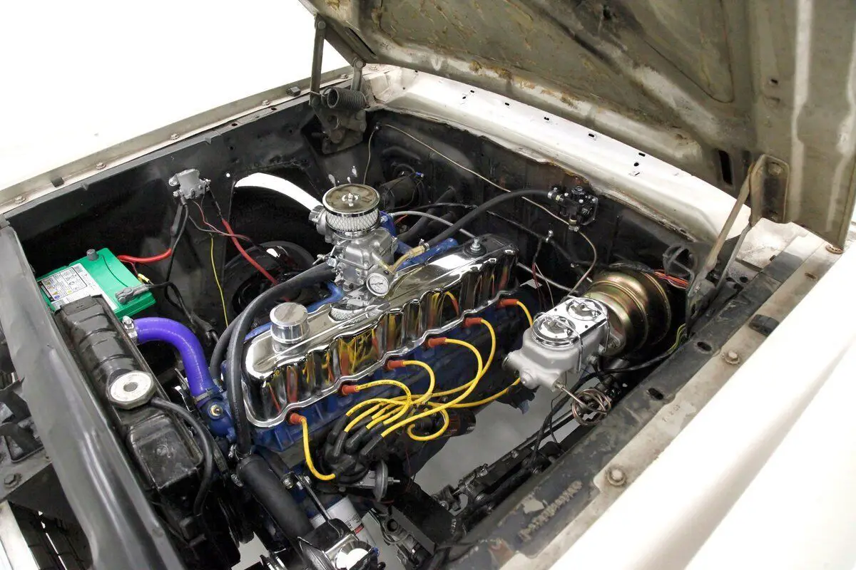 A flip of the hood and we see a fully restored and gleaming engine bay. Inserted is the fully restored and chromed accented 200ci inline 6 cylinder mill. This has a 1 barrel carburetor, new wiring, and some colorful intake and exhaust manifolds as well as a purple hose for the radiator. A shiny master cylinder is on and a small round open air filter is covering the 1 barrel carb. On the back is a rebuilt C4 3-speed automatic transmission with a conventional 2.83 gear ratio rear axle. All this is looking good under this hood.