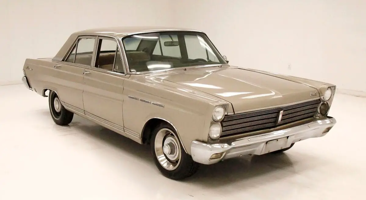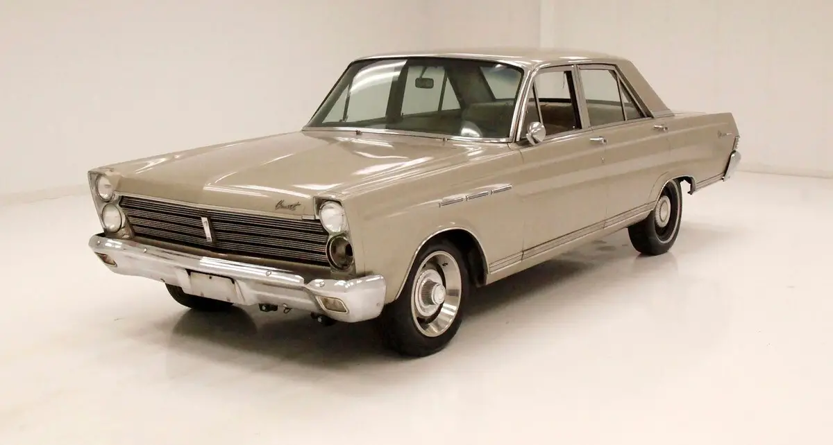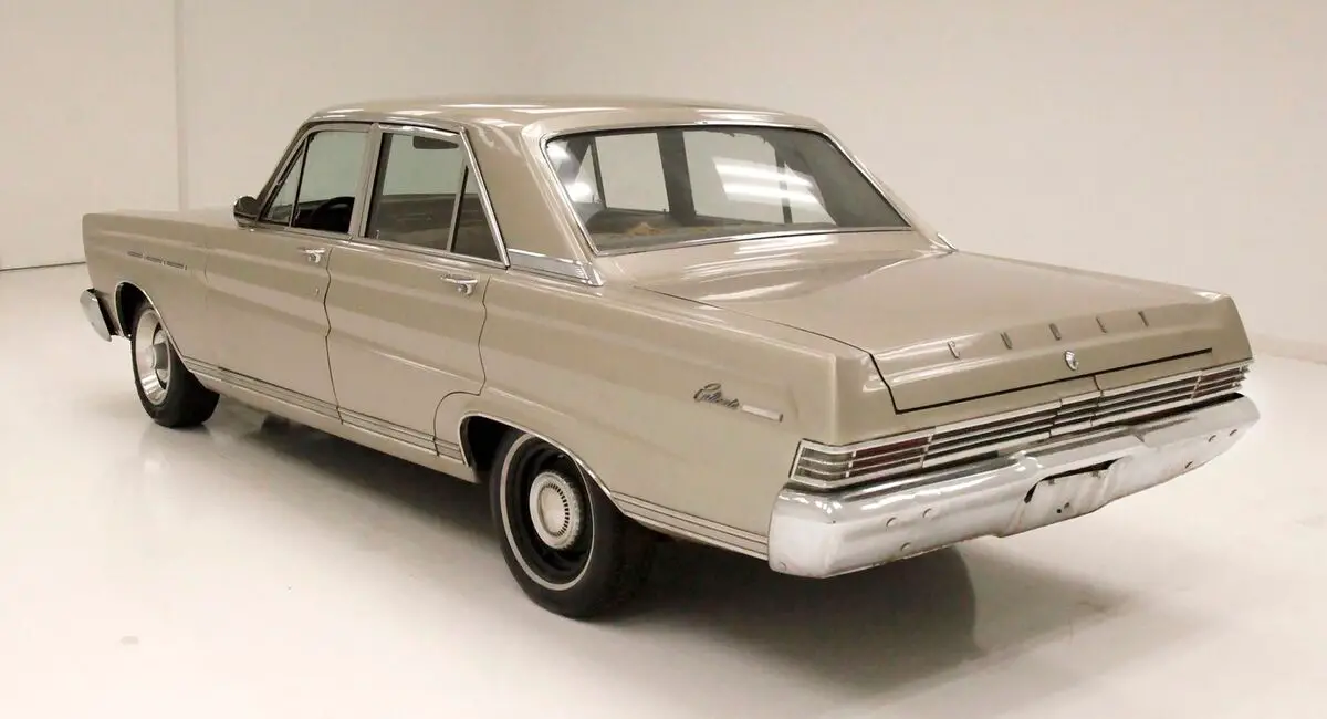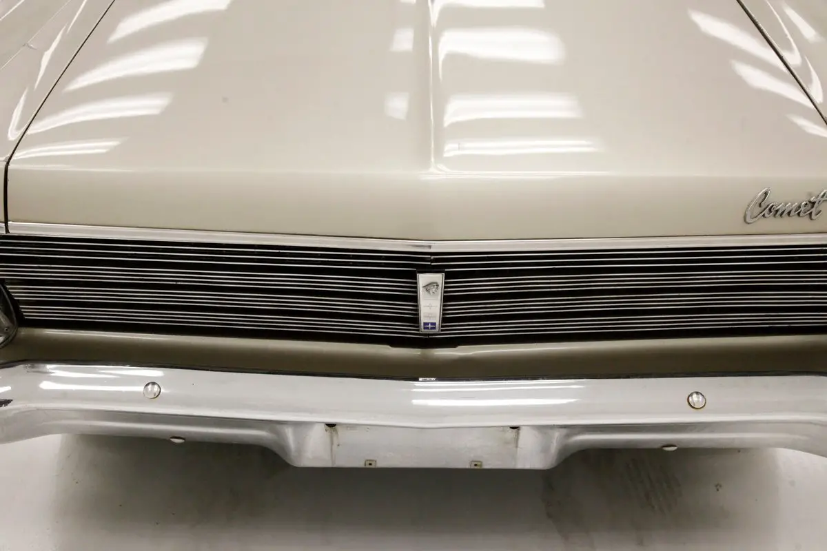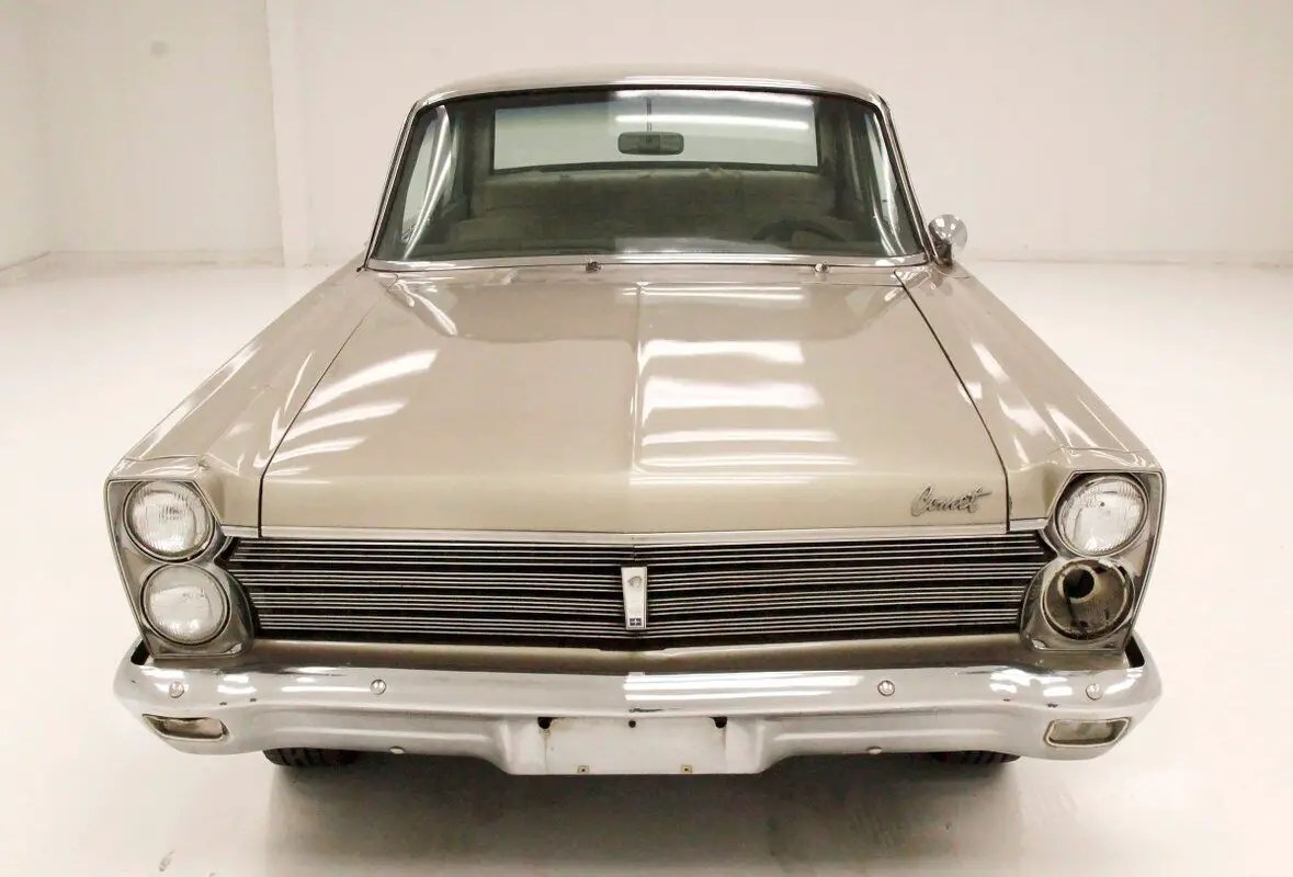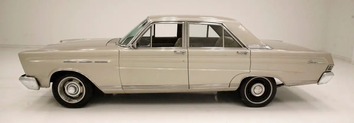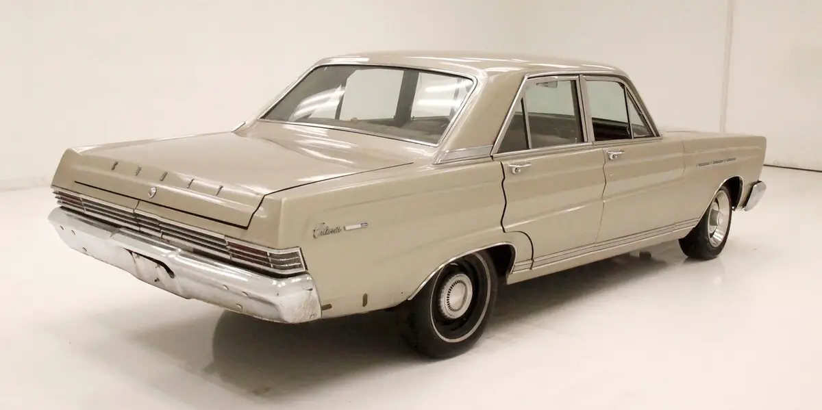 For consignment, an in progress of restoration version of the 1965 Mercury Comet in Caliente Trim. The drivetrain has been completed with a total rebuild, reinforced frame rails are on, along with a Mustang II front end, Wilwood brakes, and new wiring and electrics. Exterior Reminiscent of the Pontiac's of the day, this starts out with dual stacked headlamps and a horizontal shaver grille. The bumper below is showing some areas where water drips can be noted and is somewhat dirty. A headlight is missing. All steel with several dents and dings, and gaps which will need attention for perfection. In the front quarter is a trio of faux vents in chrome trimming and all trimmings surrounding passenger's glass is on this car. Badging is correct, and in the back, the trunk deck wraps around the back of the car ending in a horizontal stainless ribbed trimming and tail lighting on either corner within the ribs. Another bumper with some beginnings of rust is seen on the back. The car is painted in the factory light beige metallic which is worn, has some rust areas and chips with rust in the gaps. Interior Mercury meant upscale, and it's not a Ford for sure! The door panels lead us off with upper gold/beige vinyl sills which have several delineating thin chrome trims to separate the various panels. A lighter beige in a faux leather coloring makes up the rear of the panels, and badging interior lighting shiny cranks and actuator and even a vertical framed in chrome panel of wood appliqué is on the front of the door panel. This leads us to the interior where we have a broadcloth insert full bench. The broadcloth is similar to the doors with just a hint of pattern and plenty of stitching on the panels and even some chromed badges in the center. These seats, ( a rear bench too), show wear and some tears. Beige vinyl piping and smooth darker beige bolster are on and in good condition. The original dash is fronted by a RAS rally steering wheel. The dash has a padded upper in darker beige, and wood appliqué with some metal accenting to house the gauges, and radio as it stretches across the front. Black carpeting is now in the floors and is fairly clean. A light beige headliner is above and shows some water staining, but remains tight. Drivetrain A flip of the hood and we see a fully restored and gleaming engine bay. Inserted is the fully restored and chromed accented 200ci inline 6 cylinder mill. This has a 1 barrel carburetor, new wiring, and some colorful intake and exhaust manifolds as well as a purple hose for the radiator. A shiny master cylinder is on and a small round open air filter is covering the 1 barrel carb. On the back is a rebuilt C4 3-speed automatic transmission with a conventional 2.83 gear ratio rear axle. All this is looking good under this hood. Undercarriage A new fuel tank resides in an otherwise patina and surface rusted undercarriage. It is structurally sound underneath but the rust persists throughout. One can easily view the new parts recently put on within the patina and surface rust. Floor pans are solid and painted black. A Mustang II front end is now on and leaf springs for the back are original. Power Wilwood front disc brakes are on and these have slotted rotors. Power drums are on back, and these brakes have all new lines and master cylinder. Headers are emanating from the exhaust ports on the mill. These end up as cutoff pipes just next to the transmission. There are no mufflers on this car. Drive-Ability While our consignor states this car runs well we made no attempt to start the car. The driveshaft has been removed and tape is over the tailshaft. An in the middle of a restoration project with the mechanicals all buttoned up and working great, it just needs cosmetic work on the steel exterior, and some interior seat restoration. An interesting not oft seen model in our Hallowed Halls, and worth a look, as most of the hard work has been completed. And you can drive it while you are working on it! 5T22T560754 5-1965 T-Metuchen, NJ Assy Plant 22-Comet Caliente 4 Door Sedan T-200ci Inline 6 Cylinder 560754-Sequential Unit Number