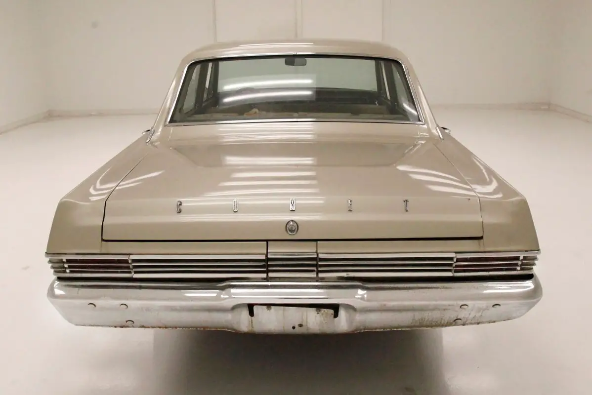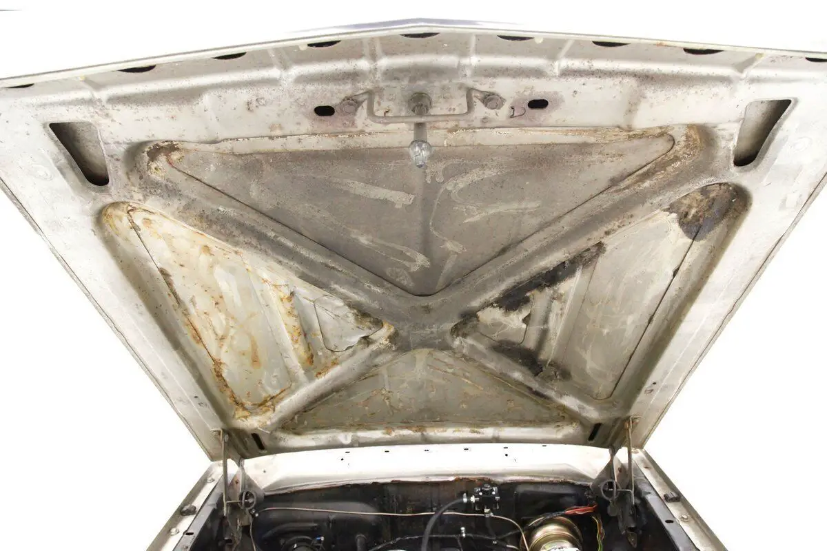 Reminiscent of the Pontiac's of the day, this starts out with dual stacked headlamps and a horizontal shaver grille. The bumper below is showing some areas where water drips can be noted and is somewhat dirty. A headlight is missing. All steel with several dents and dings, and gaps which will need attention for perfection. In the front quarter is a trio of faux vents in chrome trimming and all trimmings surrounding passenger's glass is on this car. Badging is correct, and in the back, the trunk deck wraps around the back of the car ending in a horizontal stainless ribbed trimming and tail lighting on either corner within the ribs. Another bumper with some beginnings of rust is seen on the back. The car is painted in the factory light beige metallic which is worn, has some rust areas and chips with rust in the gaps.