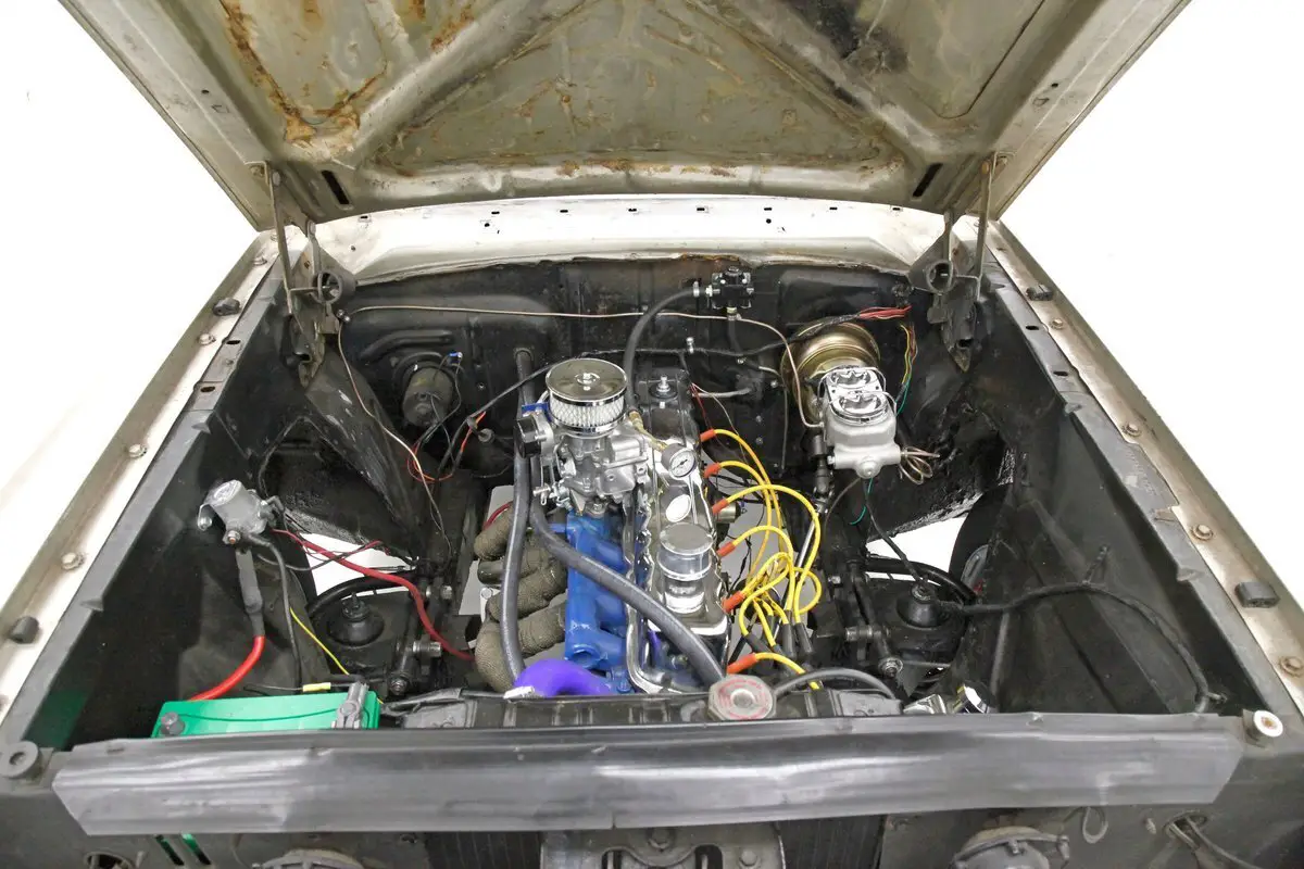 A new fuel tank resides in an otherwise patina and surface rusted undercarriage. It is structurally sound underneath but the rust persists throughout. One can easily view the new parts recently put on within the patina and surface rust. Floor pans are solid and painted black. A Mustang II front end is now on and leaf springs for the back are original. Power Wilwood front disc brakes are on and these have slotted rotors. Power drums are on back, and these brakes have all new lines and master cylinder. Headers are emanating from the exhaust ports on the mill. These end up as cutoff pipes just next to the transmission. There are no mufflers on this car.