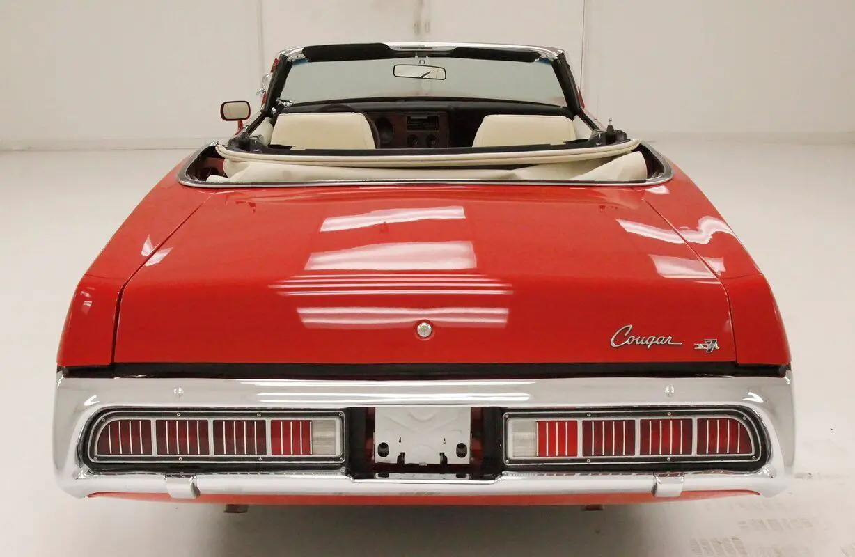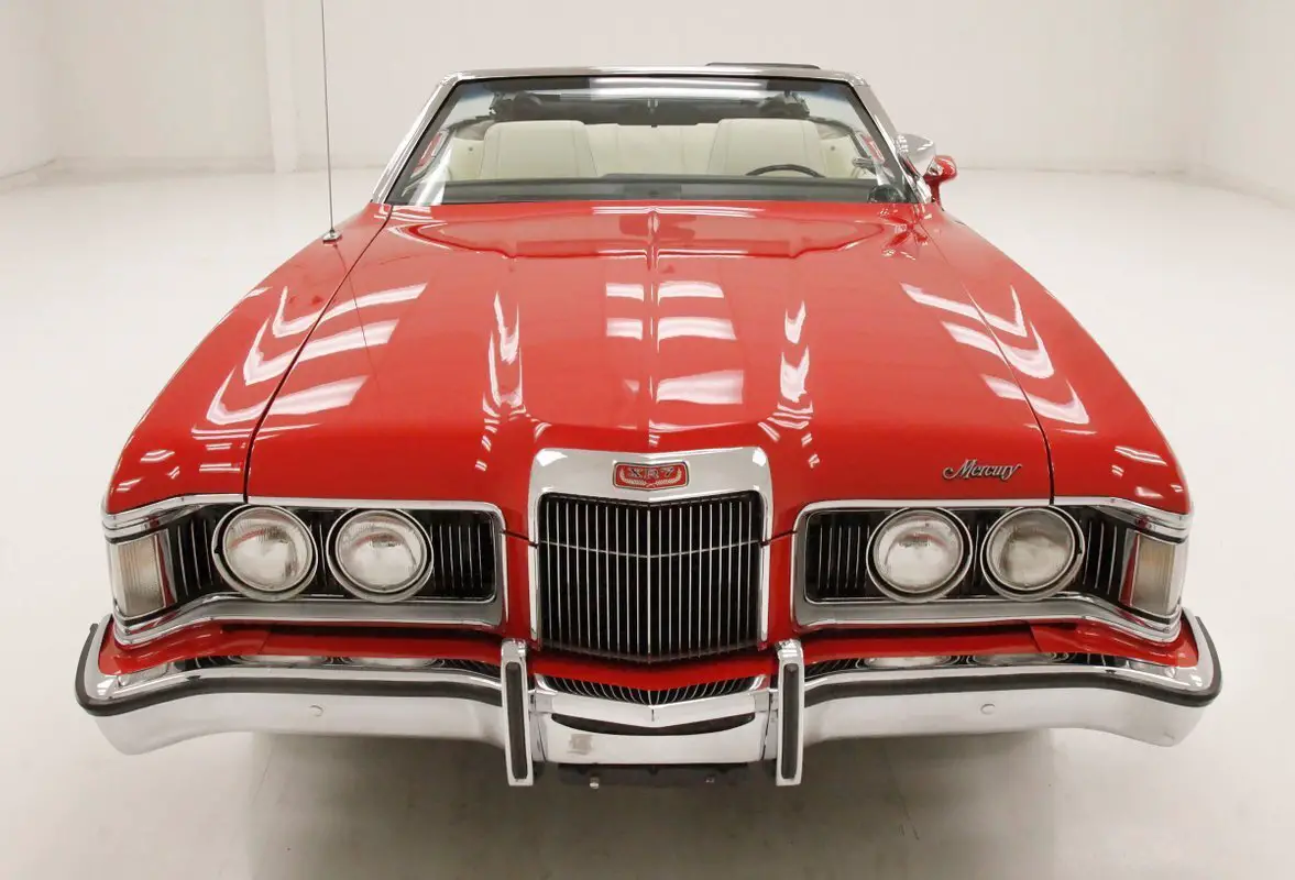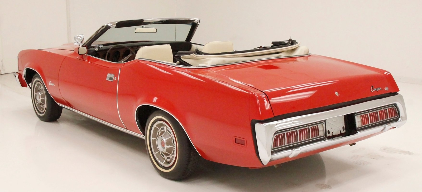 The Cougar is quite different from the Mustang in the realm of styling and for 1973 the two platform shared cars split further apart in theory and style. Leading the way is the adopted from other Mercury vehicles split grille treatment with a prominent center section and waterfall style grille. In a break from the previous generation, 4 exposed headlights replace the hidden headlights of yore. At the rear, inset into the bumper, are ribbed and trim highlighted sequential tail lights. A respray of Bright Red covers the panels which show a few inclusions and flaws, but one must look closely to find them. Rust is nonexistent and the gaps remain well minded. A newer white canvas convertible top with a glass rear window is now on and is tear and leak free. Chrome bumpers and all trim retains its shine and shows very little wear. Dual exhaust with turn down chromed tips peek out the back at the bottom of the chassis. Standard 14" Mercury wheel covers adorn the 4 corners and are wrapped in deeply treaded whitewall radials. Cue the cat growling.