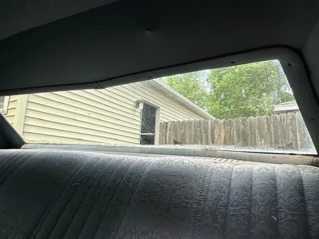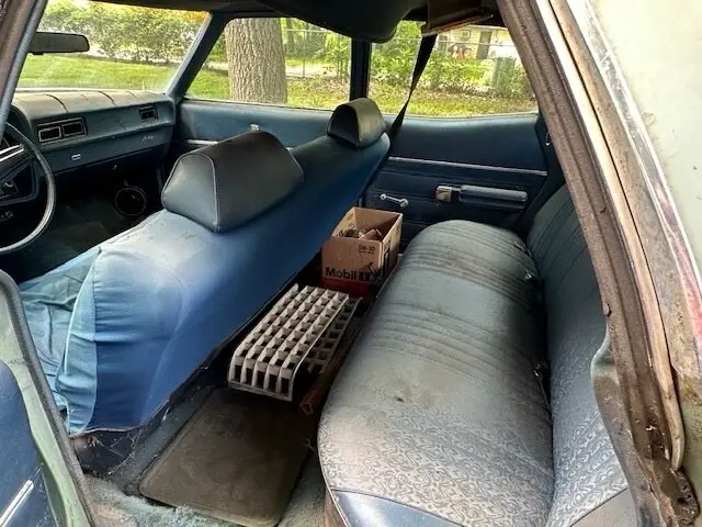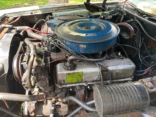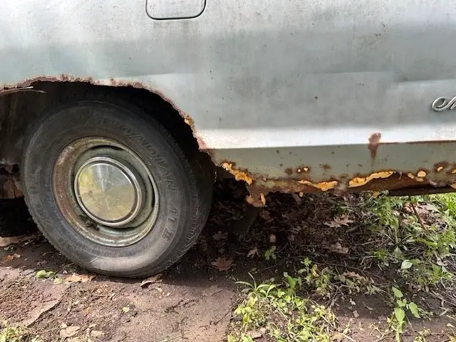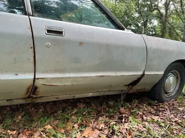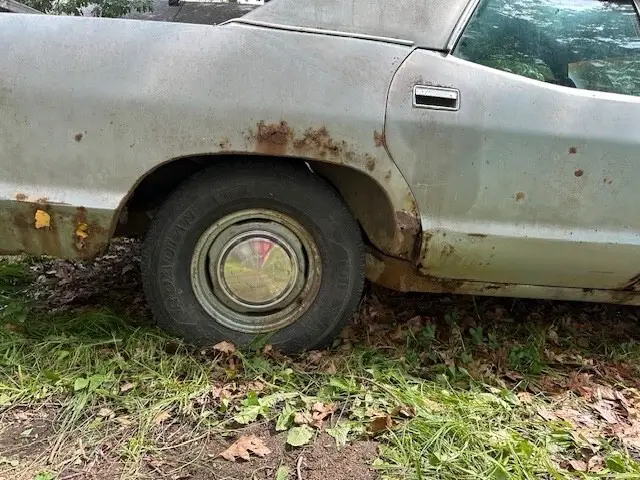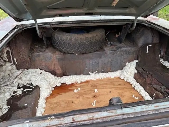 Body rust on quarter panels, passenger door, rear frame, left rear bumper mount rusted apart, trunk floor is rusted out. Hood release cable is broken. Needs brakes and fuel service to run. Tires rotate. Vehicle has been stored outside for 25 years.