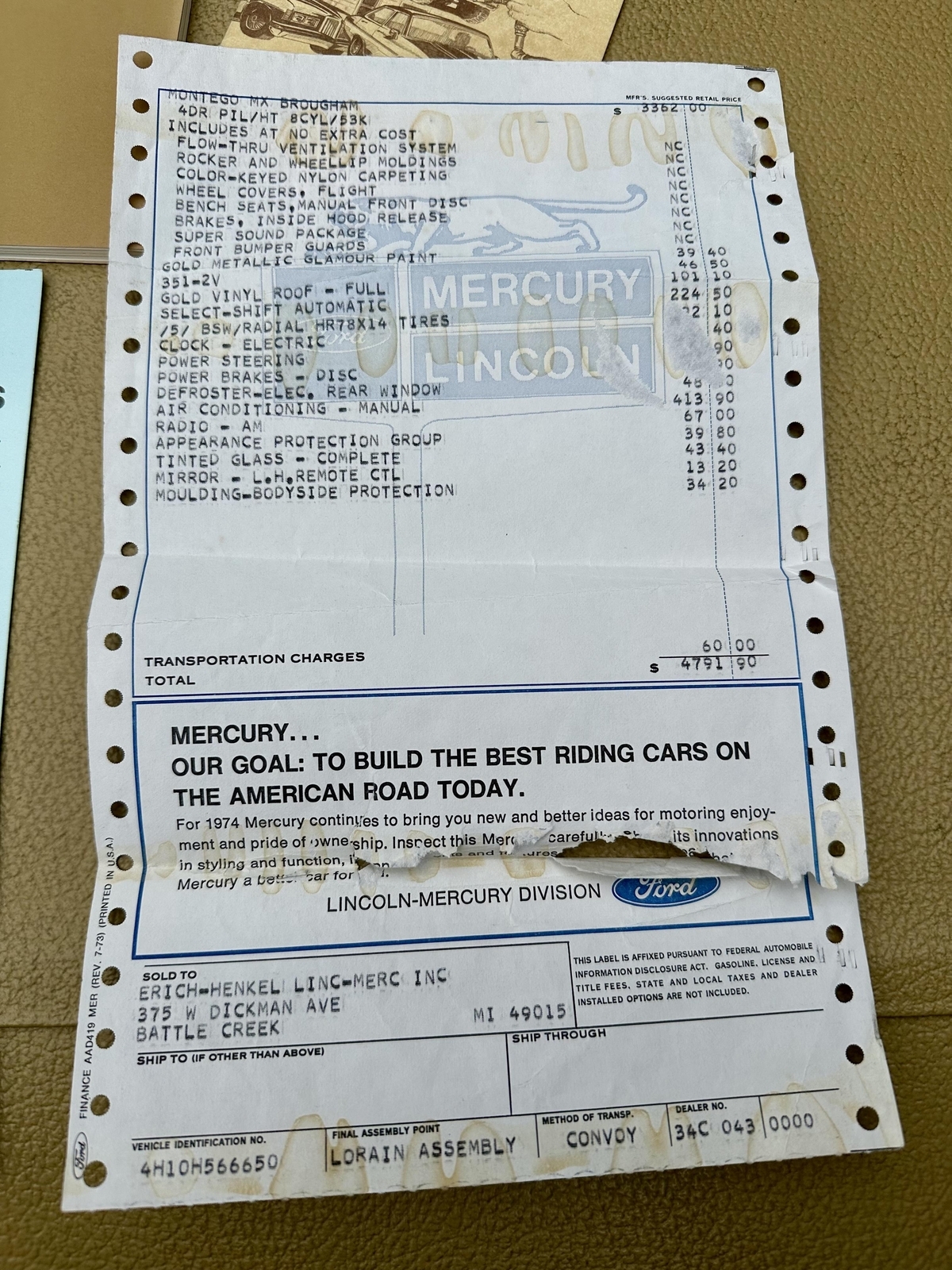 This exceptional one-owner 1974 Mercury Montego MX Brougham was purchased new from Erich-Henkel Lincoln Mercury in Battle Creek, Michigan by Keith Laverne and John William Harvey. The car was sparingly driven and currently shows only 10,628 original miles. It has been preserved in remarkable condition, having spent its entire life in controlled indoor storage under the care of the original family. It even retains its original tires, which further confirms the authenticity of the mileage. This is a true time capsuleâÂÂa legitimate âÂÂcream puffâÂÂâÂÂand one of the cleanest examples youâÂÂre likely to find. The car was dealer undercoated when new, further protecting its pristine condition. After sitting in storage for years, we serviced the fuel system with a new fuel tank and pump, changed the oil, and brought it back to life. It now runs and drives just like it did when it left the showroom floor.