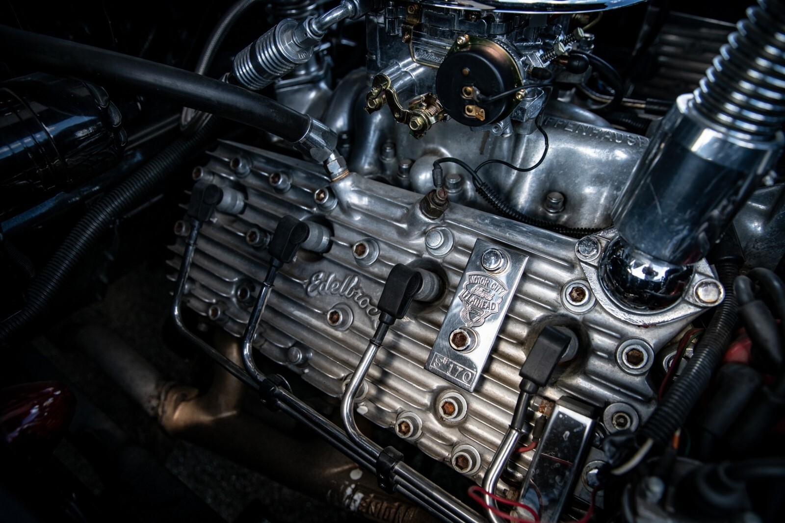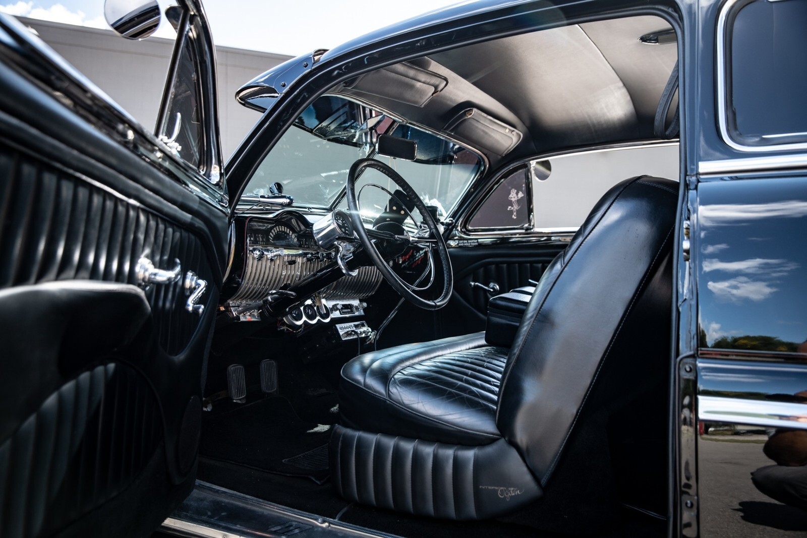 Under the hood lies a professionally built Flathead V8 engine by the renowned Motor City Flatheads, known for their precision engineering and performance expertise. This powerplant is fitted with aluminum Edelbrock heads and a new 4-barrel carburetor, delivering enhanced horsepower and crisp throttle response while maintaining that unmistakable flathead sound. The engine bay has been meticulously detailed, reflecting the same show-quality craftsmanship seen throughout the rest of the car.